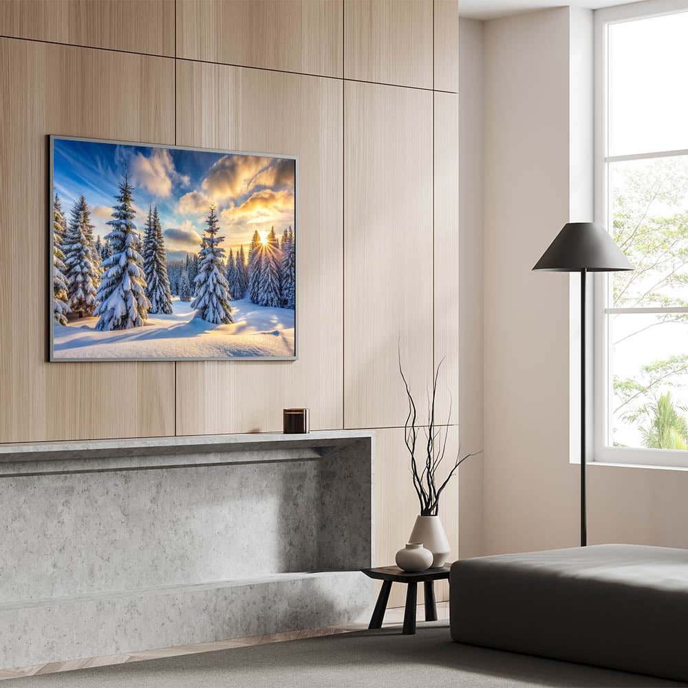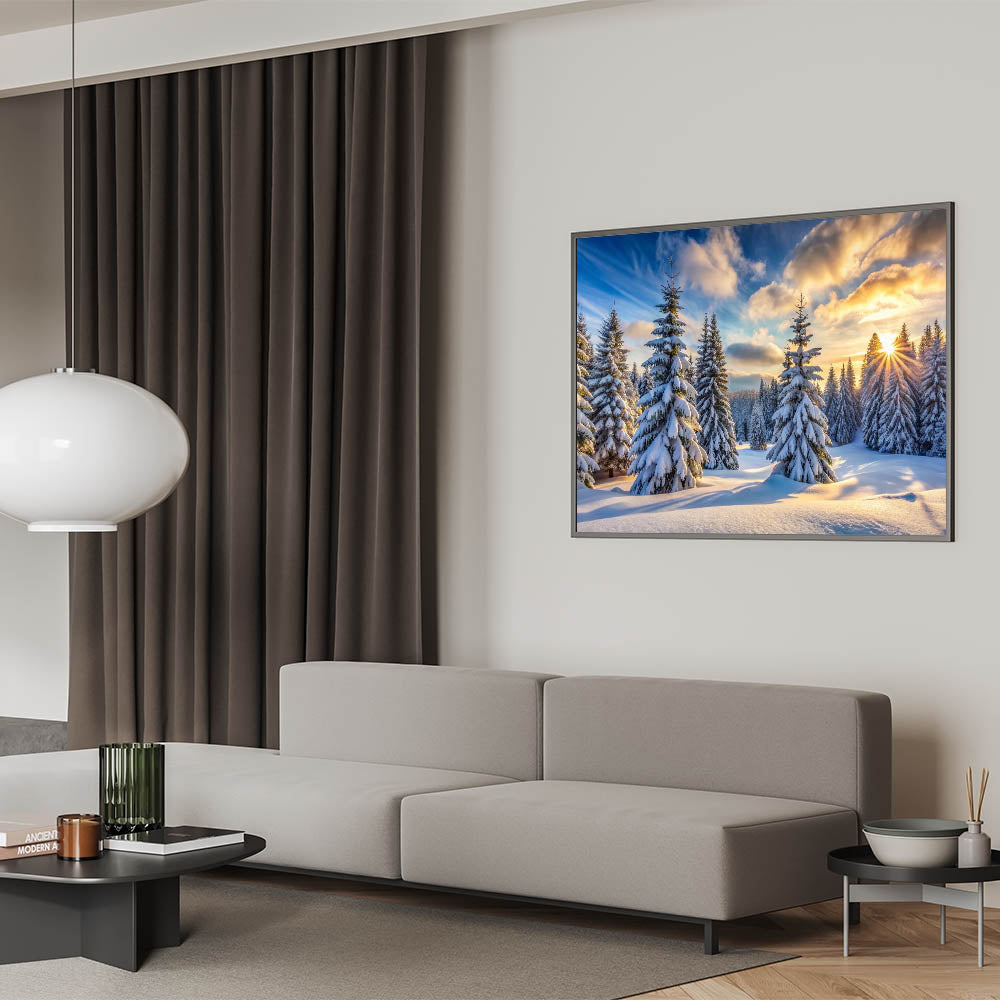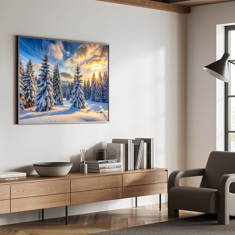 Bring the serene beauty of a winter sunrise into your home with this stunning sunrise winter pines wall art. This artwork captures a breathtaking scene of snow-covered pine trees bathed in the golden light of the rising sun. The vibrant sky, painted in rich hues of blue, orange, and yellow, creates a stunning contrast with the crisp white snow, making this piece a perfect addition to any room.