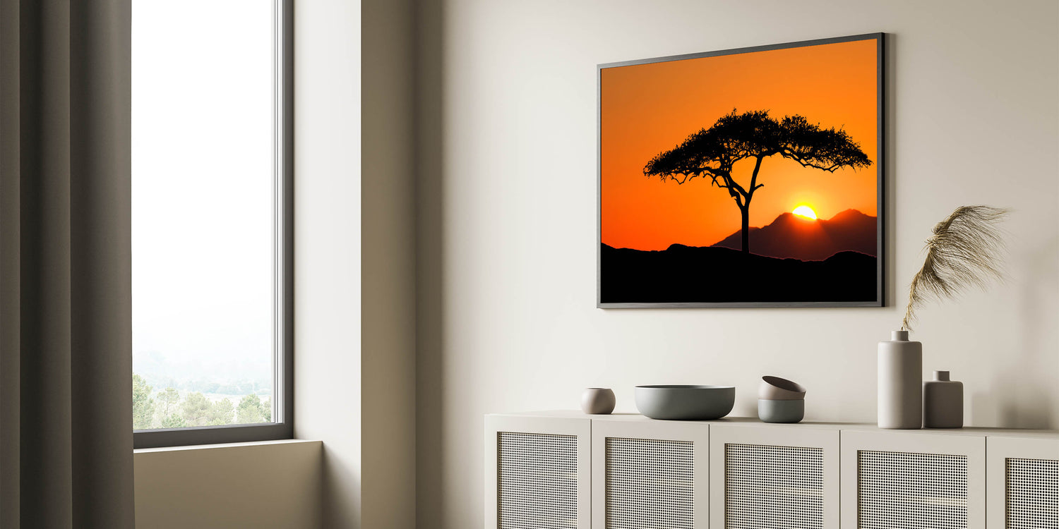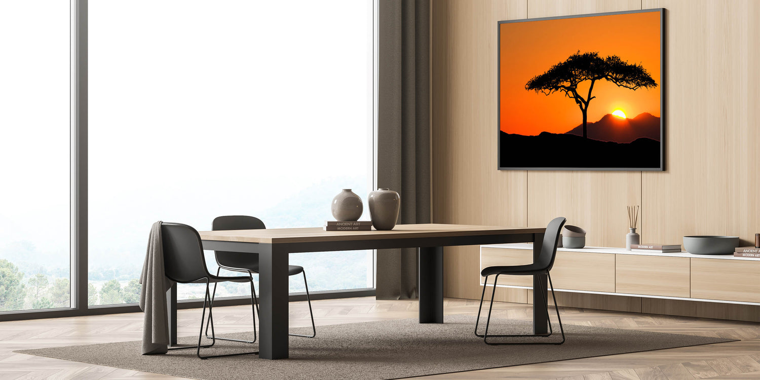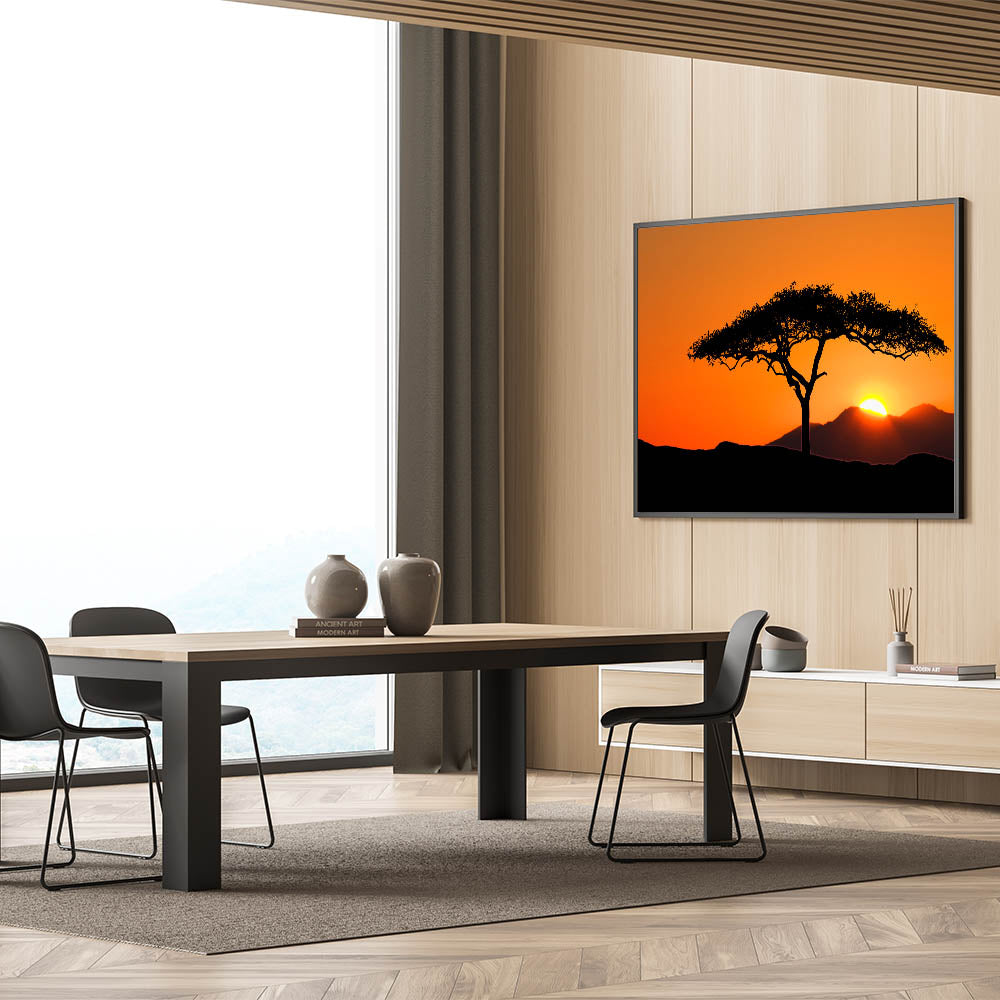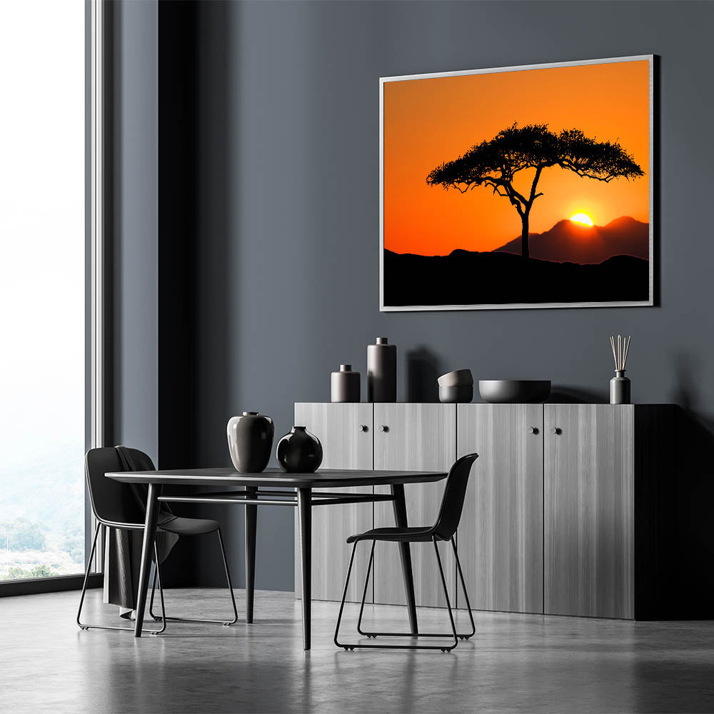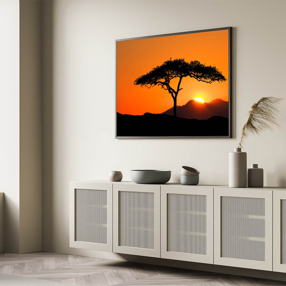 Transform your space with this exquisite tree artwork, perfect for those who appreciate the raw beauty of nature and the dramatic colors of sunset. This piece brings the warmth and majesty of an African landscape into your home, creating a serene and inviting atmosphere.