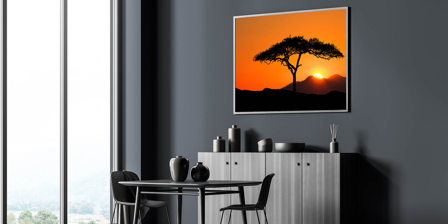 Bring the warmth and beauty of an African sunset into your home with this stunning tree silhouette wall art. This captivating piece features the iconic silhouette of a lone tree set against the vibrant hues of a setting sun, with the mountains in the background adding depth to the scene. The dramatic contrast between the dark silhouette and the fiery sky creates a powerful and eye-catching artwork that is sure to be a focal point in any room.