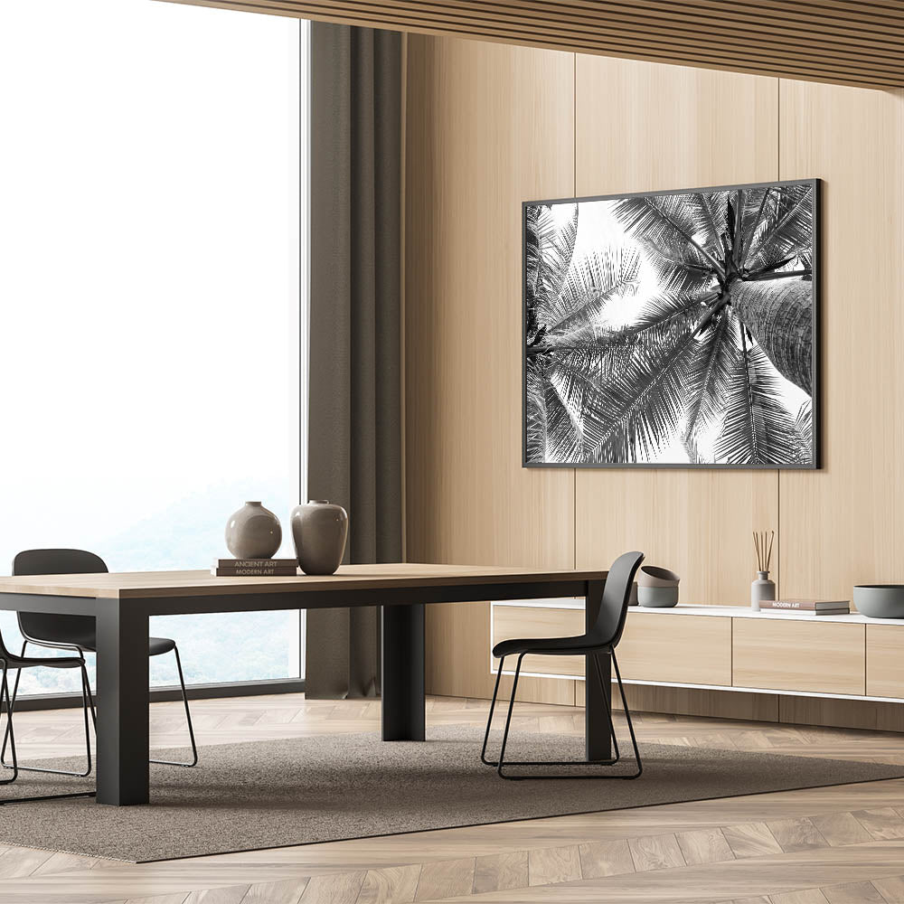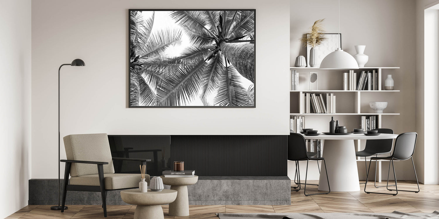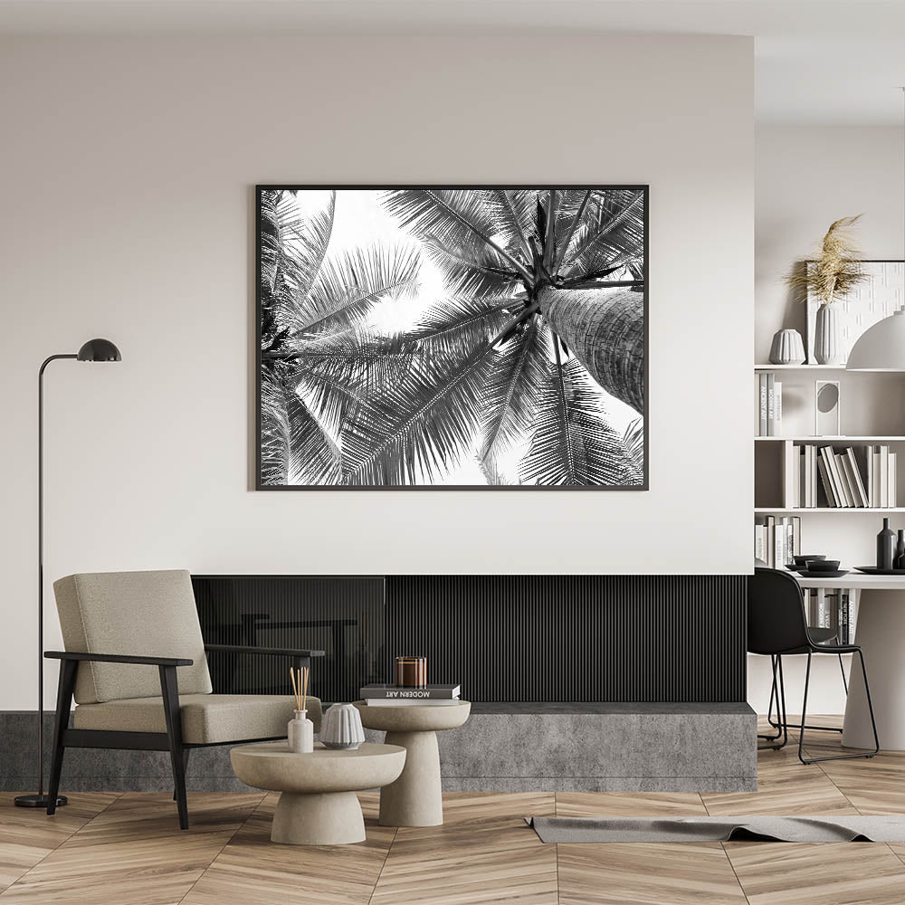 Bring a touch of serene nature into your home with our stunning black and white palm tree wall art. This captivating piece, featuring a unique perspective of palm leaves against the sky, perfectly blends the elegance of botanical art with the tranquility of landscape photography. It's a versatile piece that complements a variety of interior styles, from modern to coastal decor.