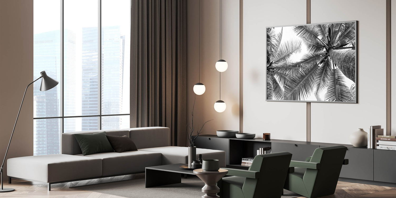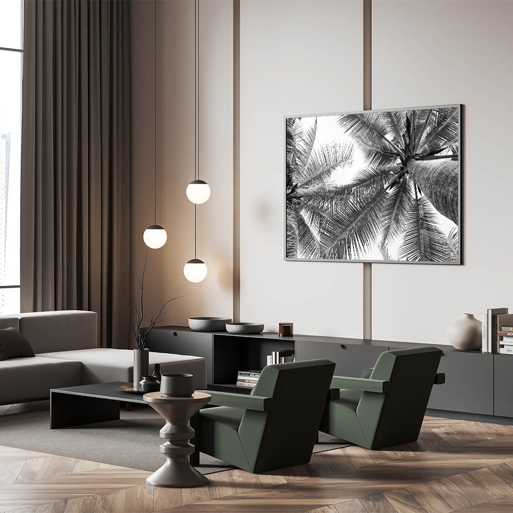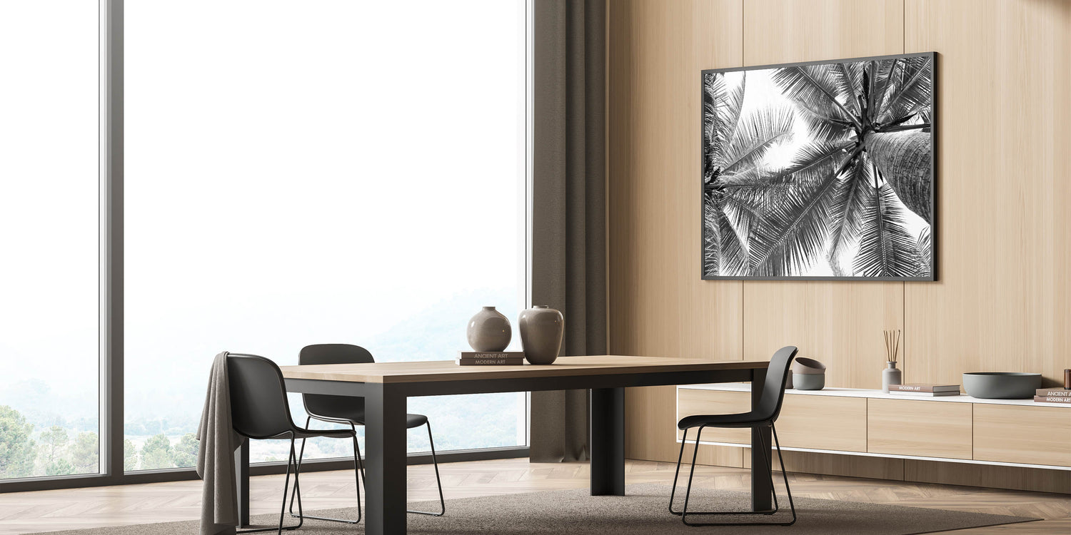Bring a touch of serene nature into your home with our stunning black and white palm tree wall art. This captivating piece, featuring a unique perspective of palm leaves against the sky, perfectly blends the elegance of botanical art with the tranquility of landscape photography. It's a versatile piece that complements a variety of interior styles, from modern to coastal decor.