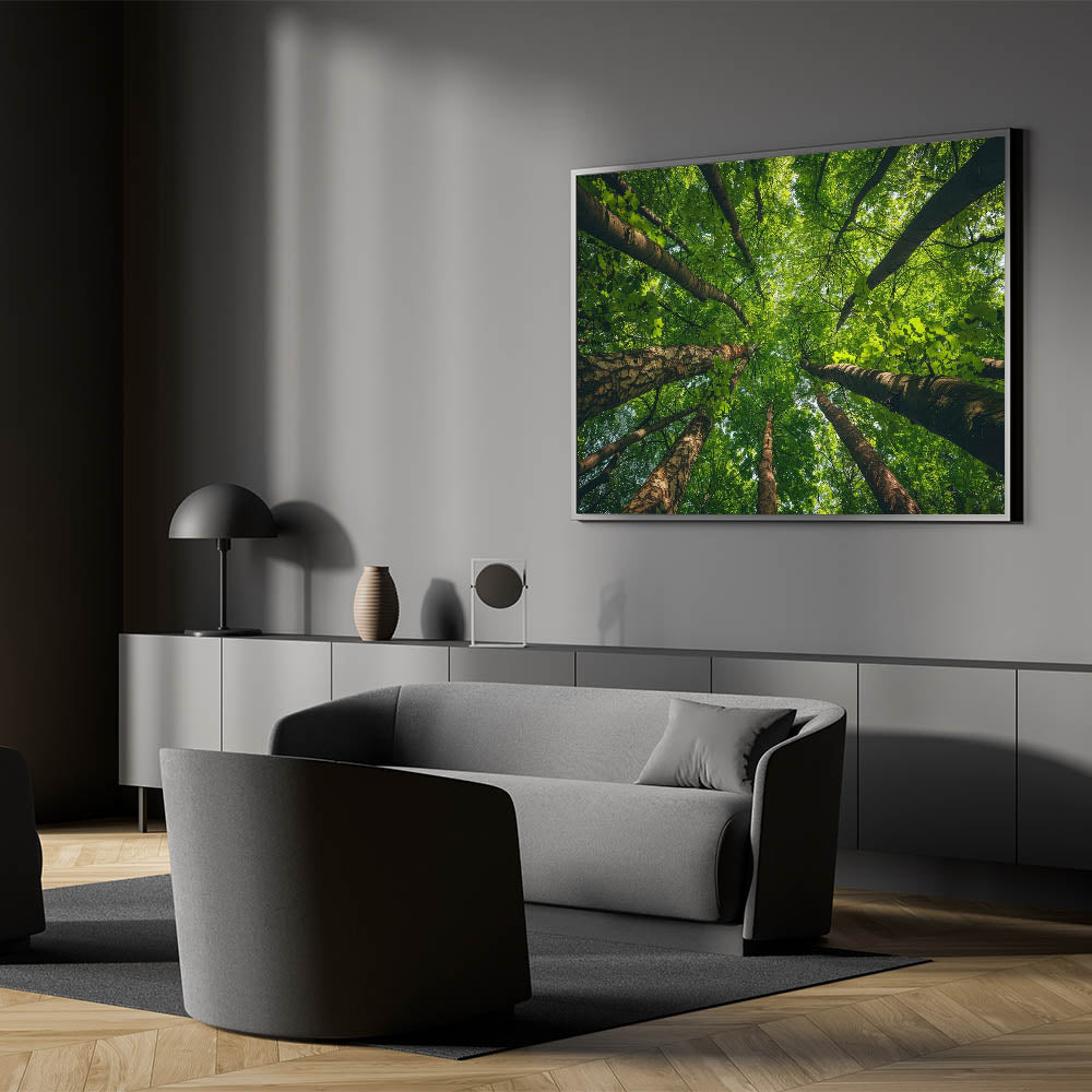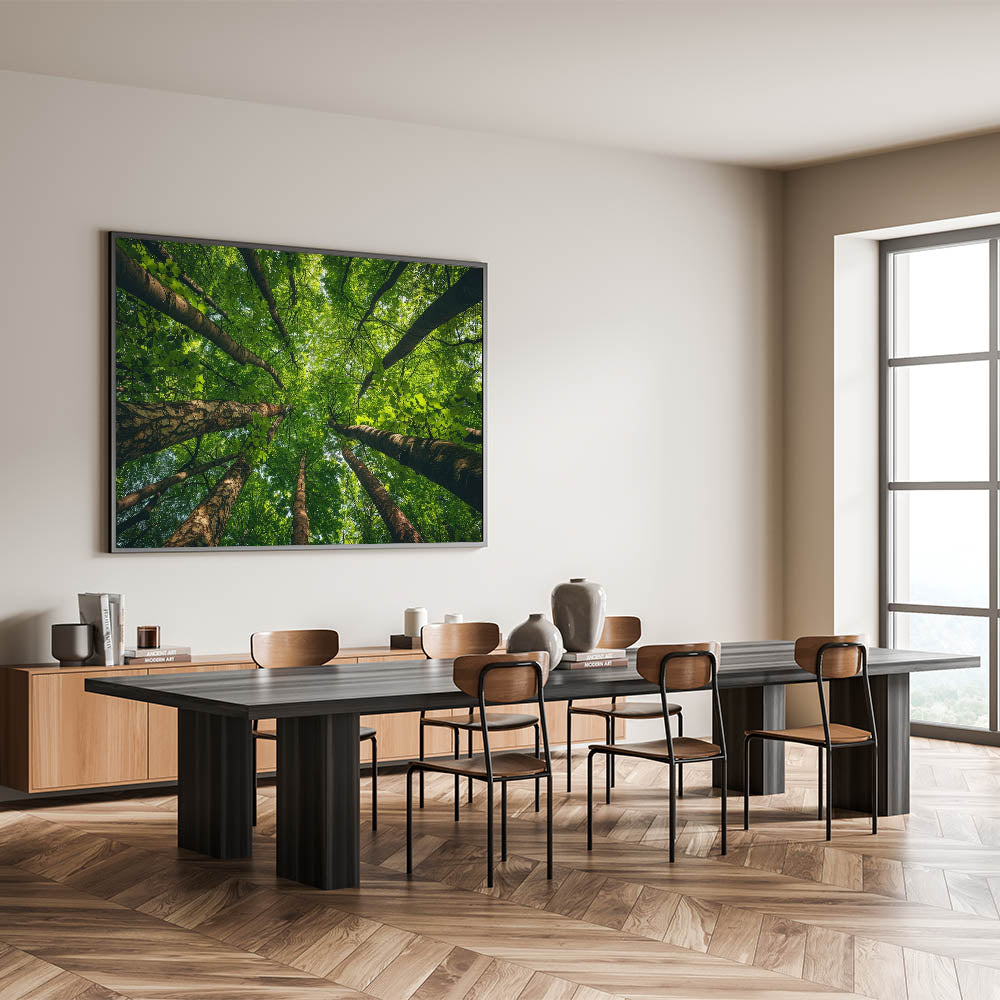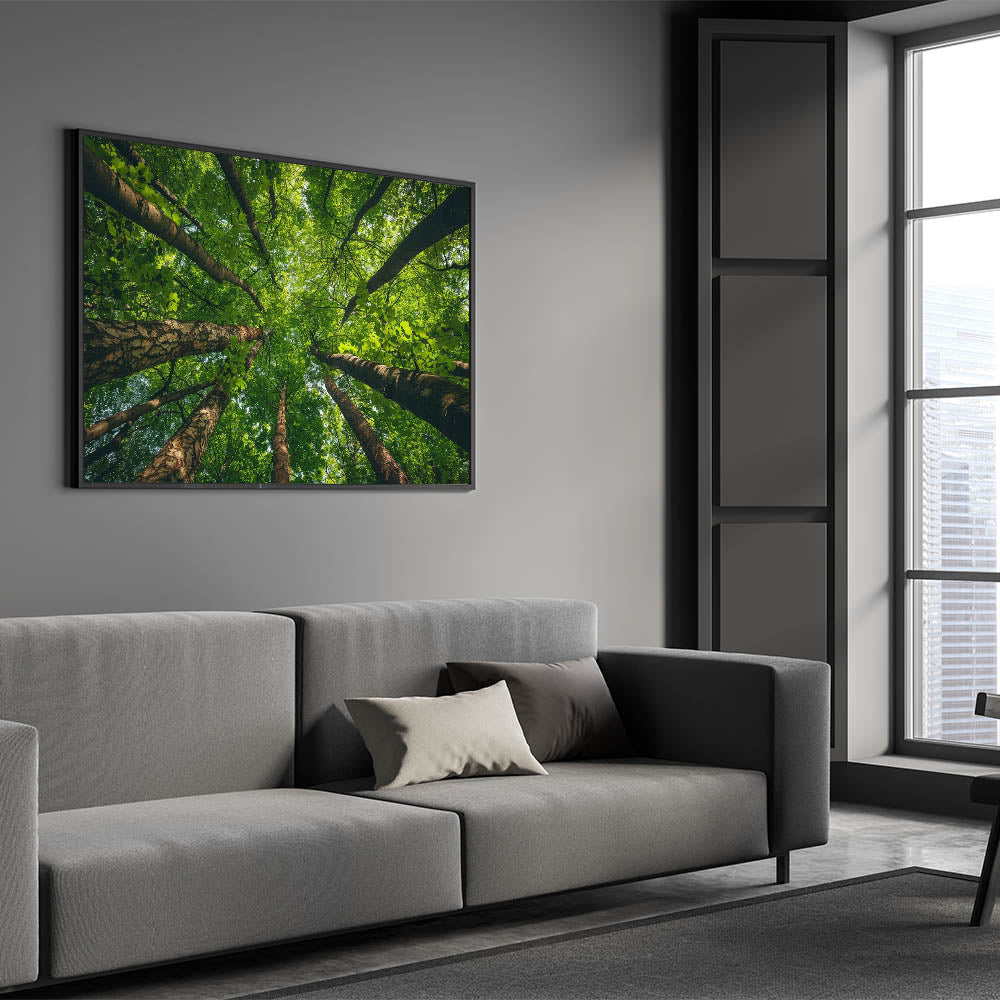 Immerse yourself in the peaceful embrace of nature with this stunning wall art featuring an upward view of a lush green forest canopy. The towering trees and their intricate branches create a mesmerizing pattern against the sky, drawing your gaze upwards and inviting a sense of tranquility and awe. This artwork is perfect for those who seek to bring the calming beauty of the forest into their living space.