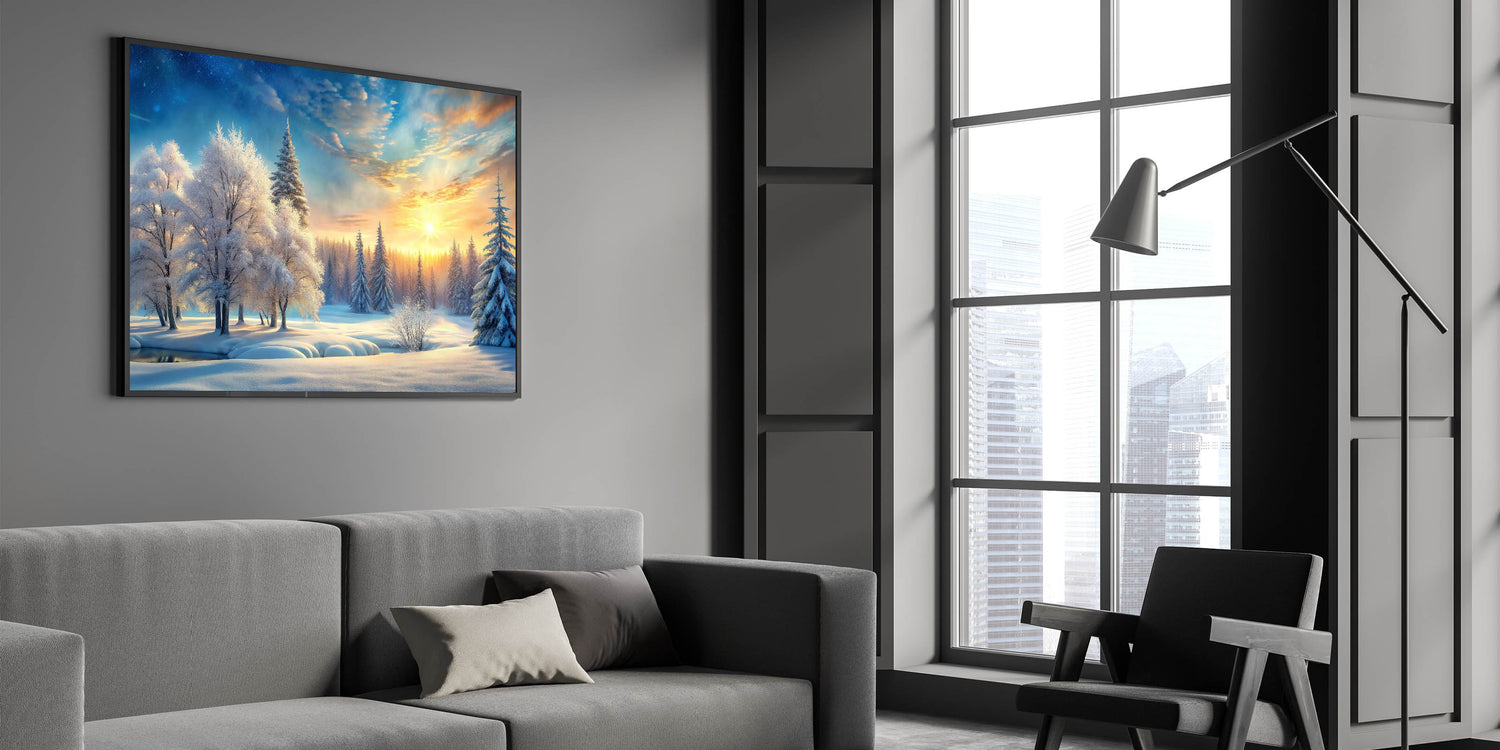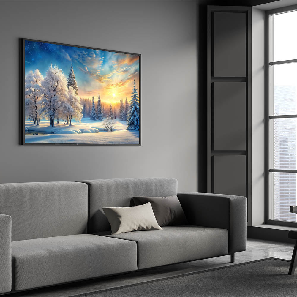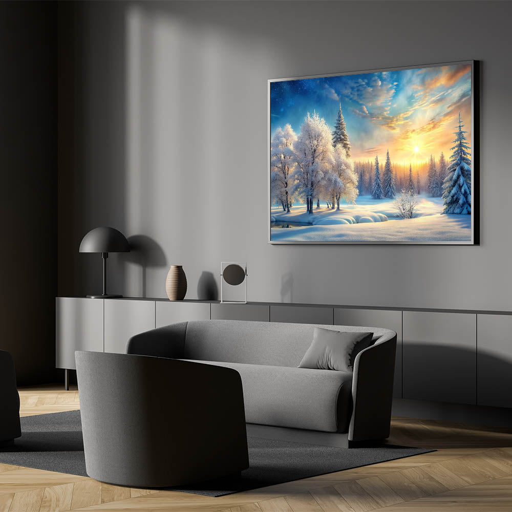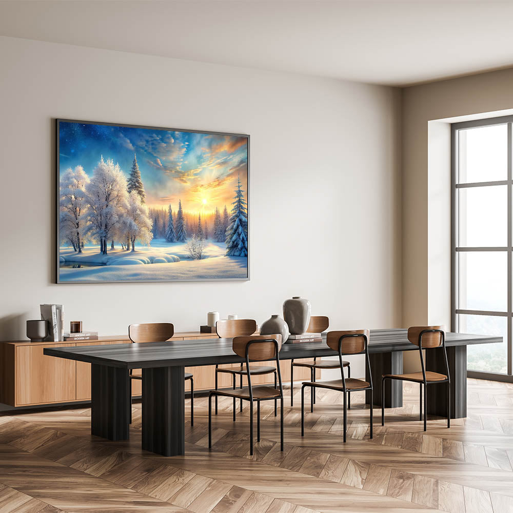 Introduce a serene touch to your home with this stunning winter wonderland tree wall art. Capturing the beauty of a snow-covered landscape bathed in the warm hues of a setting sun, this nature-inspired piece is perfect for adding a tranquil atmosphere to any room. The artwork features frost-kissed trees against a backdrop of vibrant sky tones, blending deep blues with the golden glow of the sun. Ideal for lovers of serene tree landscapes, this piece brings the peacefulness of nature indoors.