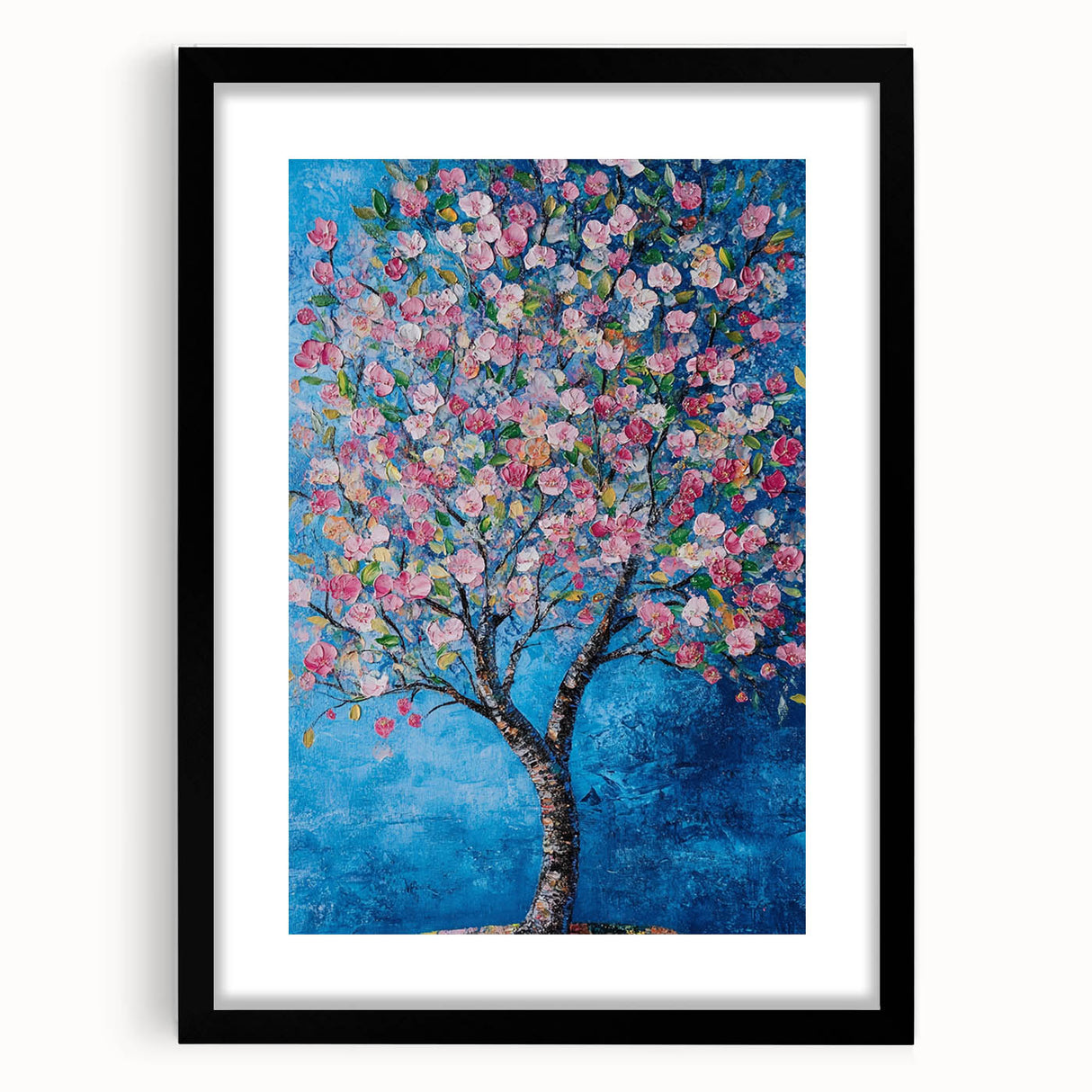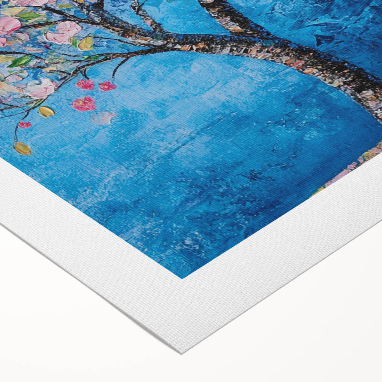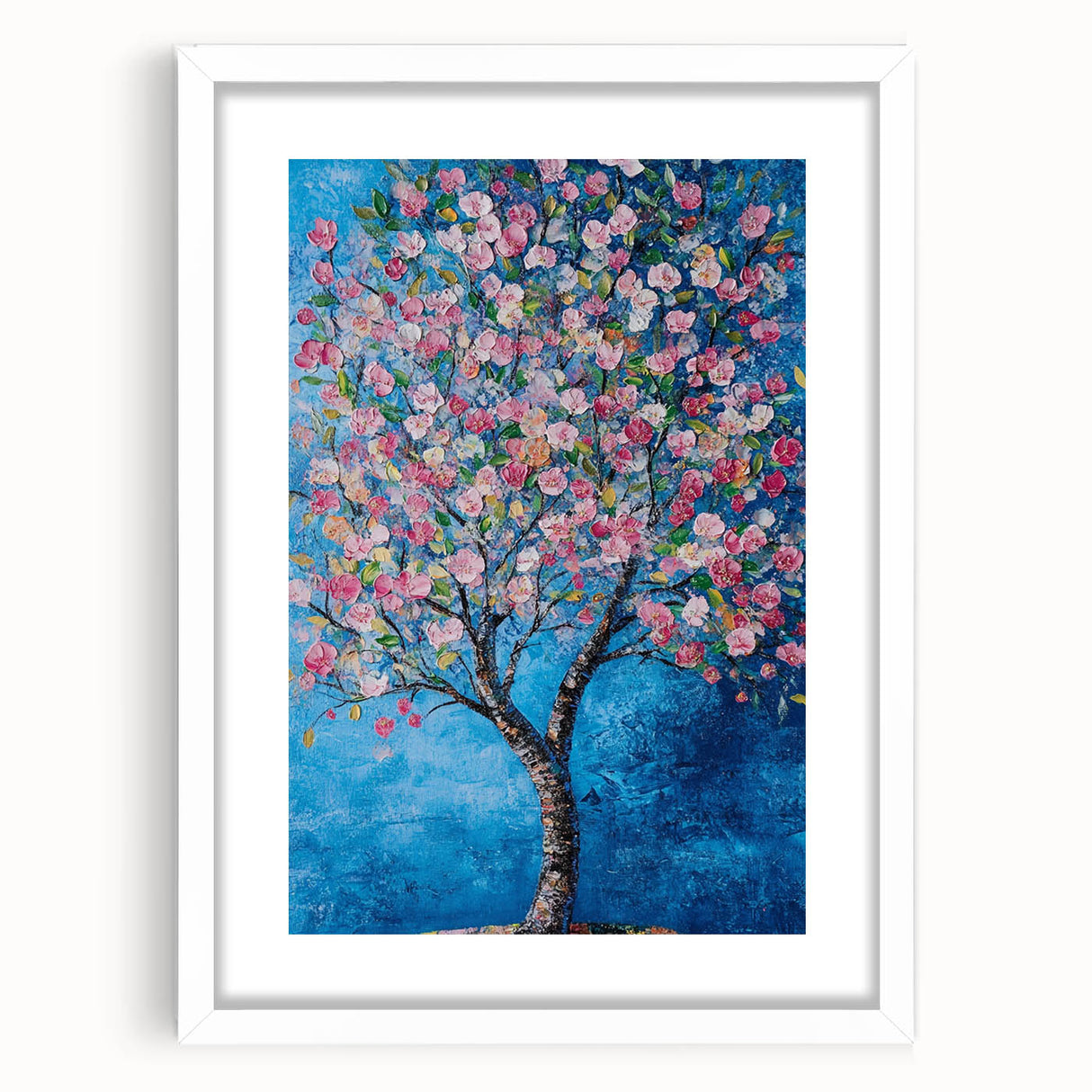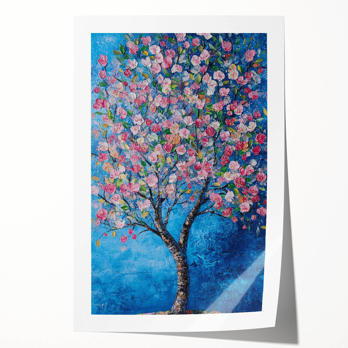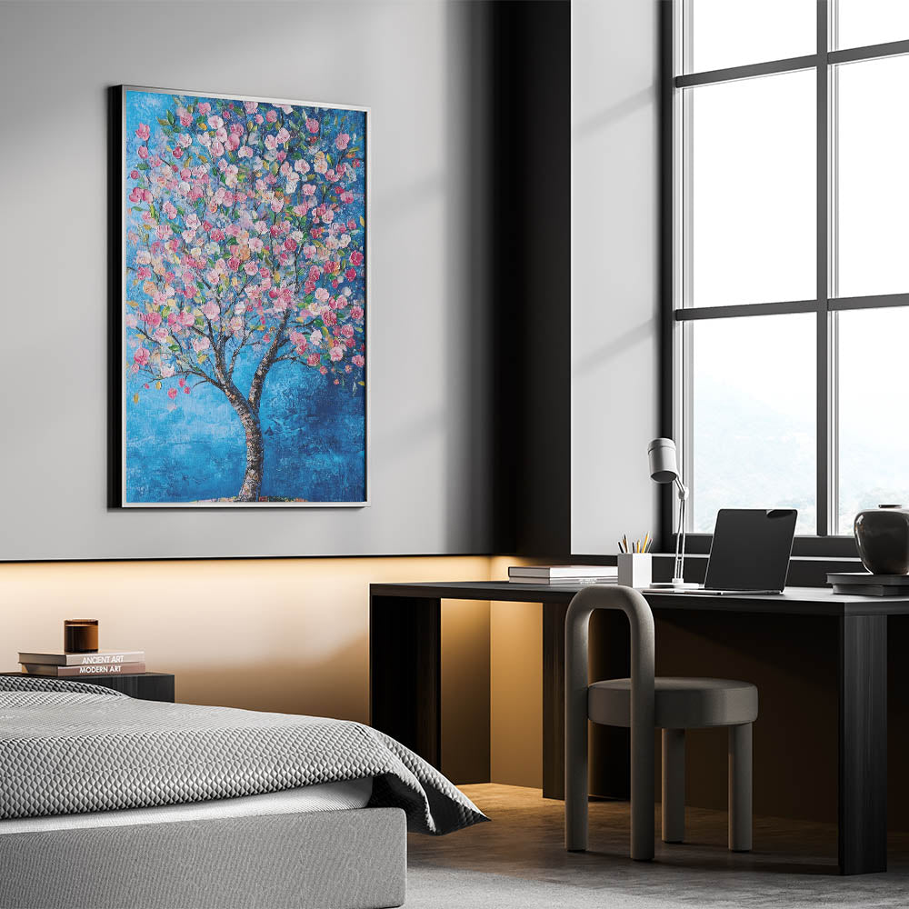 Celebrate the beauty of spring with this breathtaking tree art print, featuring a blooming cherry blossom tree set against a textured, deep blue background. The delicate pink flowers contrast beautifully with the rich blues, creating a nature-inspired wall art piece that brings a sense of renewal and elegance to any space.
