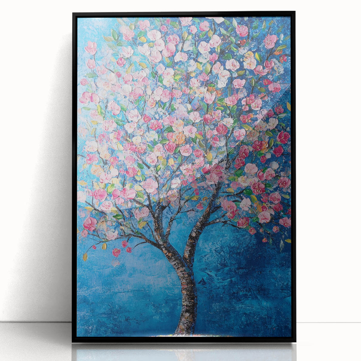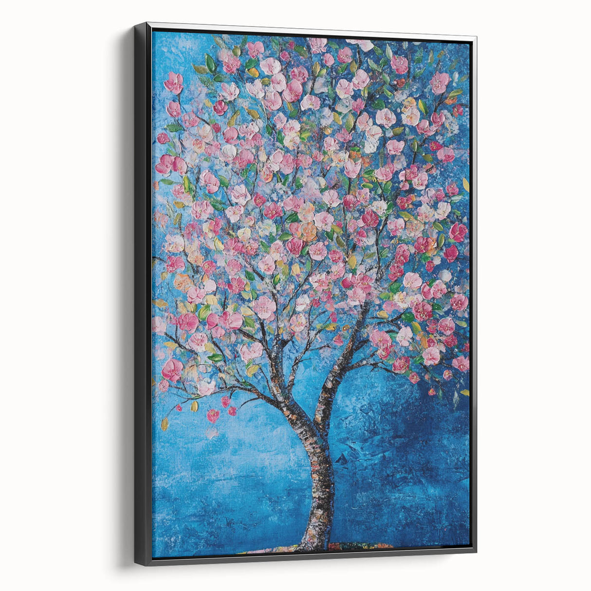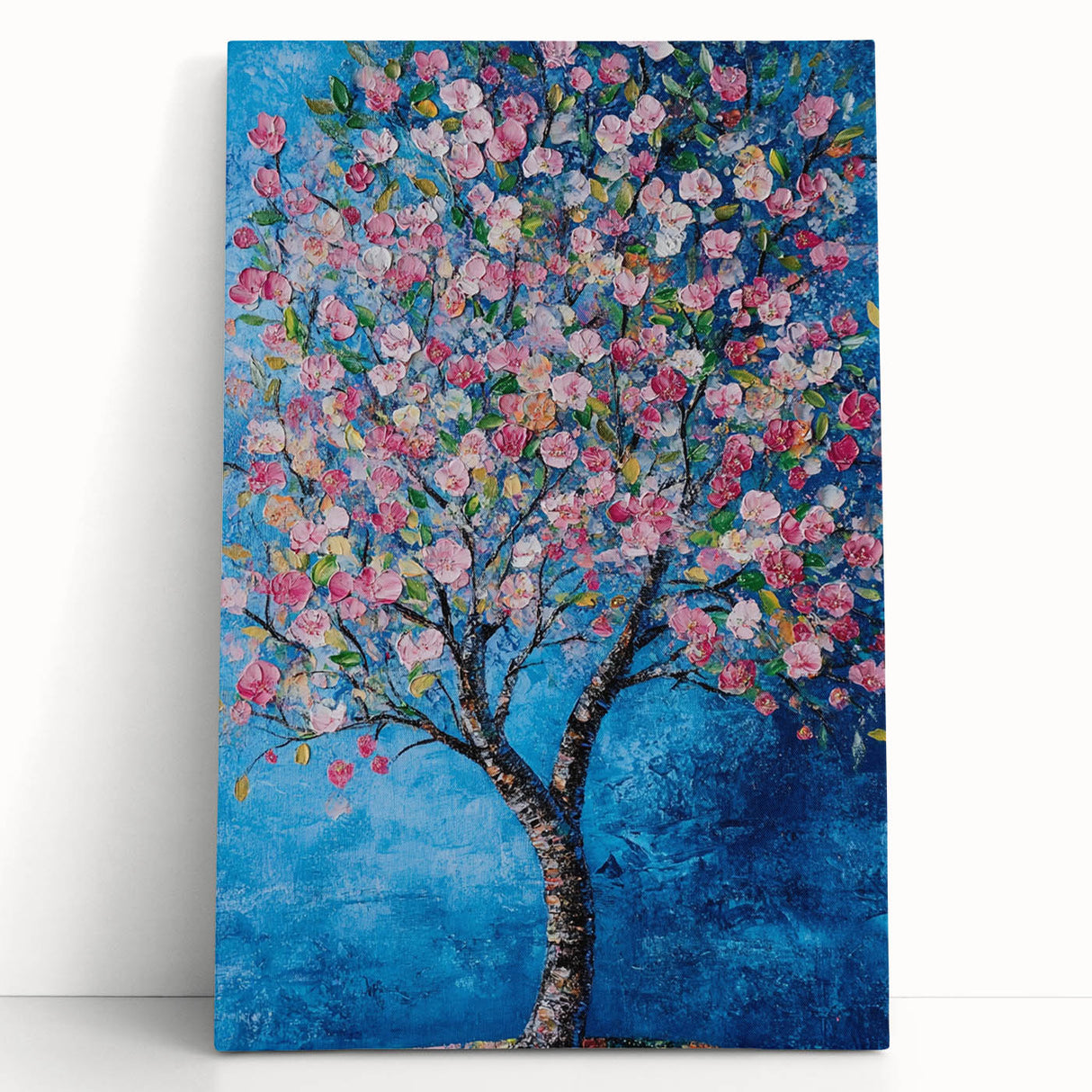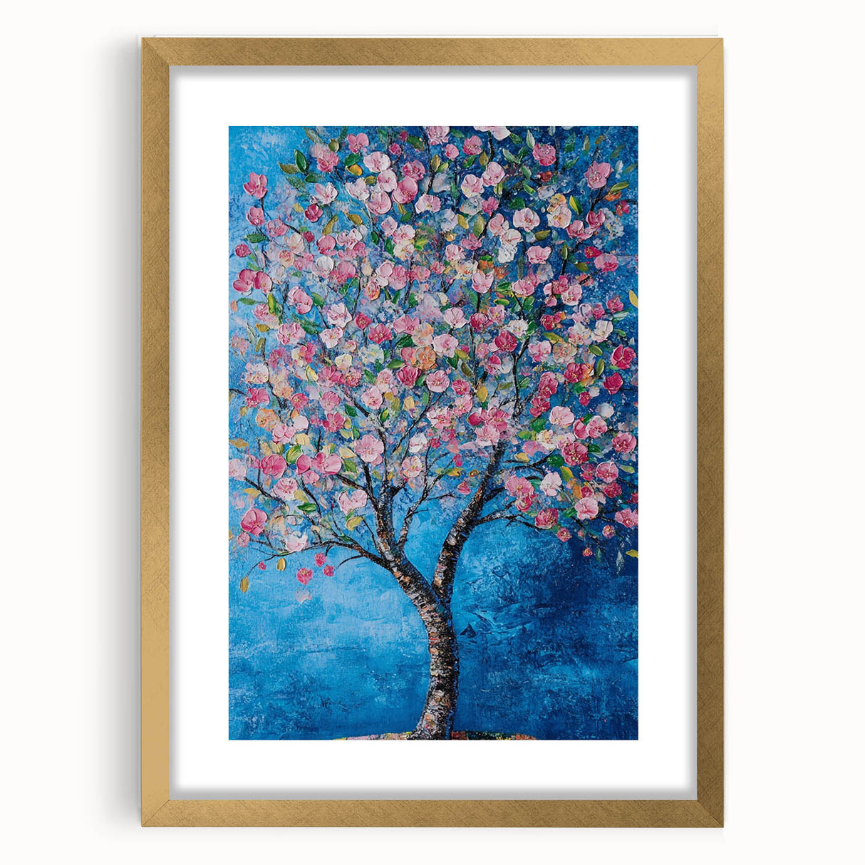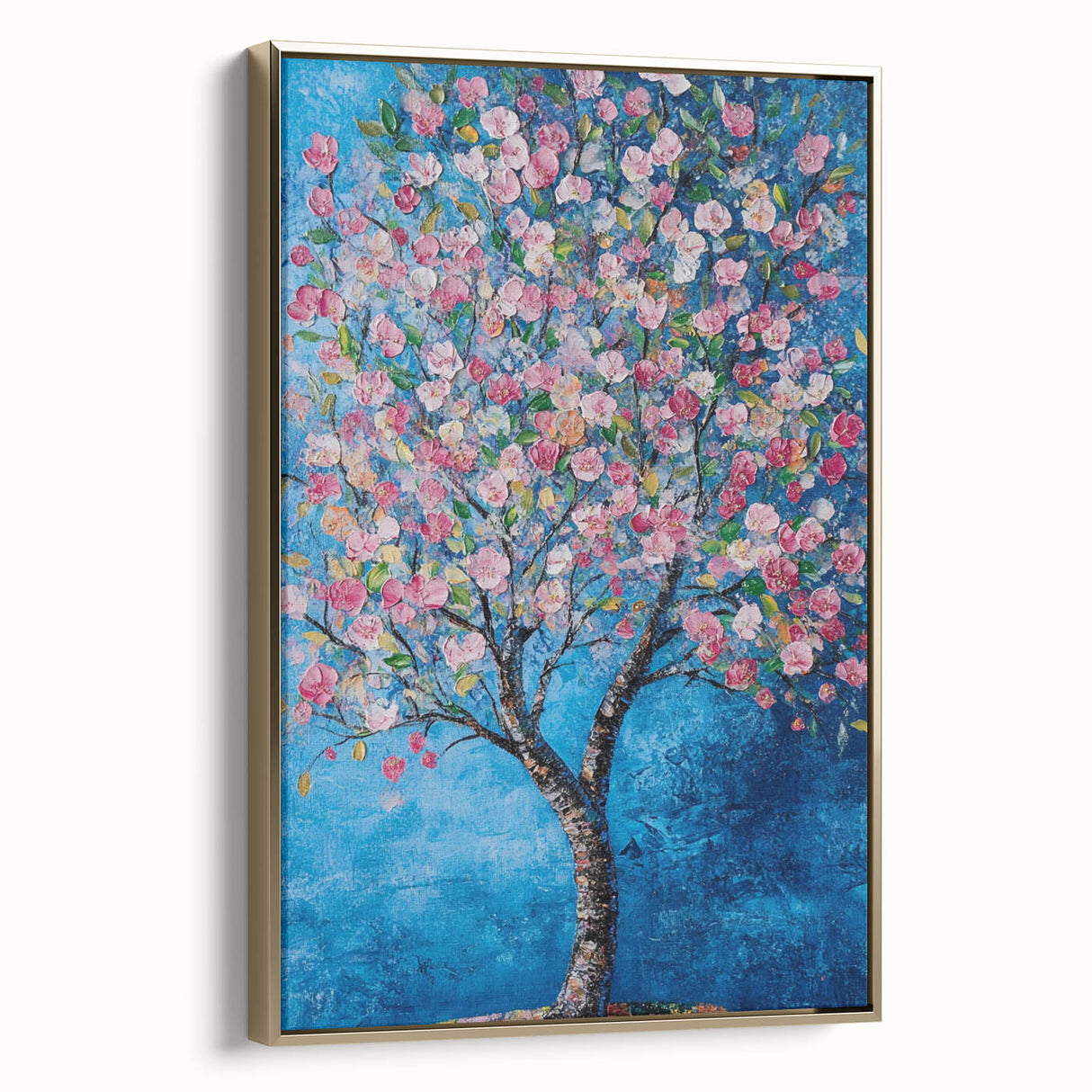 Celebrate the beauty of spring with this breathtaking tree art print, featuring a blooming cherry blossom tree set against a textured, deep blue background. The delicate pink flowers contrast beautifully with the rich blues, creating a nature-inspired wall art piece that brings a sense of renewal and elegance to any space.