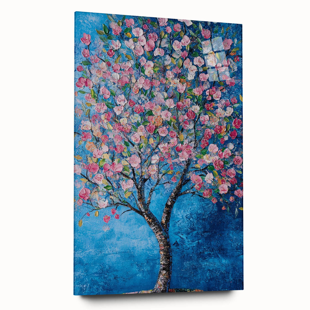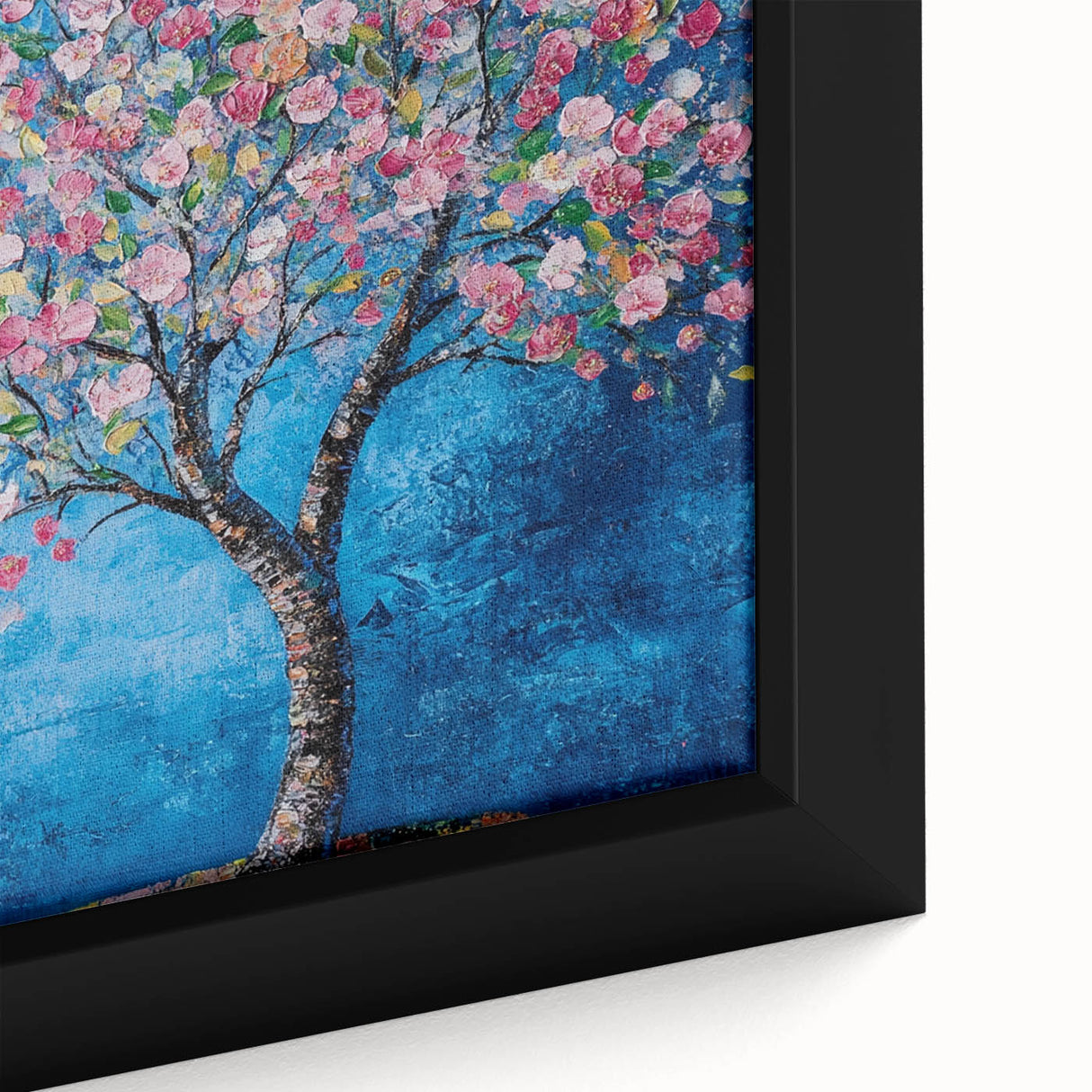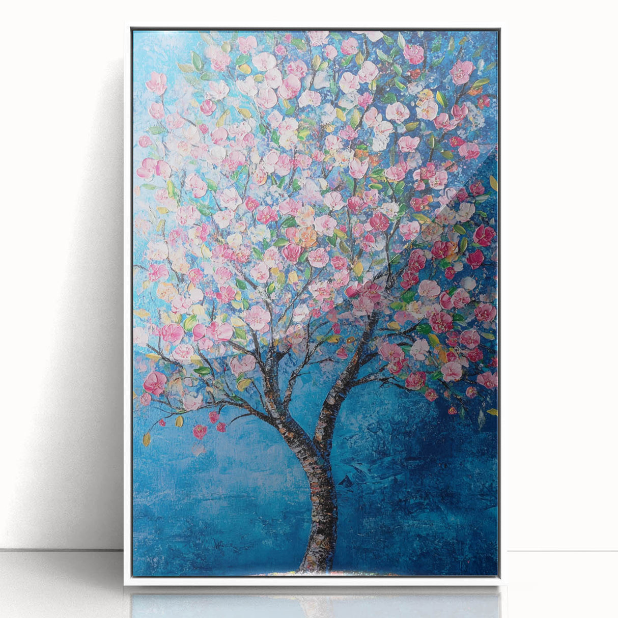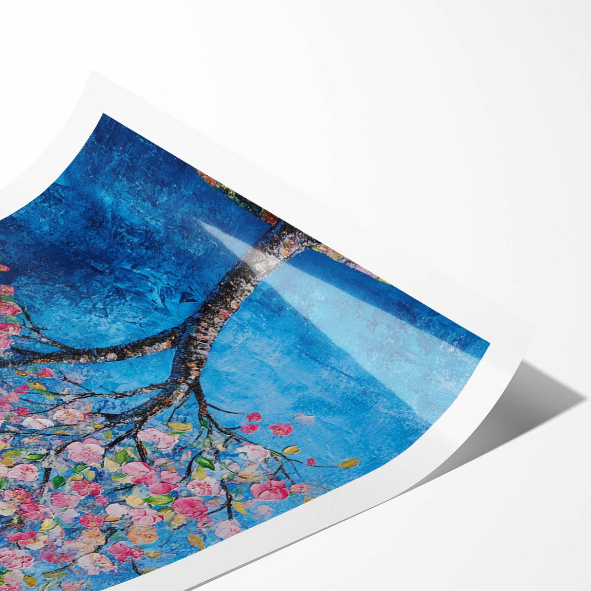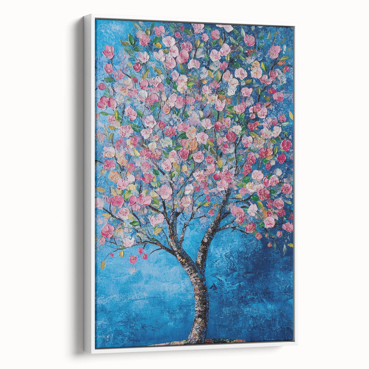 Celebrate the beauty of spring with this breathtaking tree art print, featuring a blooming cherry blossom tree set against a textured, deep blue background. The delicate pink flowers contrast beautifully with the rich blues, creating a nature-inspired wall art piece that brings a sense of renewal and elegance to any space.