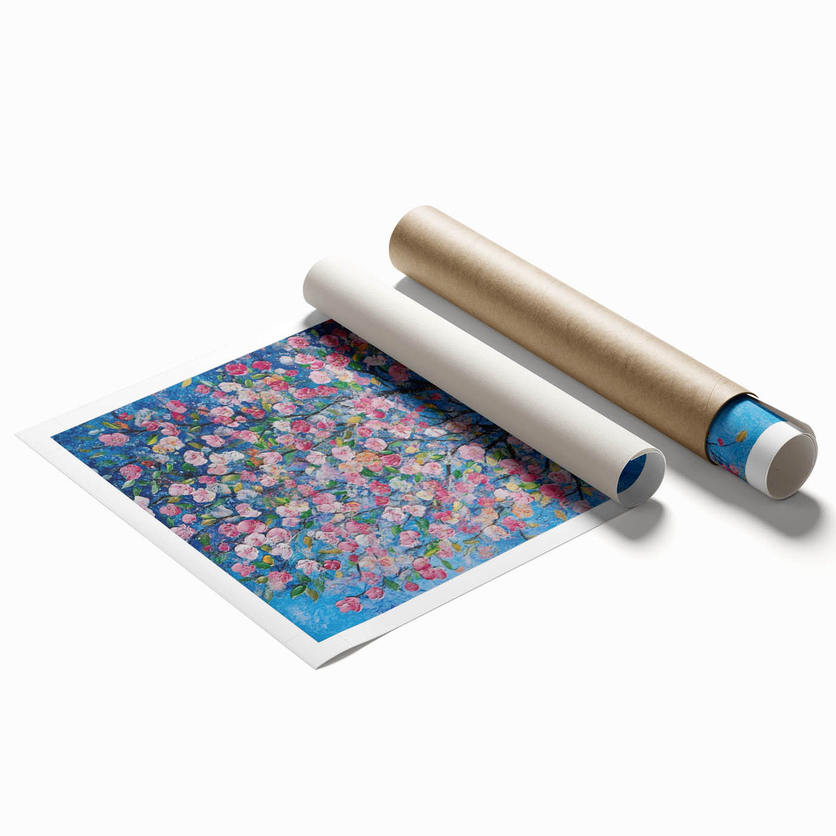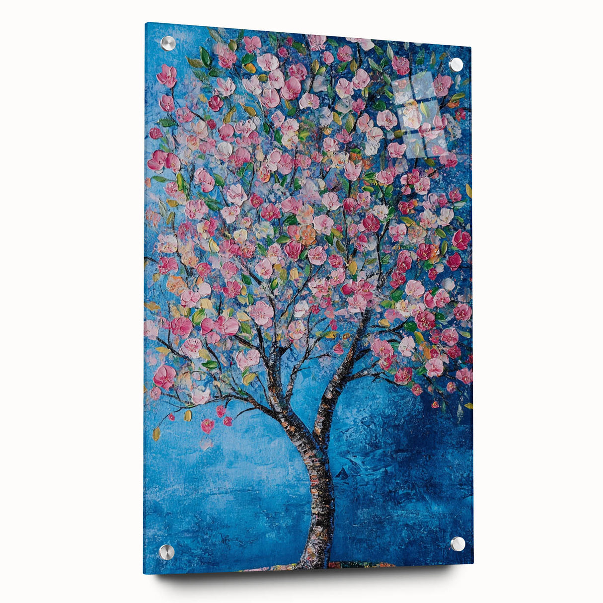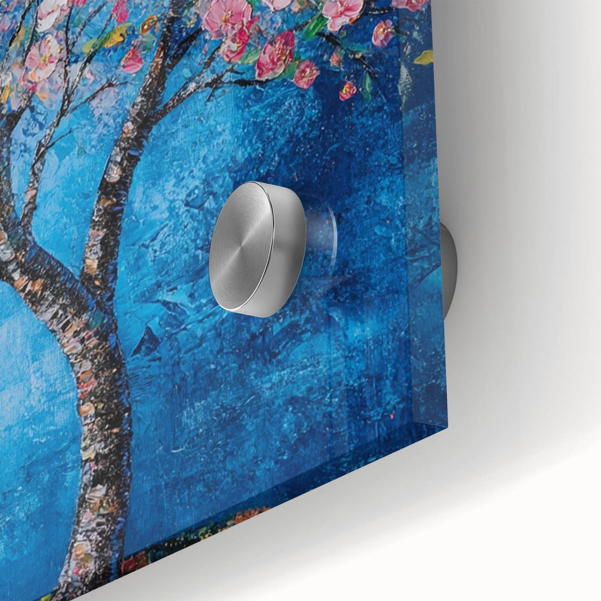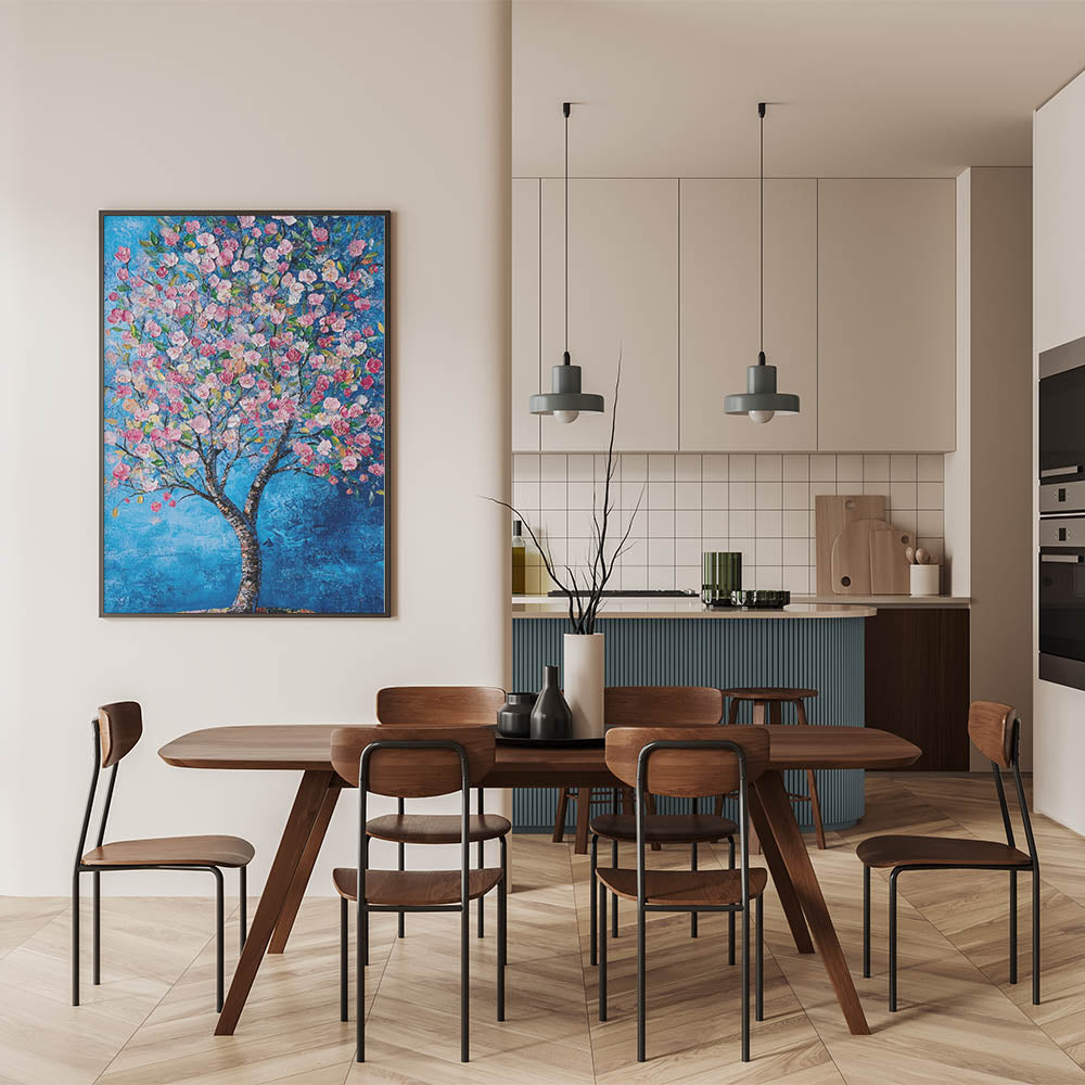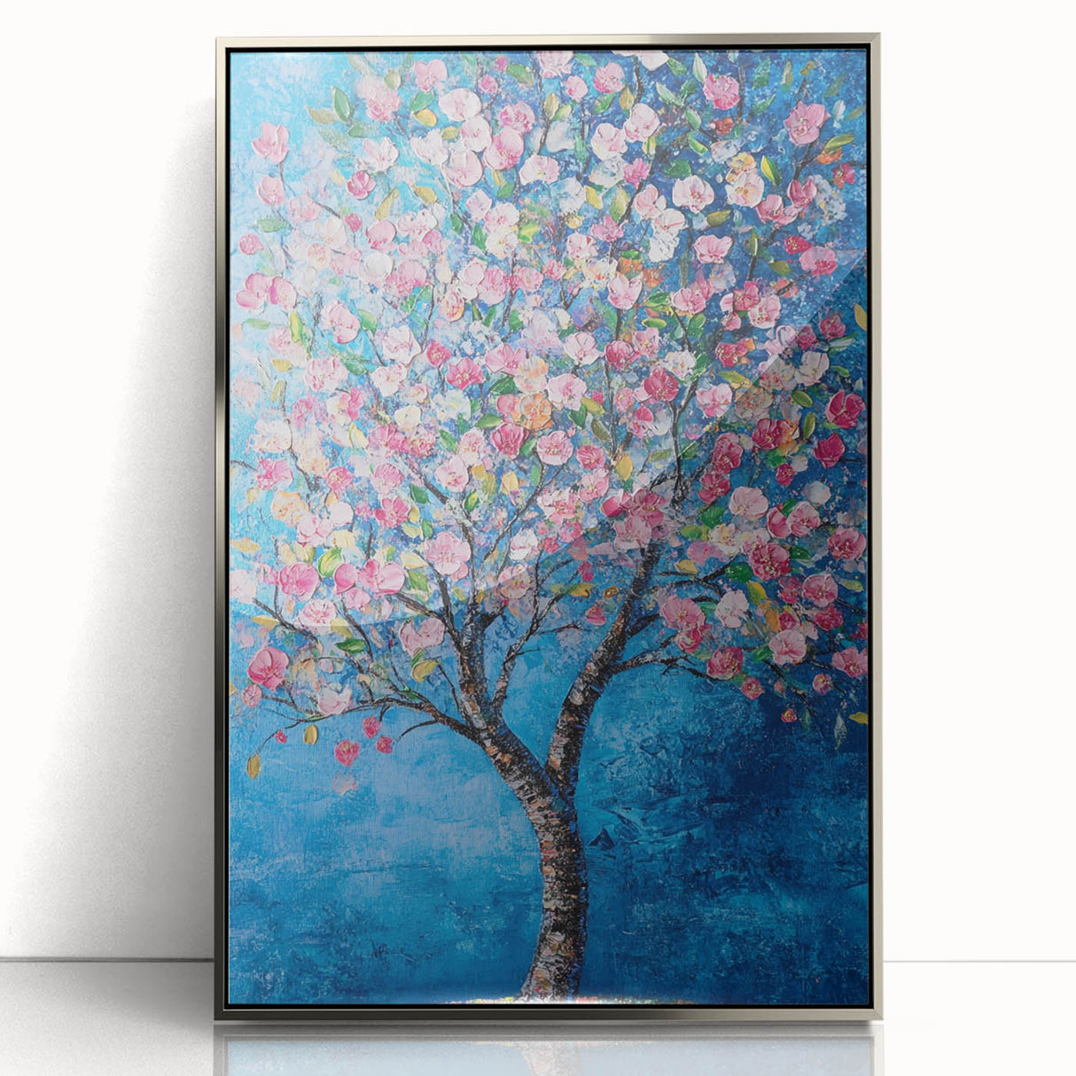 Celebrate the beauty of spring with this breathtaking tree art print, featuring a blooming cherry blossom tree set against a textured, deep blue background. The delicate pink flowers contrast beautifully with the rich blues, creating a nature-inspired wall art piece that brings a sense of renewal and elegance to any space.