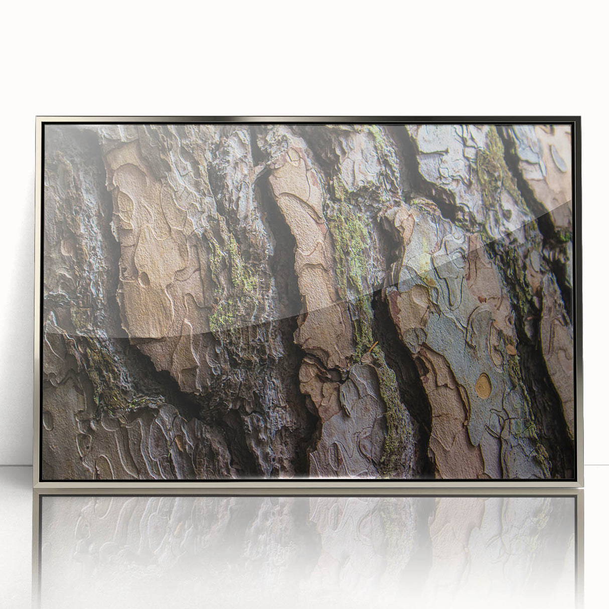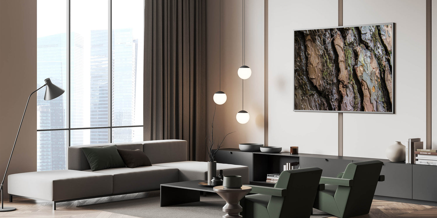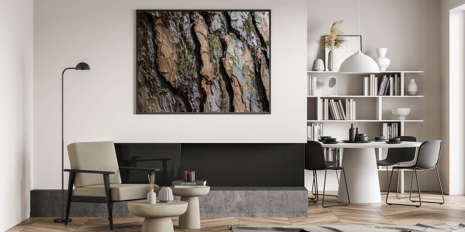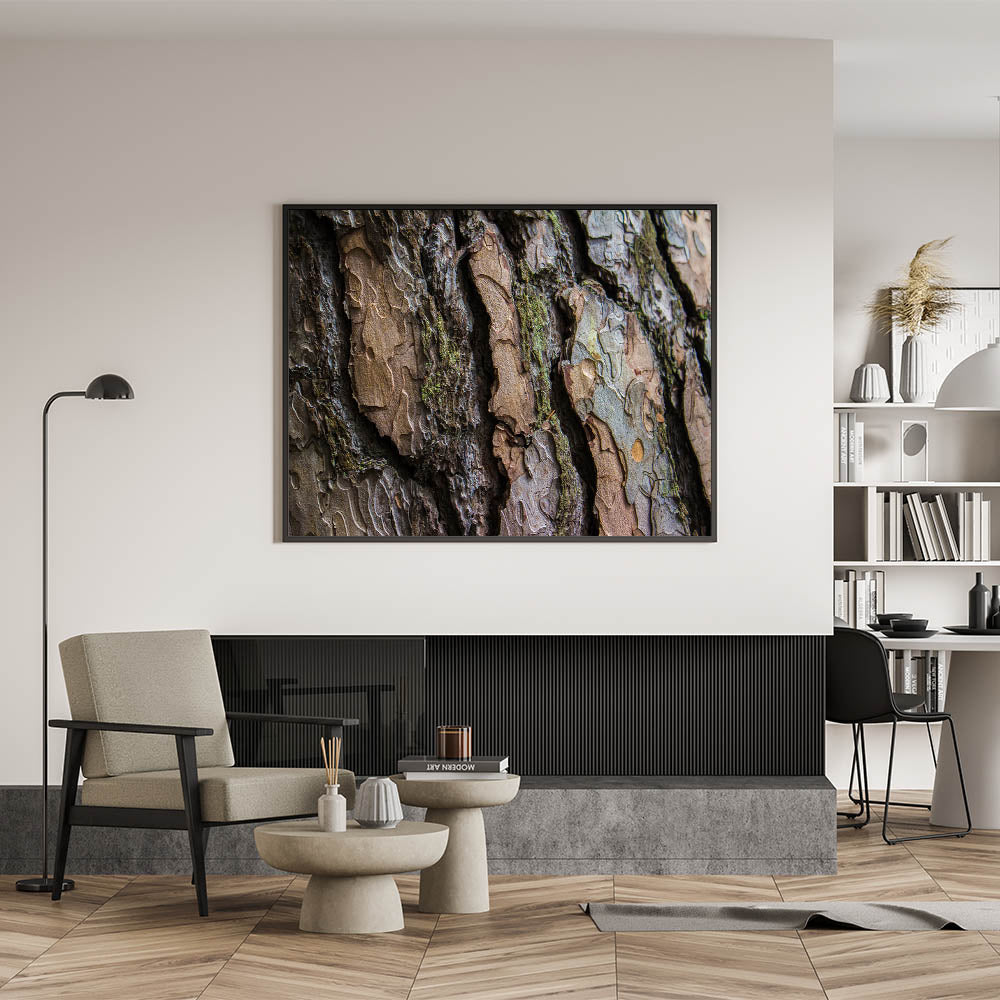 This tree bark close-up offers a striking visual experience, blending the beauty of nature with a contemporary design. Whether you’re looking to create a feature wall or add a subtle touch of nature to your home, this artwork will enhance the overall ambiance of any room with its earthy tones and textures.