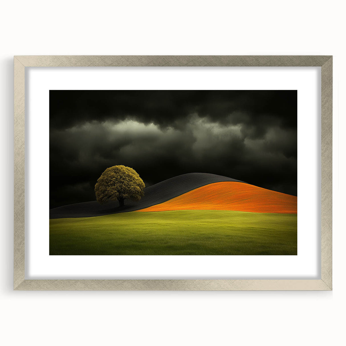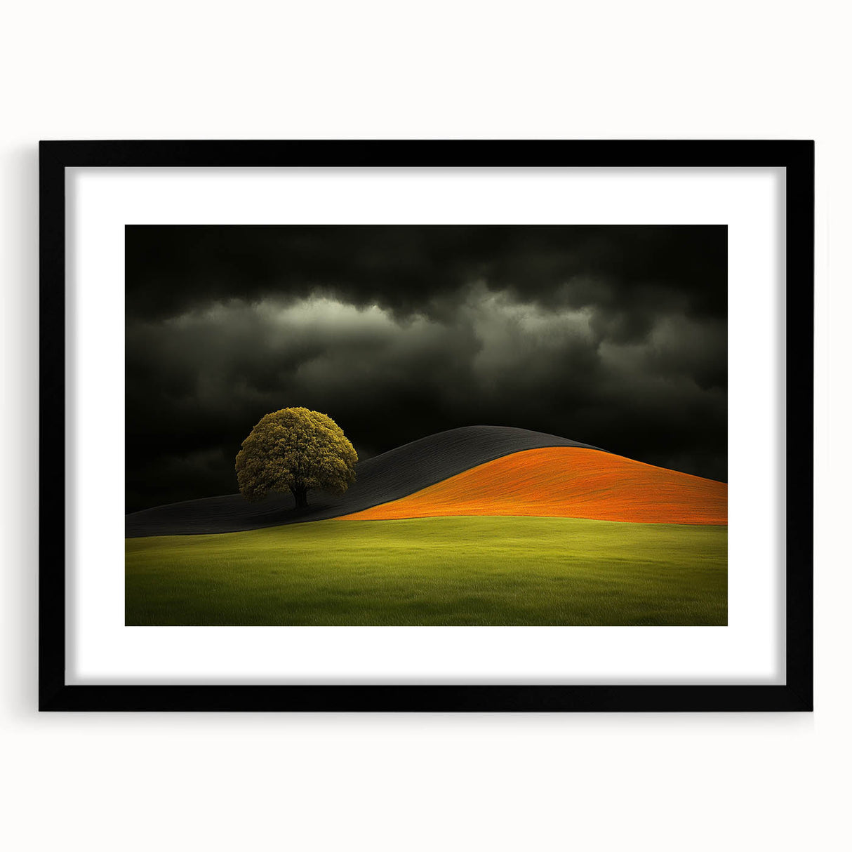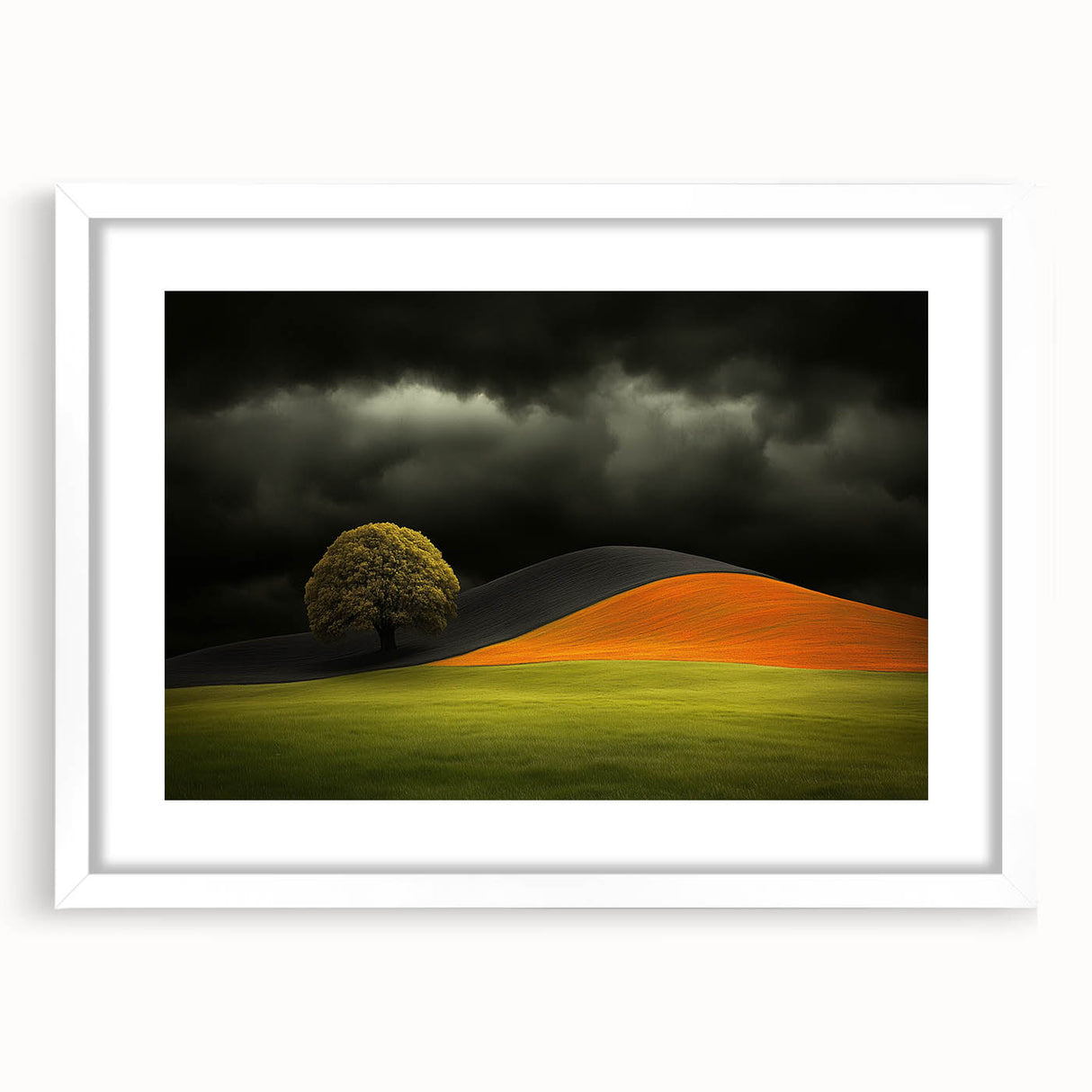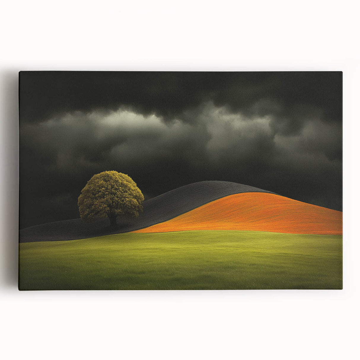 Experience the powerful contrast of light and shadow with this Tree Art Print, featuring a solitary tree set against rolling hills and an intense stormy sky. The striking blend of dark clouds, golden-orange fields, and lush green grass creates a captivating and moody atmosphere, making this Nature-Inspired Wall Art a perfect choice for those who appreciate dramatic landscapes.