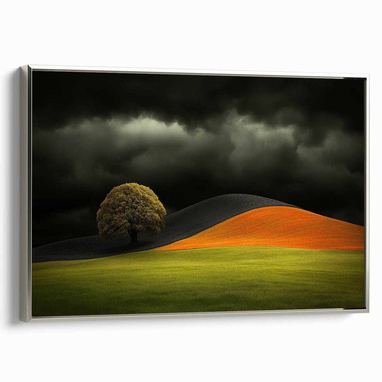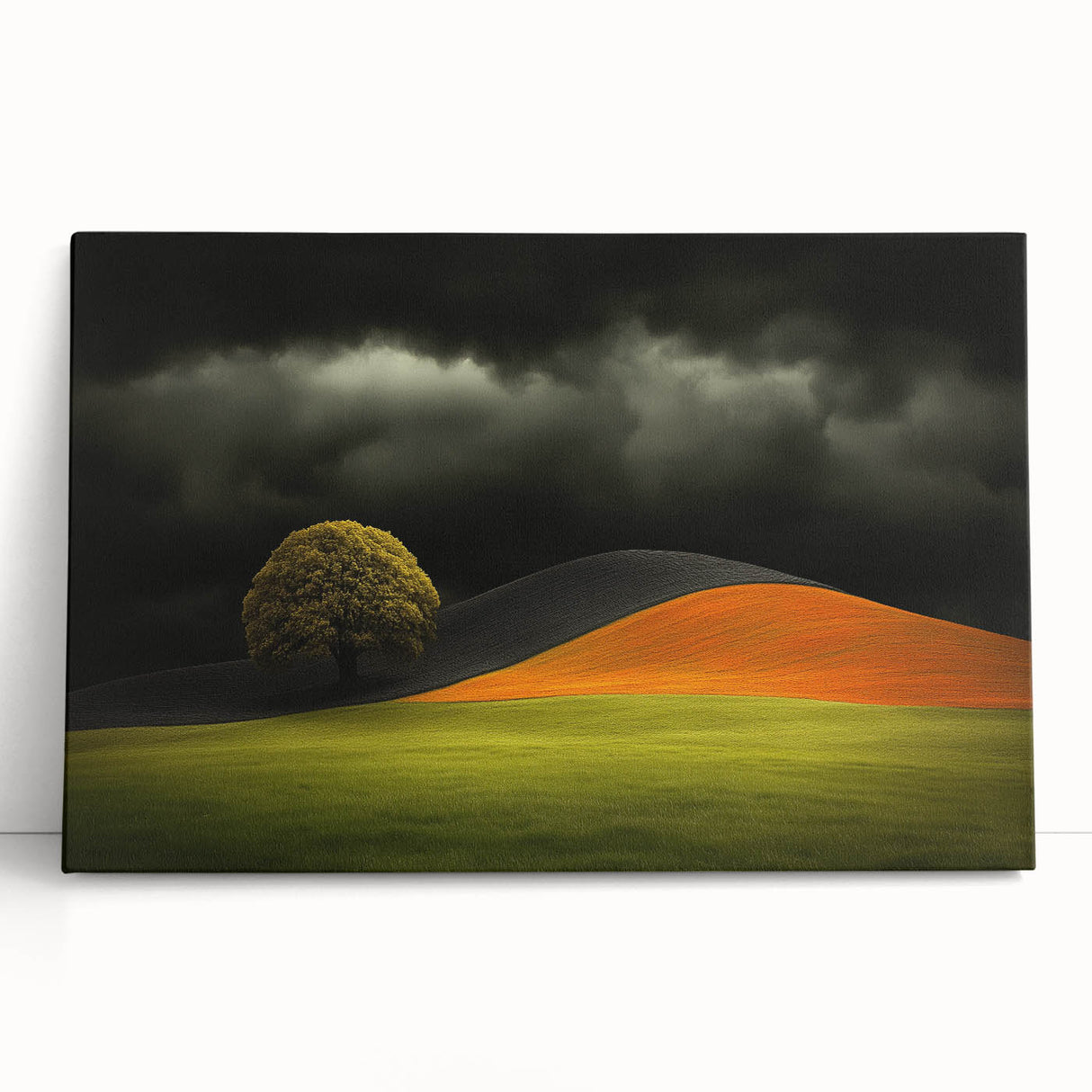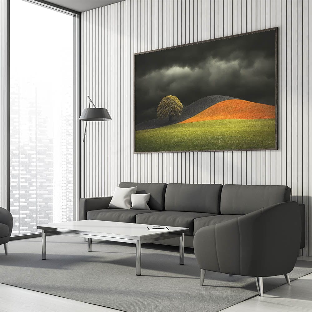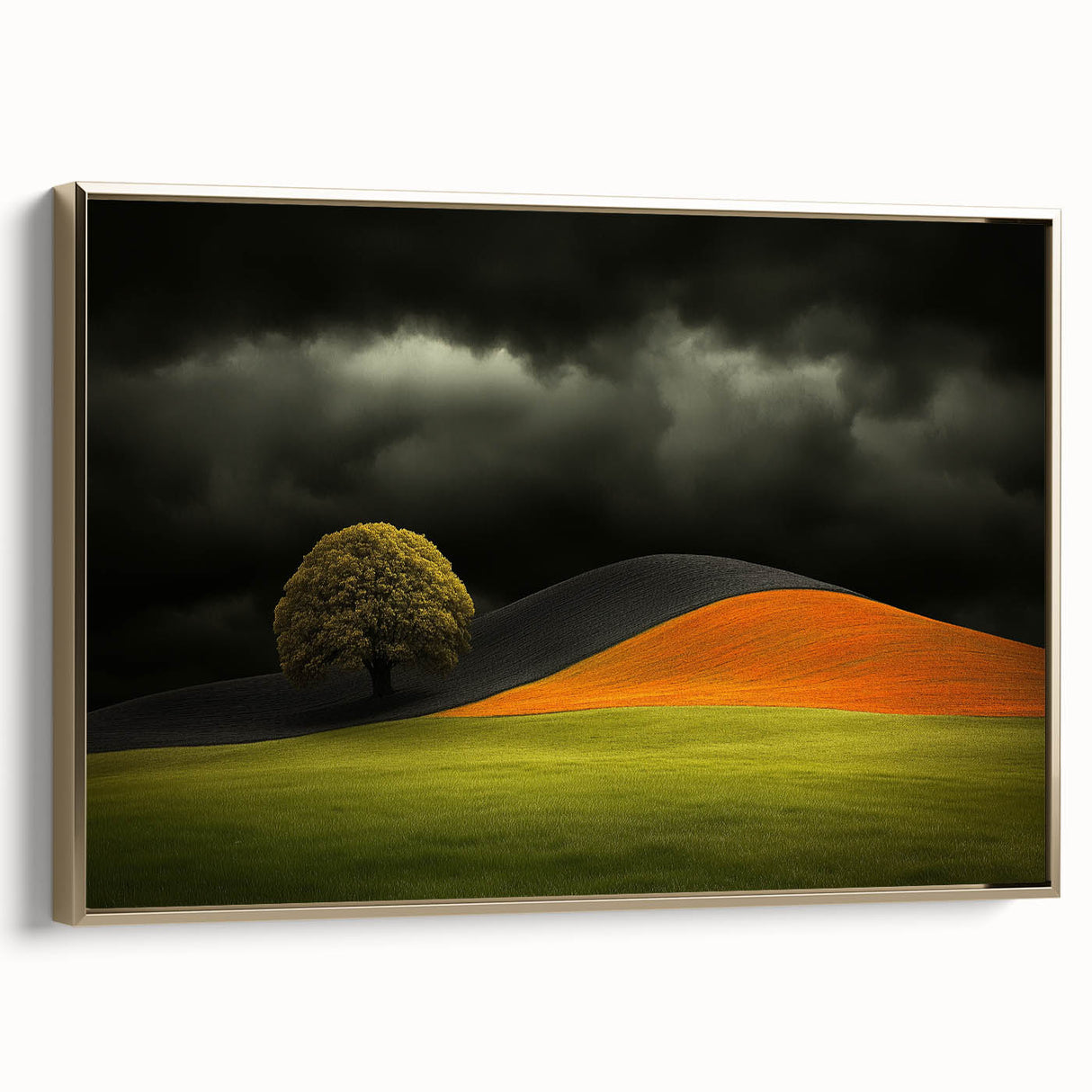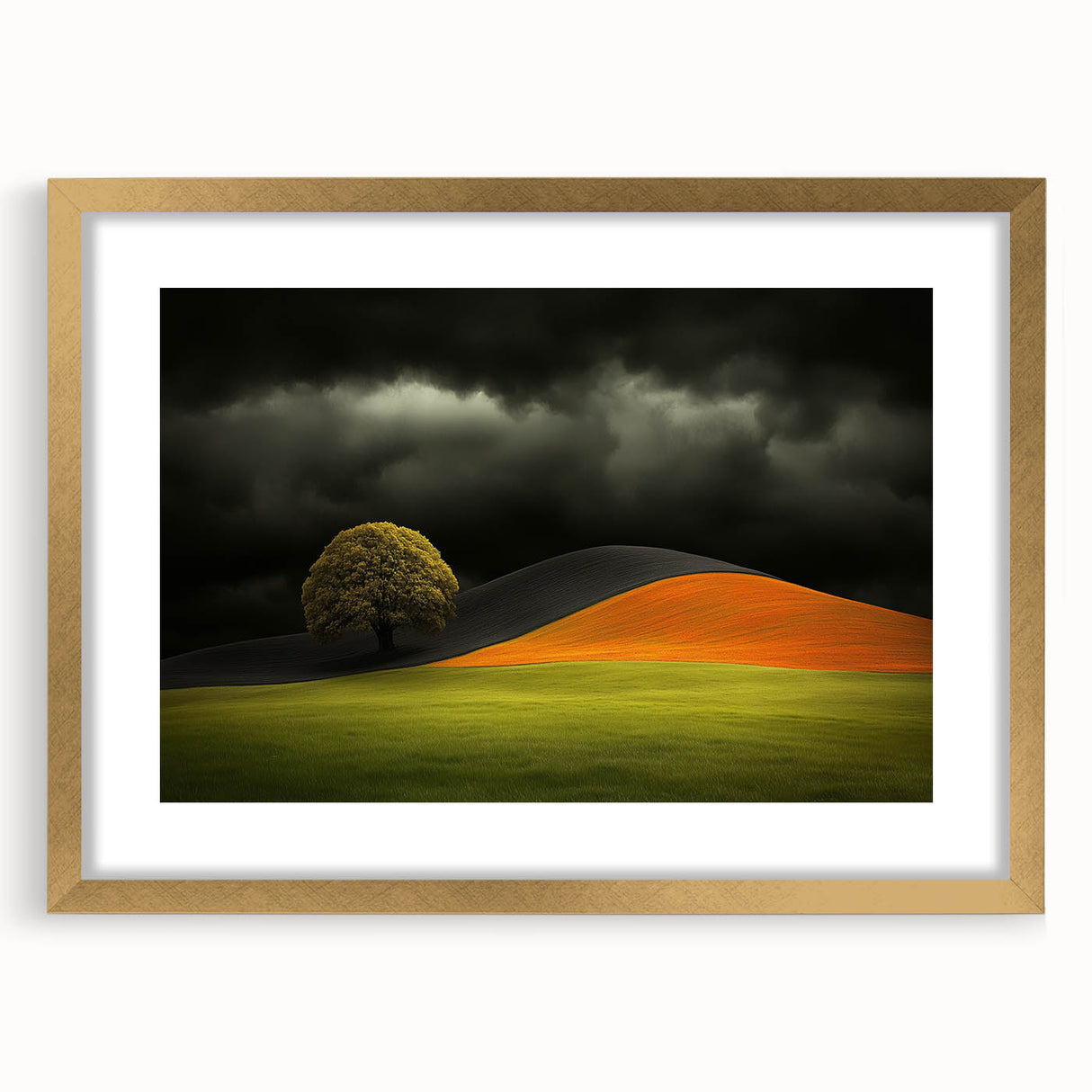 Experience the powerful contrast of light and shadow with this Tree Art Print, featuring a solitary tree set against rolling hills and an intense stormy sky. The striking blend of dark clouds, golden-orange fields, and lush green grass creates a captivating and moody atmosphere, making this Nature-Inspired Wall Art a perfect choice for those who appreciate dramatic landscapes.