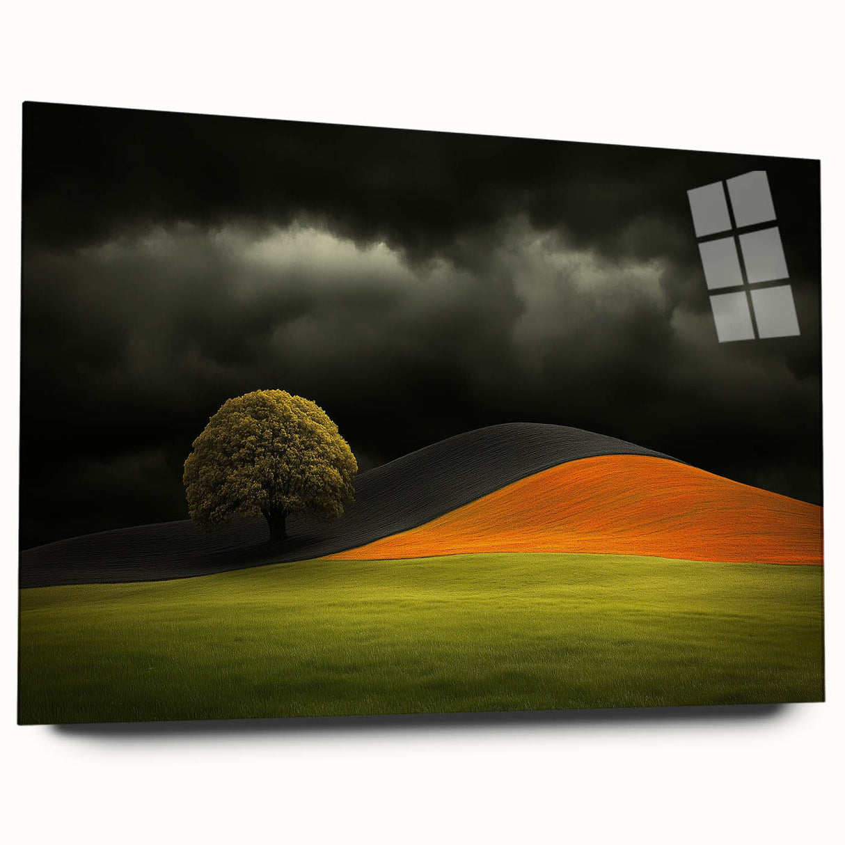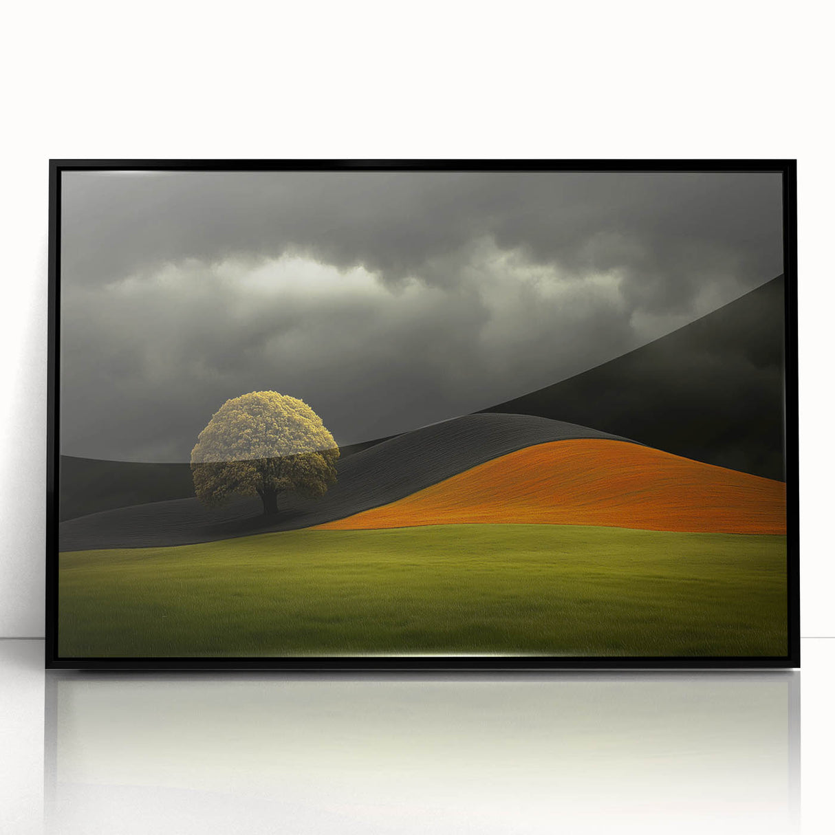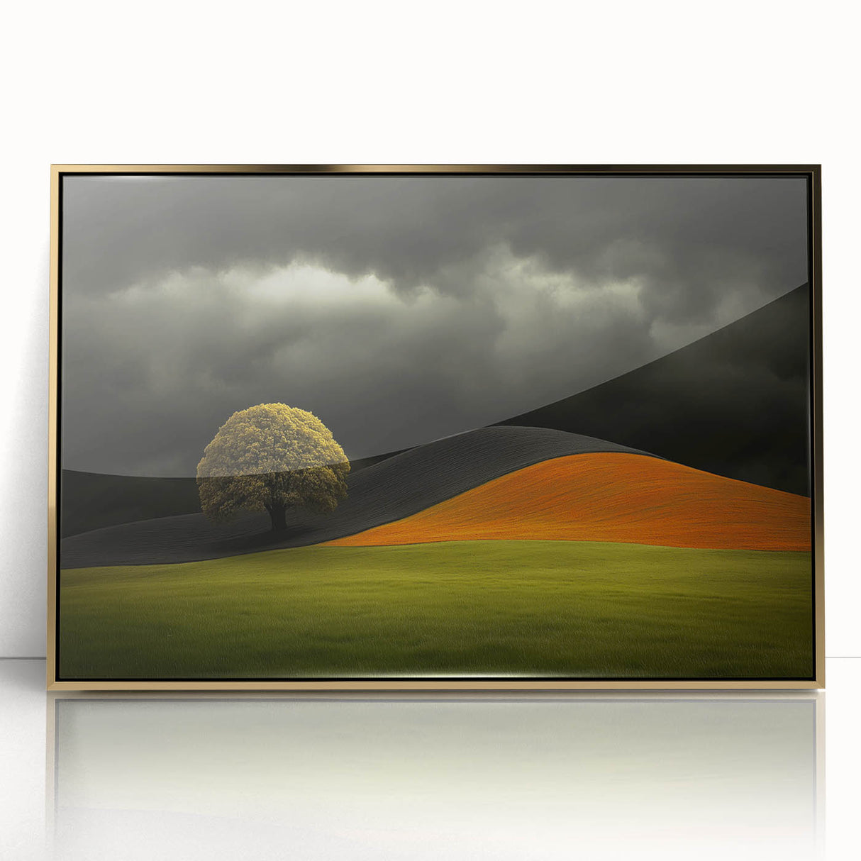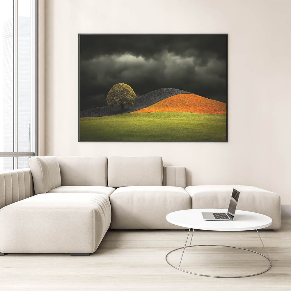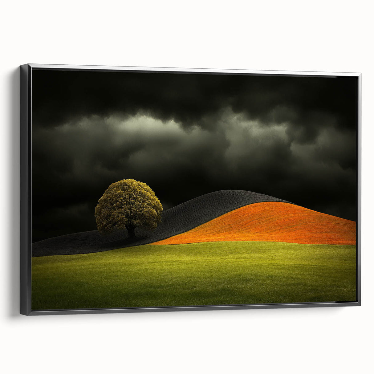Experience the powerful contrast of light and shadow with this Tree Art Print, featuring a solitary tree set against rolling hills and an intense stormy sky. The striking blend of dark clouds, golden-orange fields, and lush green grass creates a captivating and moody atmosphere, making this Nature-Inspired Wall Art a perfect choice for those who appreciate dramatic landscapes.