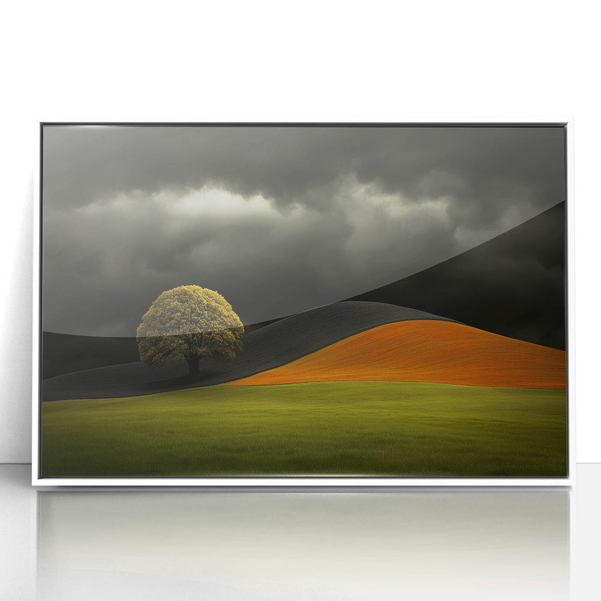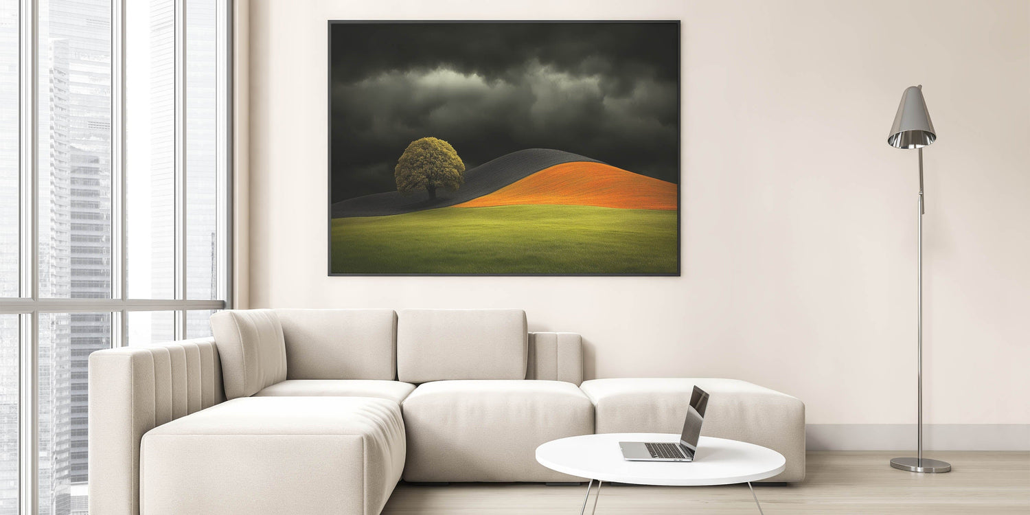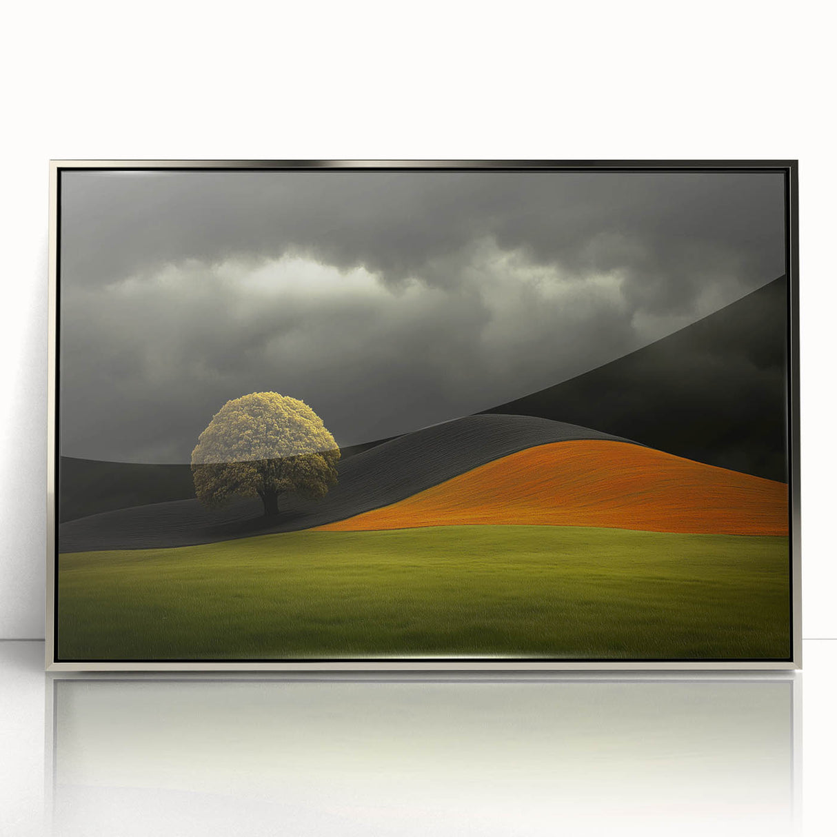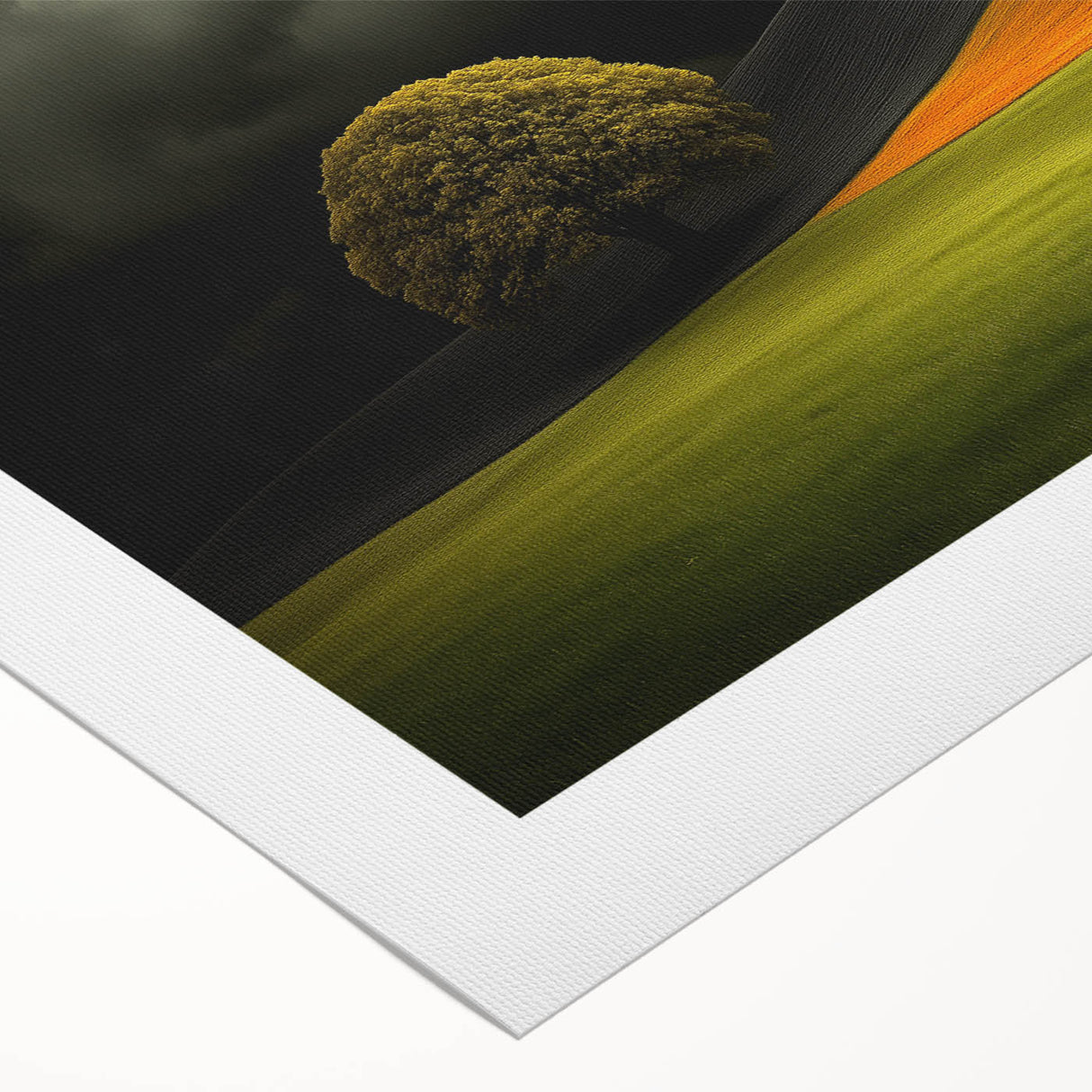 Experience the powerful contrast of light and shadow with this Tree Art Print, featuring a solitary tree set against rolling hills and an intense stormy sky. The striking blend of dark clouds, golden-orange fields, and lush green grass creates a captivating and moody atmosphere, making this Nature-Inspired Wall Art a perfect choice for those who appreciate dramatic landscapes.