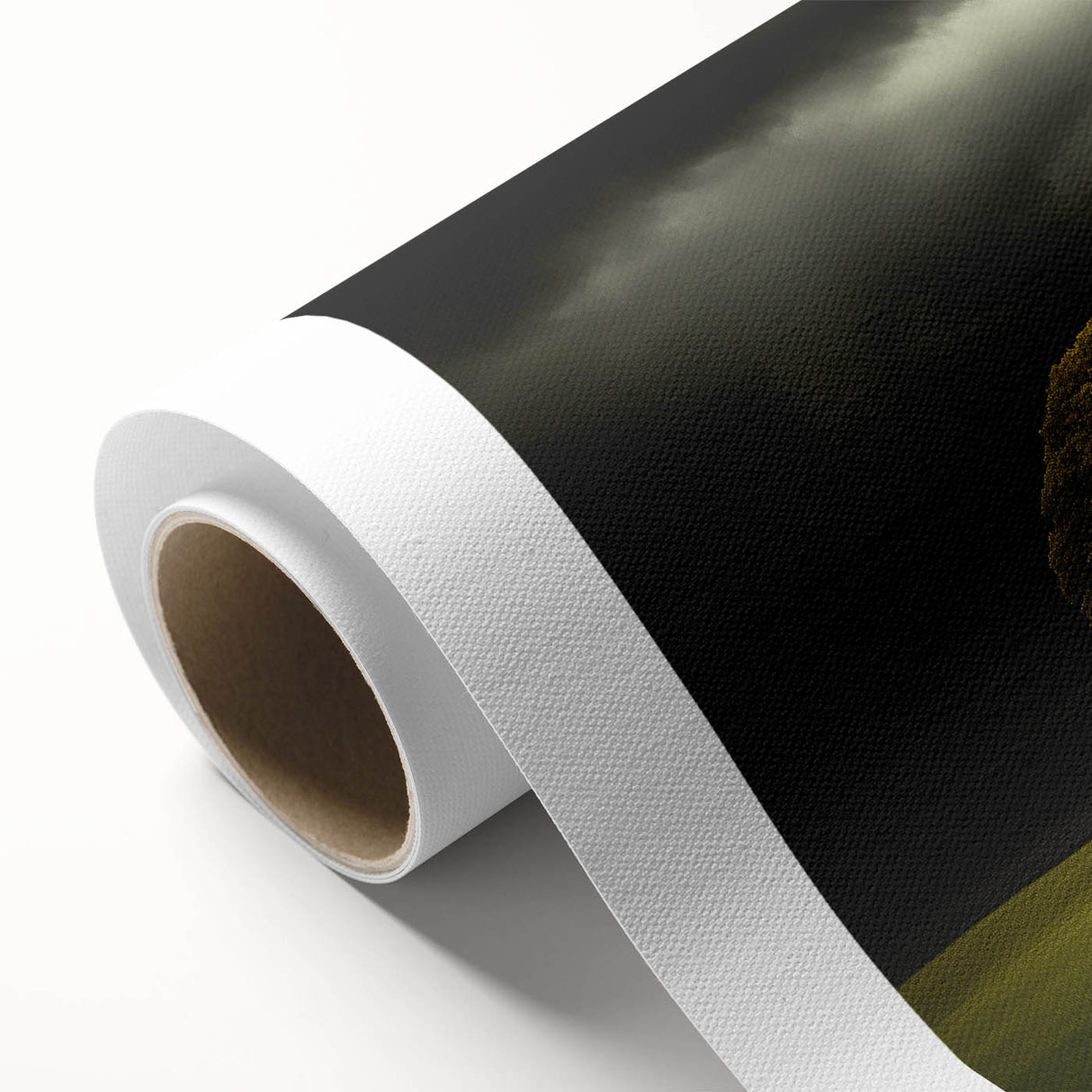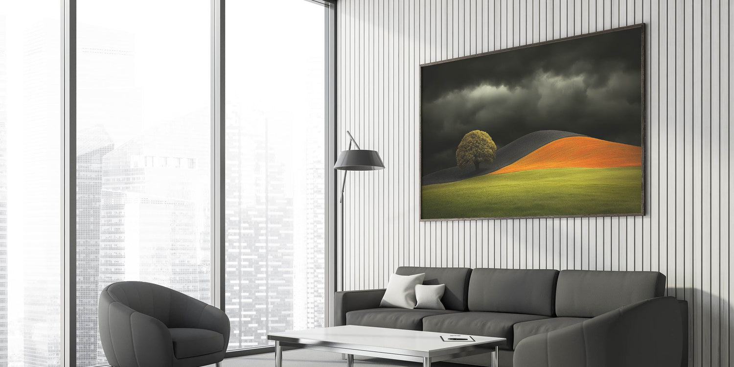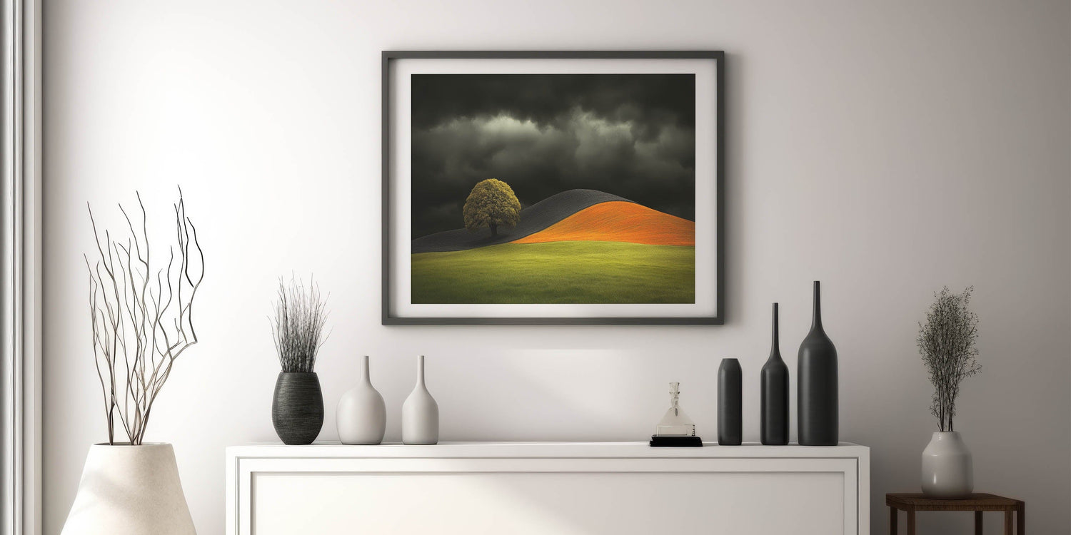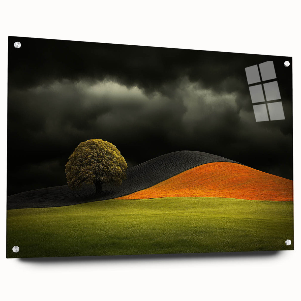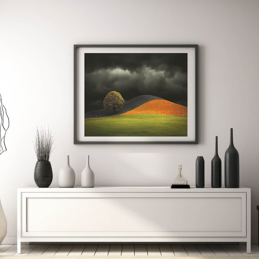 Experience the powerful contrast of light and shadow with this Tree Art Print, featuring a solitary tree set against rolling hills and an intense stormy sky. The striking blend of dark clouds, golden-orange fields, and lush green grass creates a captivating and moody atmosphere, making this Nature-Inspired Wall Art a perfect choice for those who appreciate dramatic landscapes.