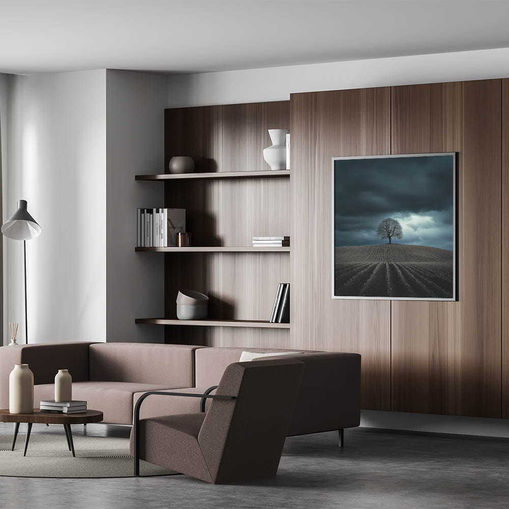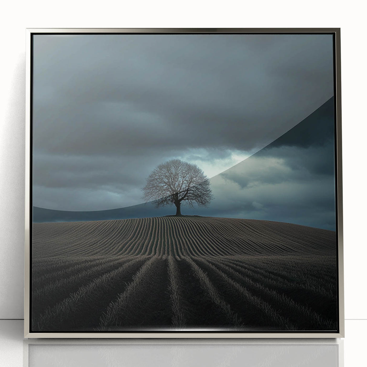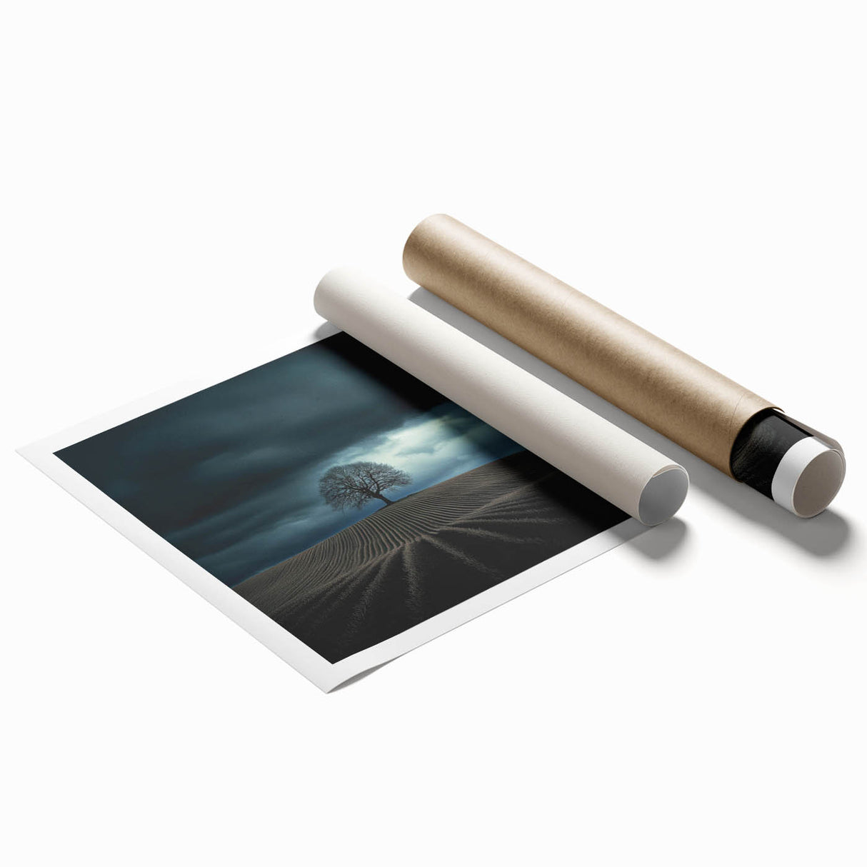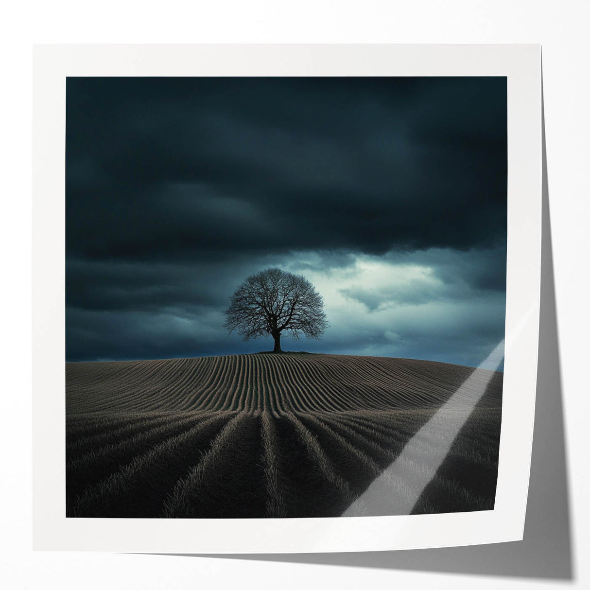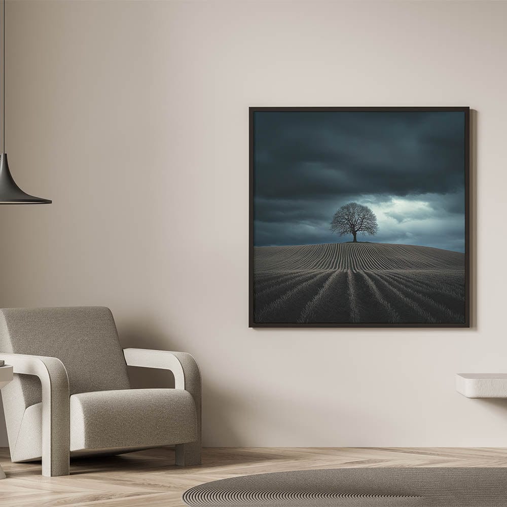Capture the raw power of nature with this striking tree art print, featuring a lone tree standing atop a plowed hill under a dark and stormy sky. The deep tones of dark gray, black, and brown create a dramatic landscape art print, evoking a sense of mystery, solitude, and strength. Whether you appreciate nature-inspired wall art or bold atmospheric landscapes, this forest art print makes a compelling statement in any space.