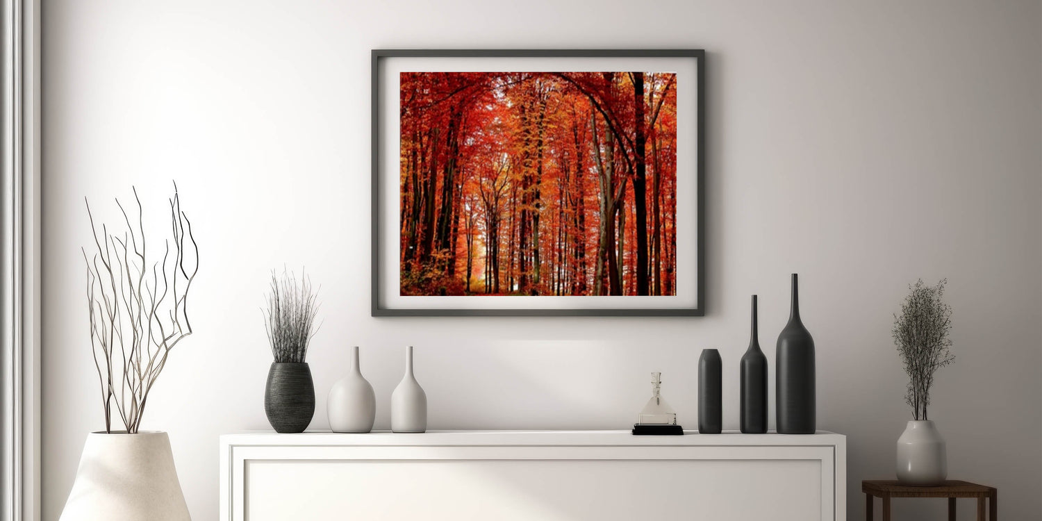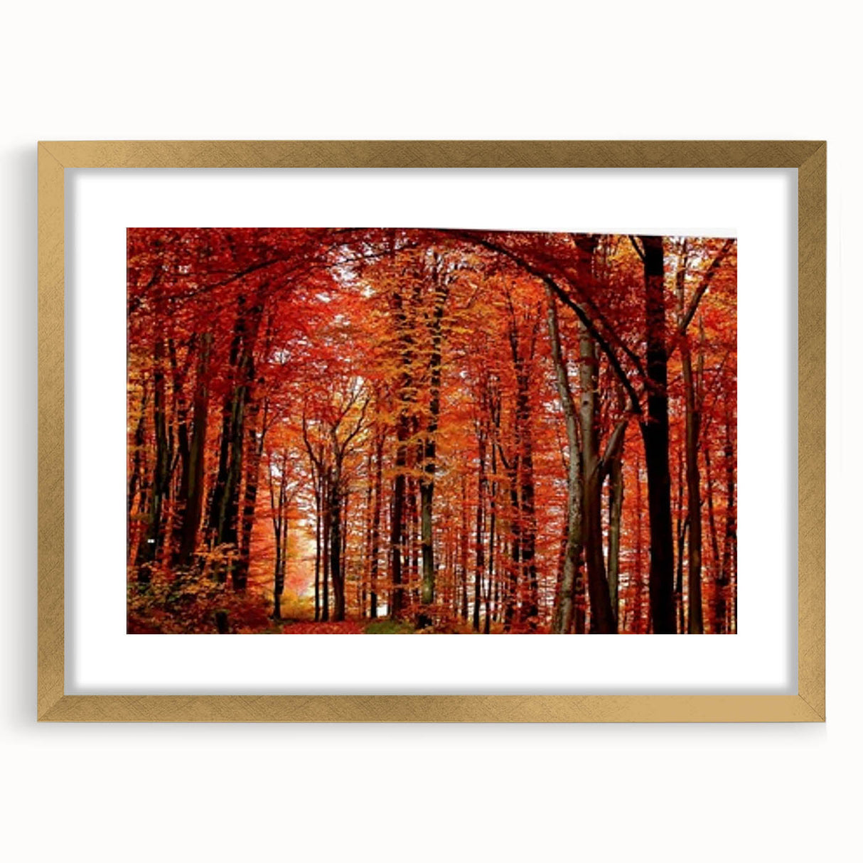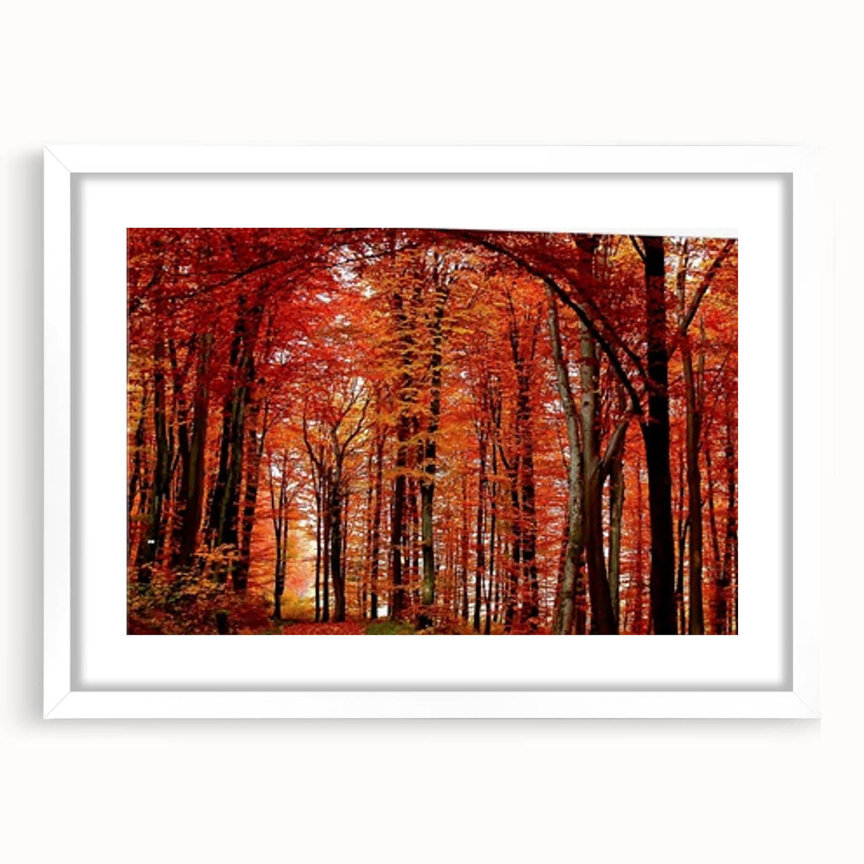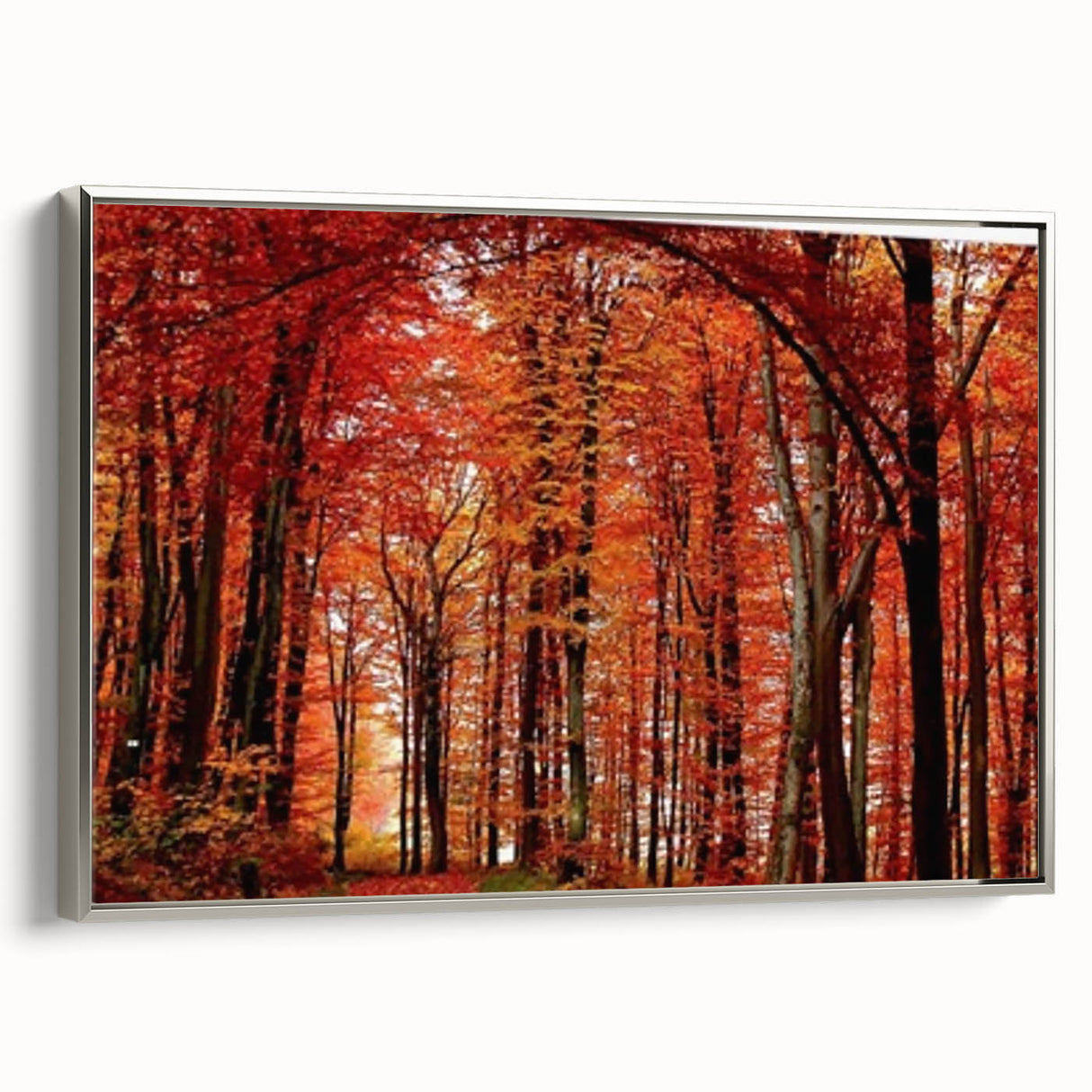 Infuse your home with the breathtaking colors of autumn through this Fiery Autumn Forest wall art. The stunning reds and oranges of the fall leaves create a dramatic and striking visual, perfectly capturing the season's fiery beauty. This artwork is ideal for adding bold color to any living room, office, or bedroom, evoking the warmth and richness of autumn days.