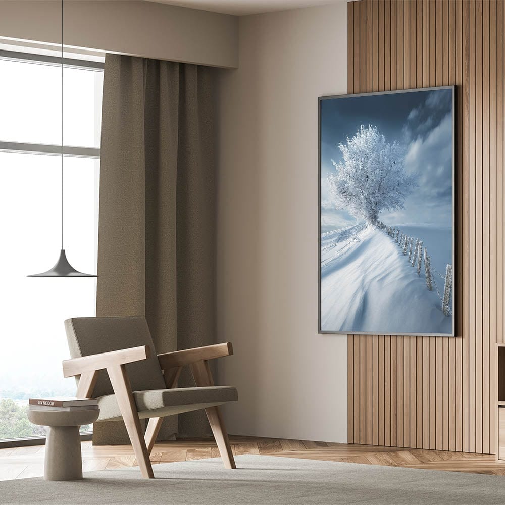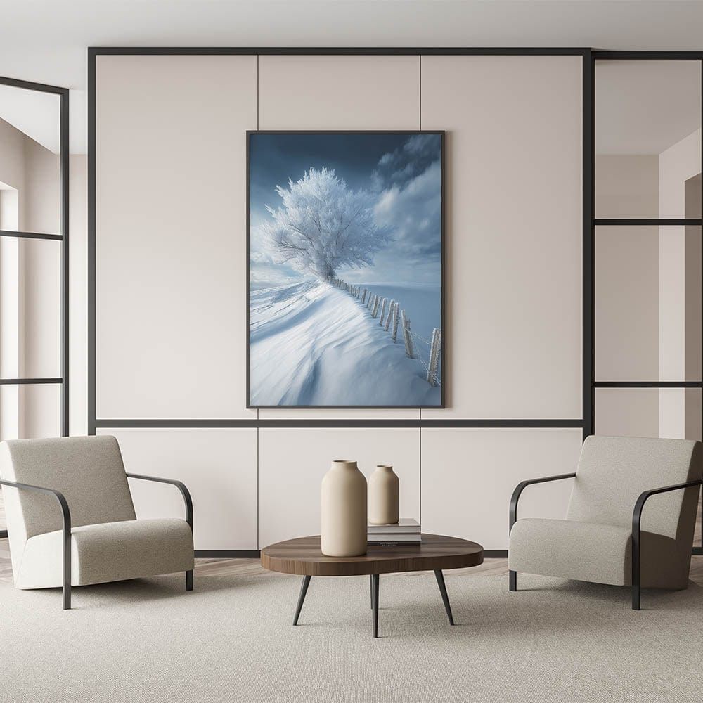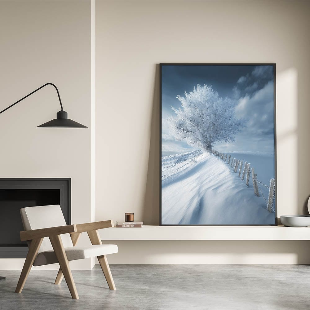 Step into a winter wonderland with this breathtaking tree art print, featuring a frost-covered tree gracefully leaning over a snow-covered hill. The soft hues of white, blue, and silver create a mesmerizing landscape art print that captures the magic of a cold, serene winter morning. Whether you appreciate nature-inspired wall art or want to add a touch of seasonal elegance to your space, this forest art print is a perfect choice.