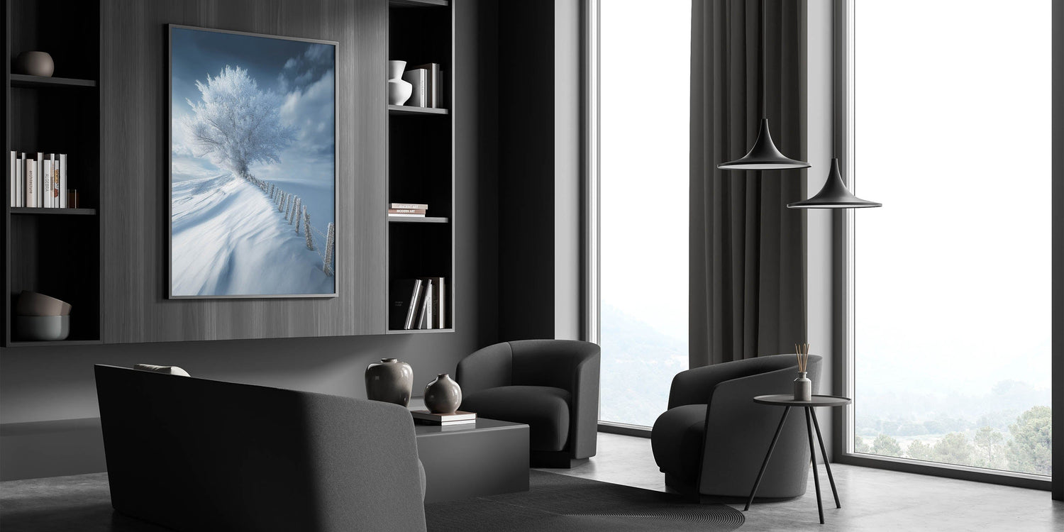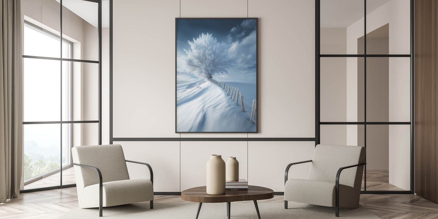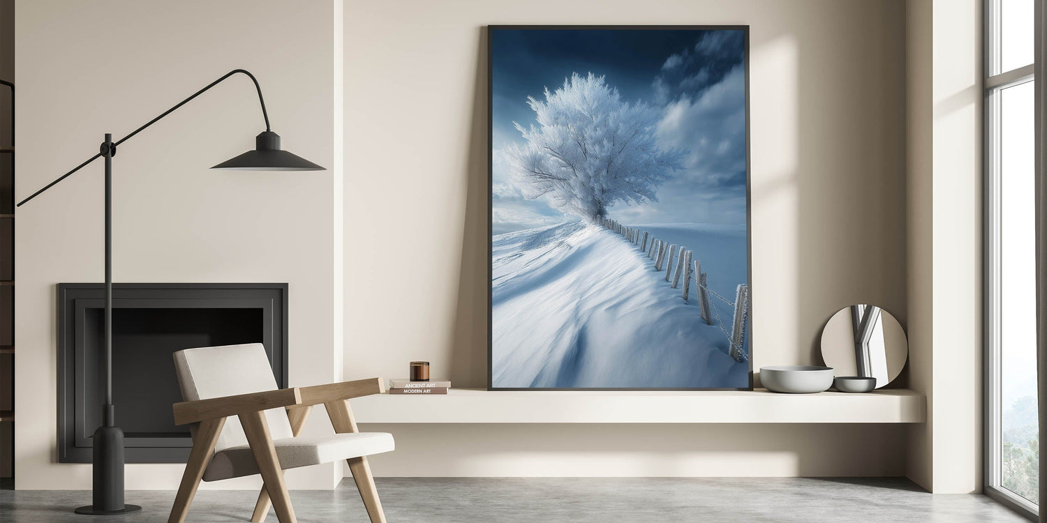 Step into a winter wonderland with this breathtaking tree art print, featuring a frost-covered tree gracefully leaning over a snow-covered hill. The soft hues of white, blue, and silver create a mesmerizing landscape art print that captures the magic of a cold, serene winter morning. Whether you appreciate nature-inspired wall art or want to add a touch of seasonal elegance to your space, this forest art print is a perfect choice.