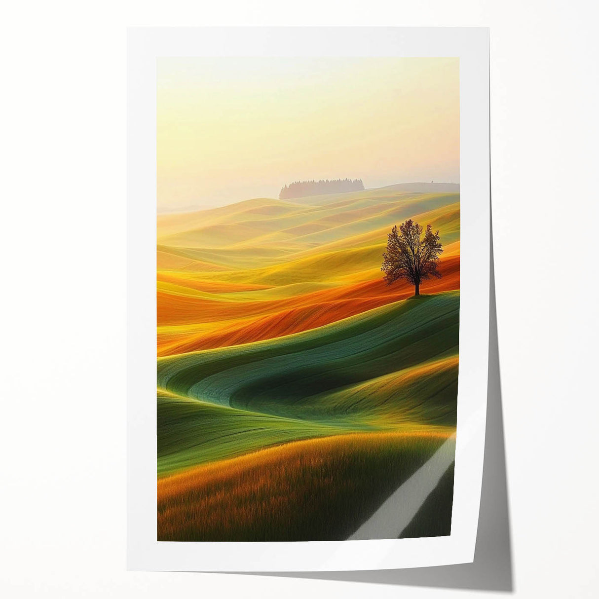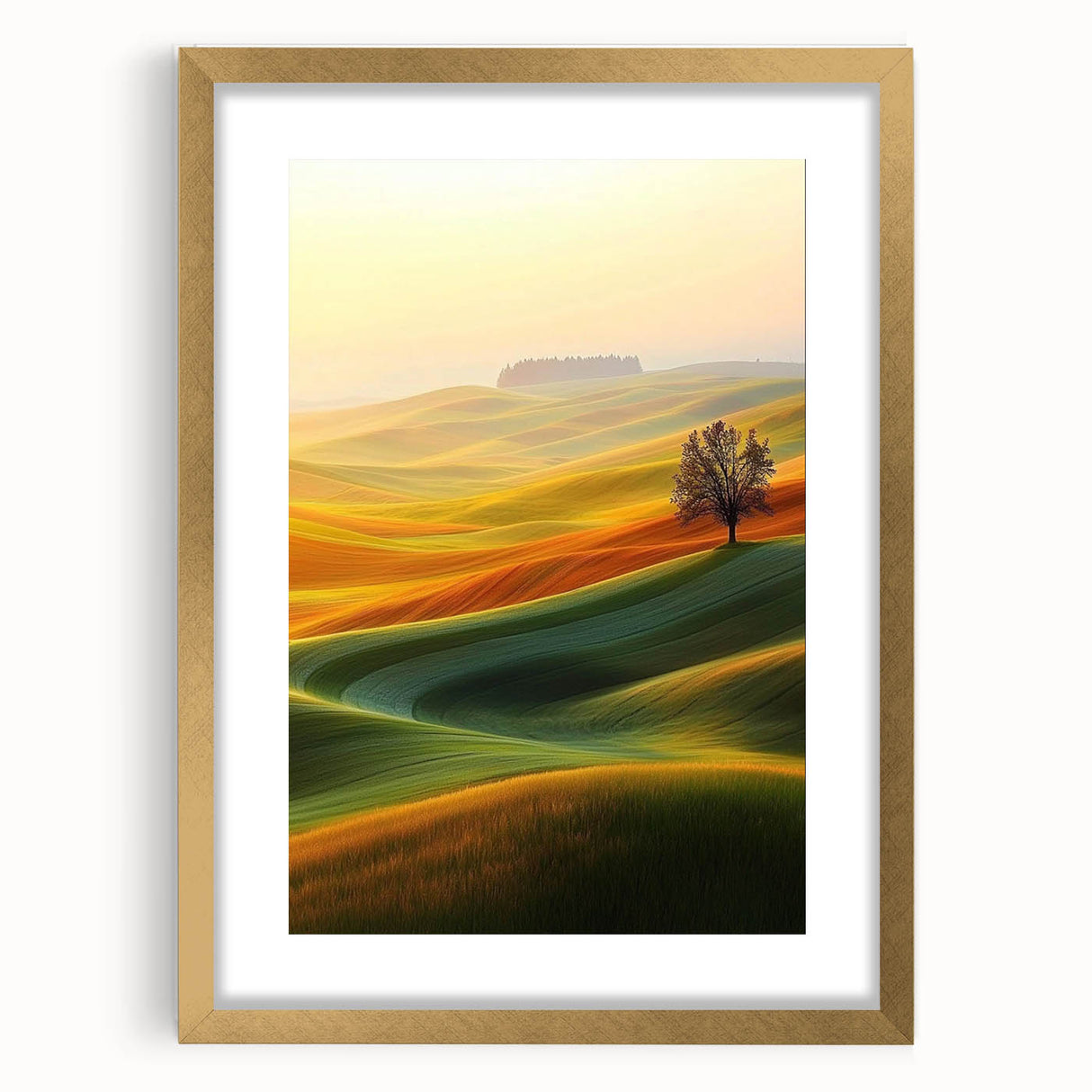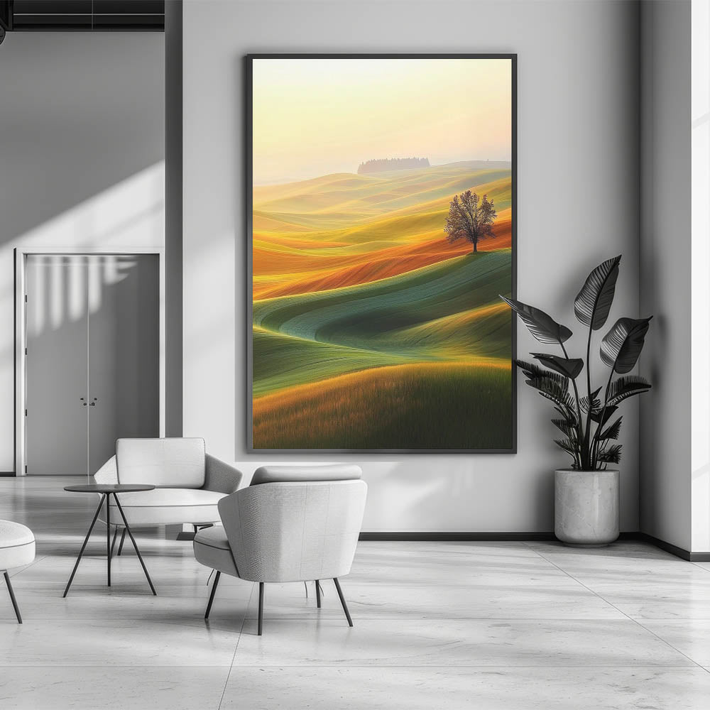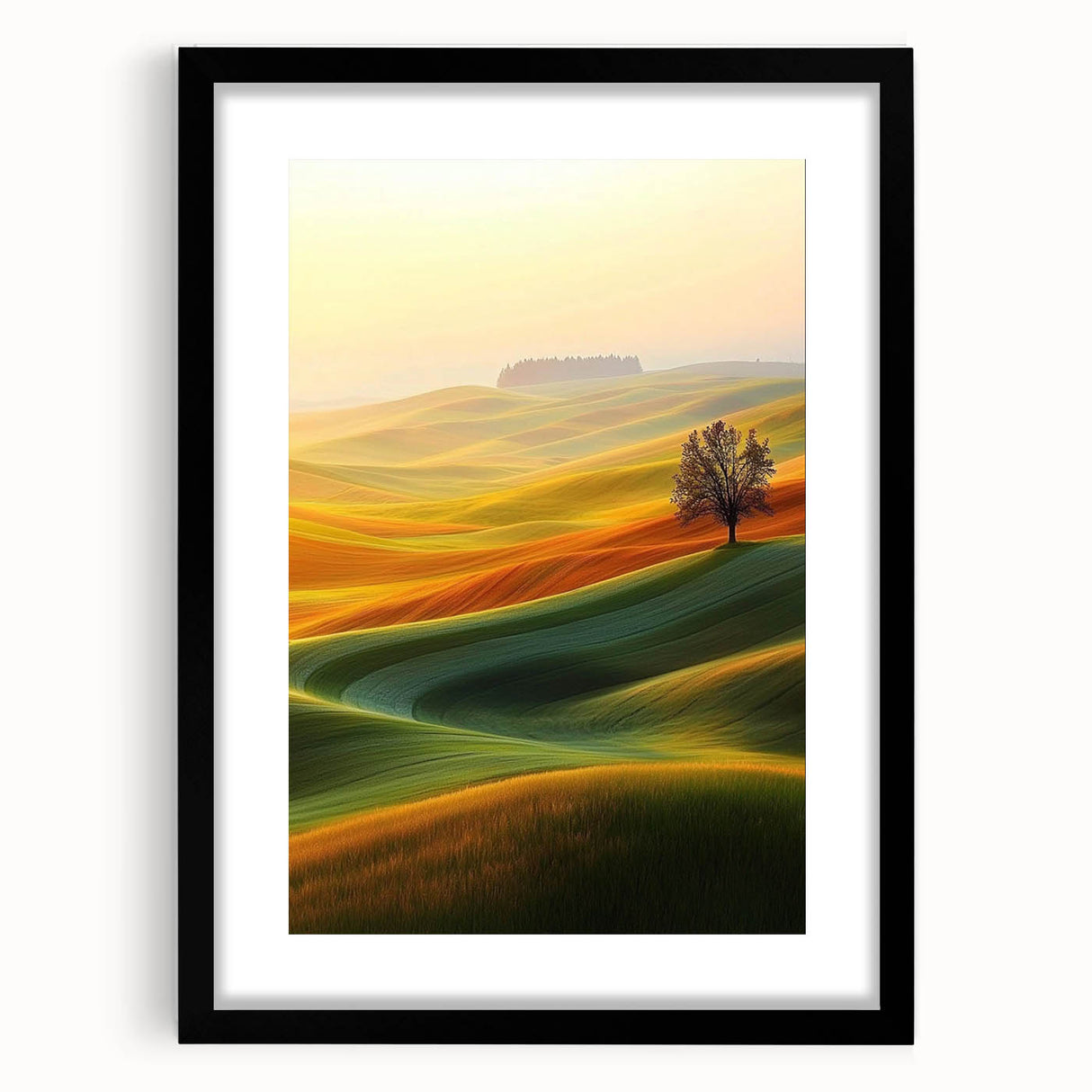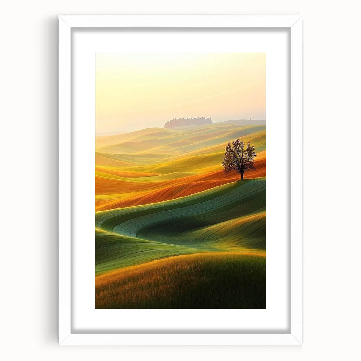 Step into a world of peaceful beauty with this tree art print, featuring a solitary tree standing amidst rolling golden and green hills bathed in soft sunlight. The natural flow of colors and gentle light creates a nature-inspired wall art piece that brings warmth, serenity, and depth to any space.
