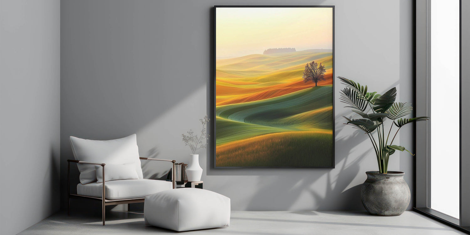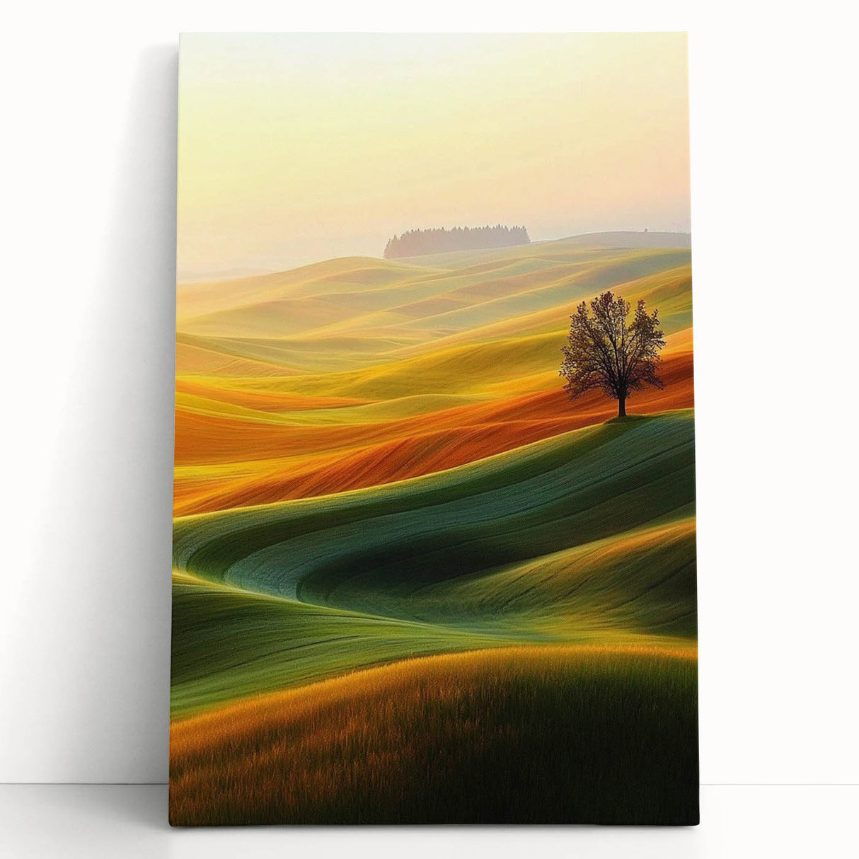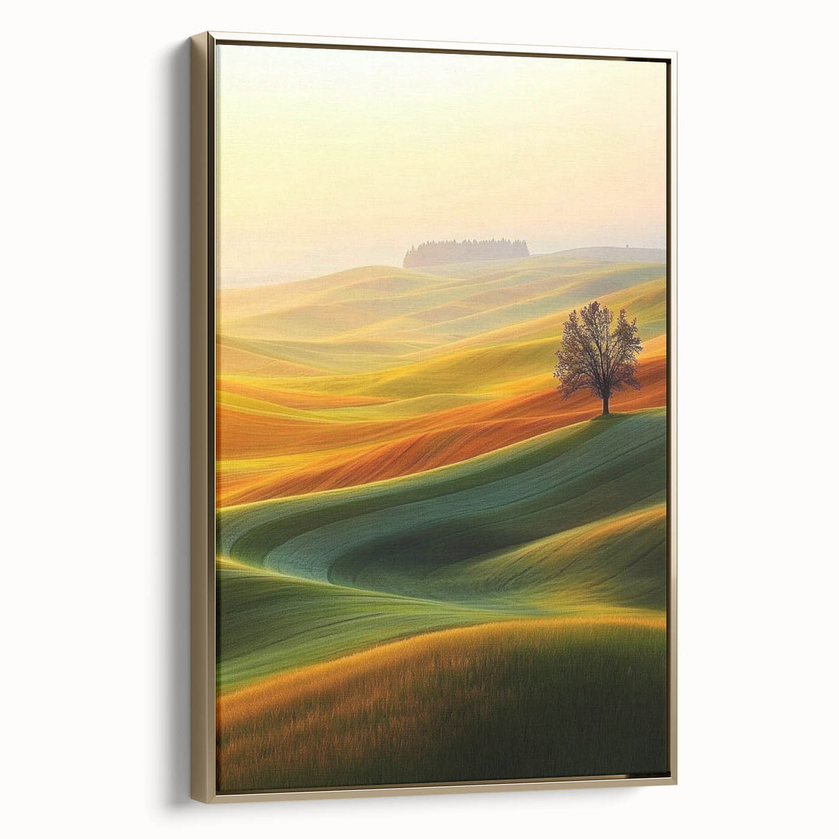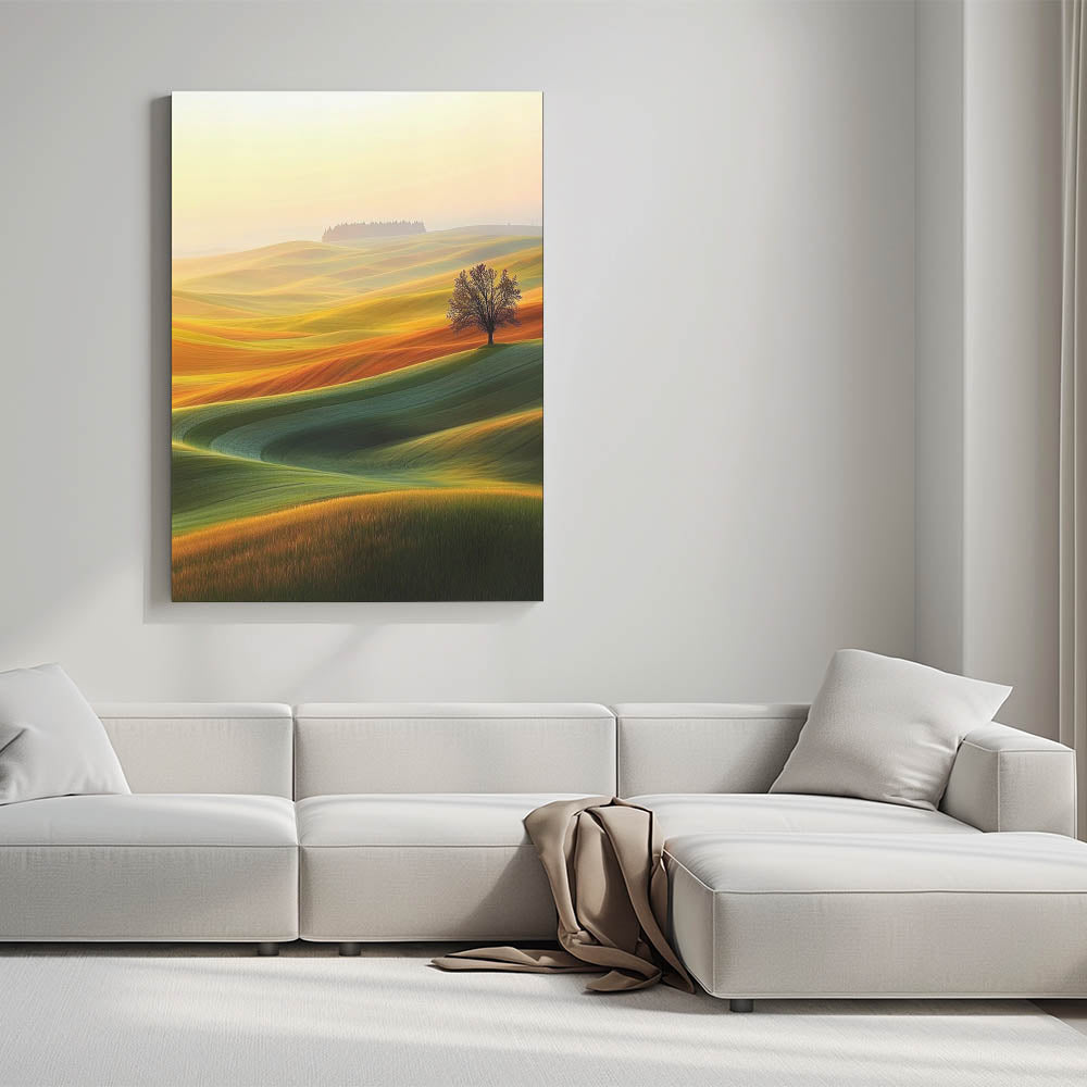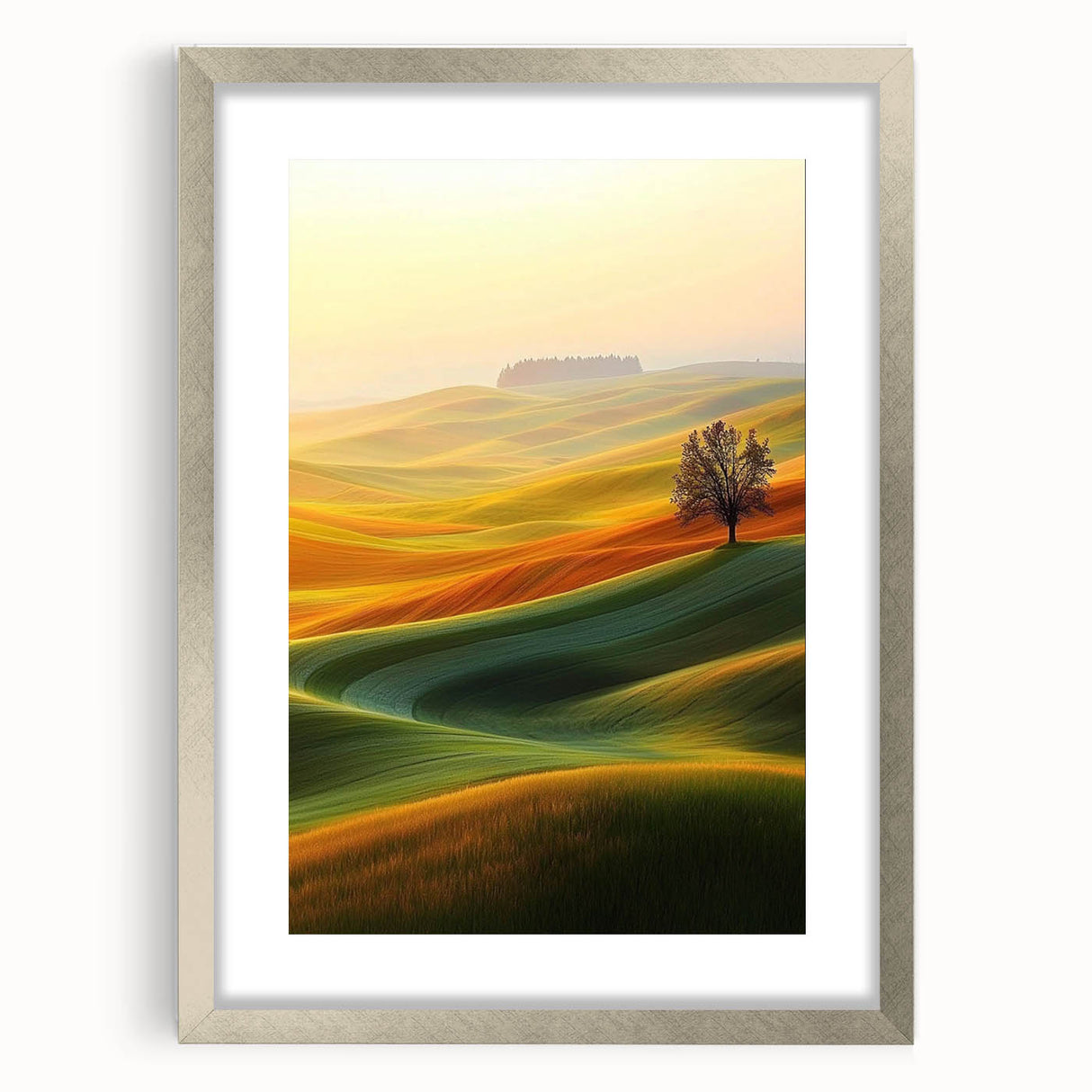 Step into a world of peaceful beauty with this tree art print, featuring a solitary tree standing amidst rolling golden and green hills bathed in soft sunlight. The natural flow of colors and gentle light creates a nature-inspired wall art piece that brings warmth, serenity, and depth to any space.