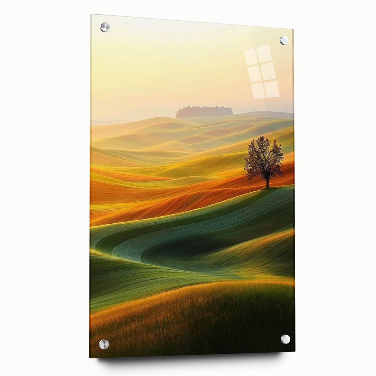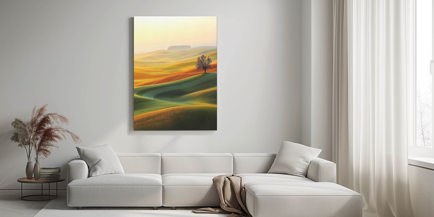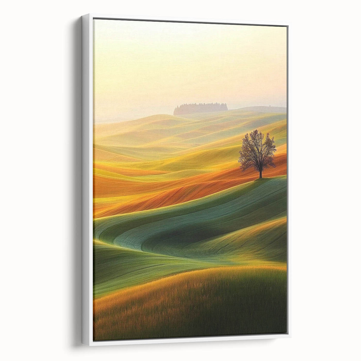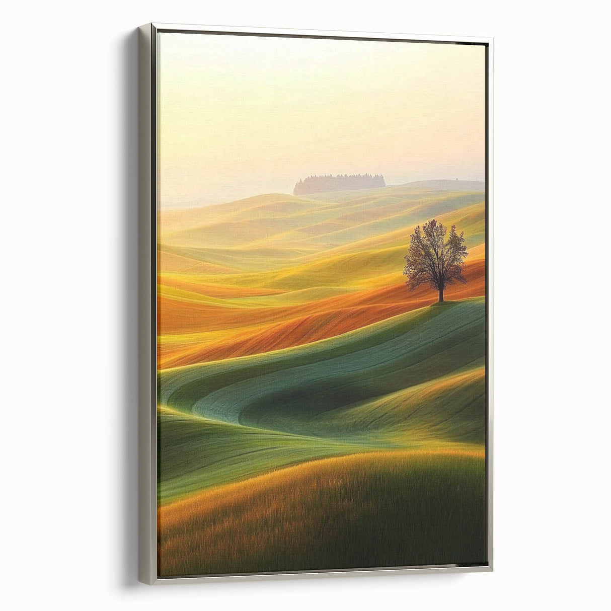 Step into a world of peaceful beauty with this tree art print, featuring a solitary tree standing amidst rolling golden and green hills bathed in soft sunlight. The natural flow of colors and gentle light creates a nature-inspired wall art piece that brings warmth, serenity, and depth to any space.