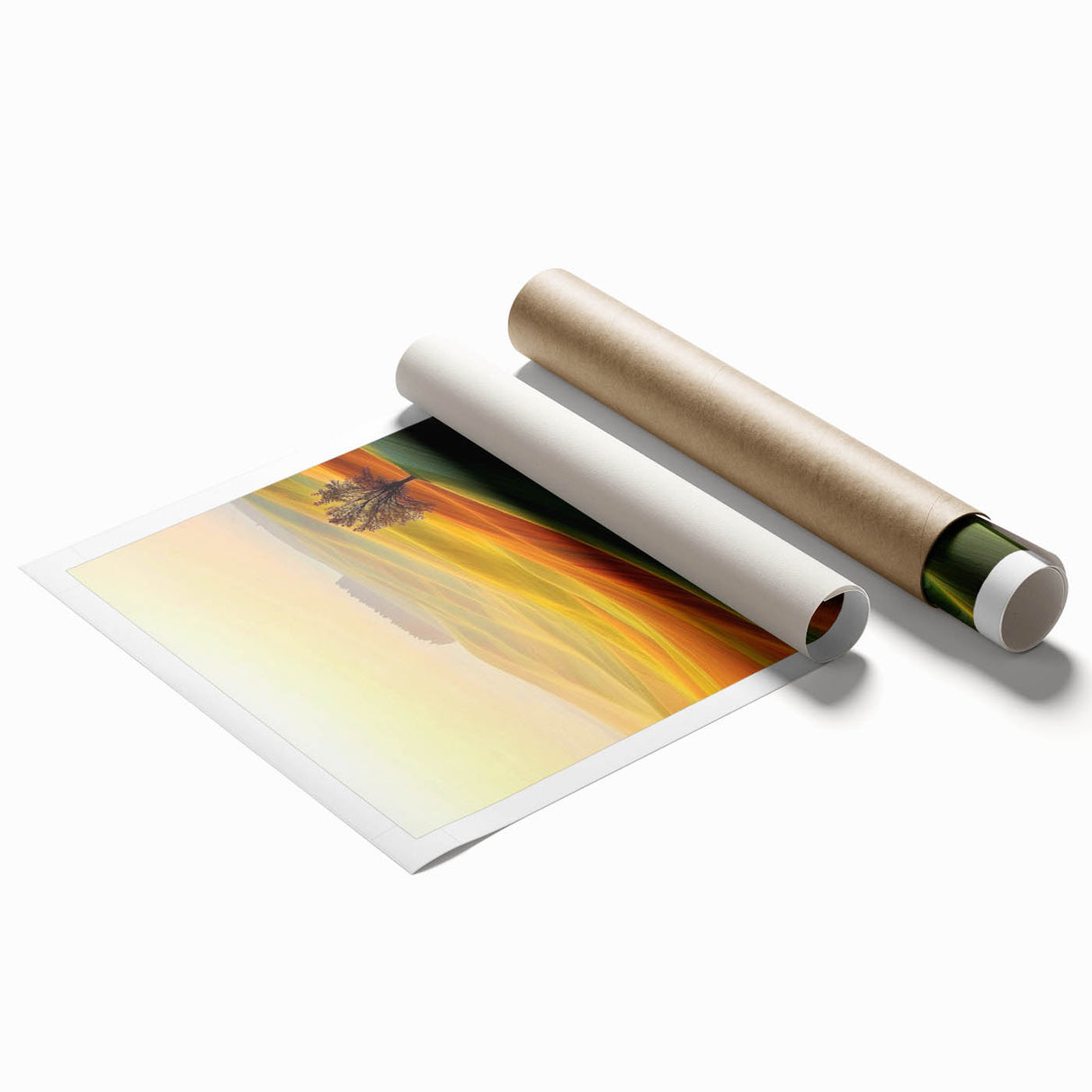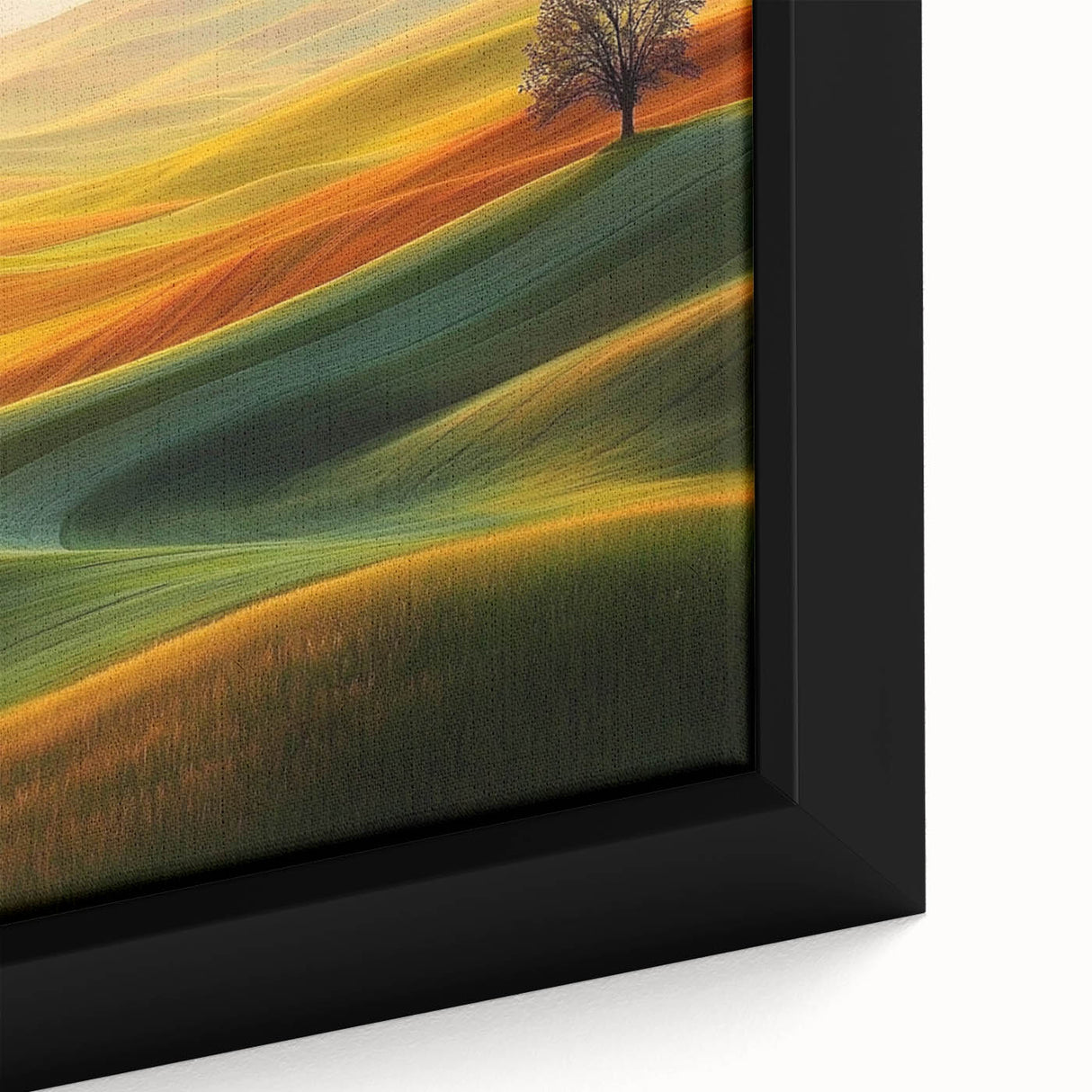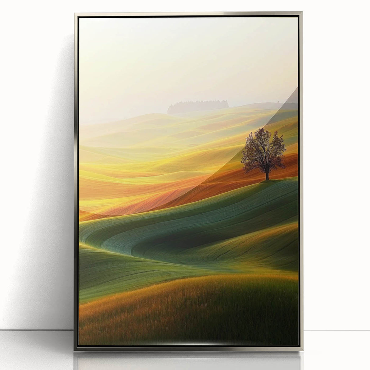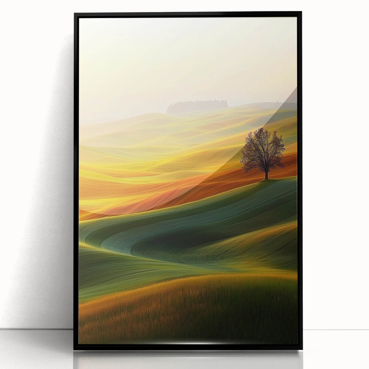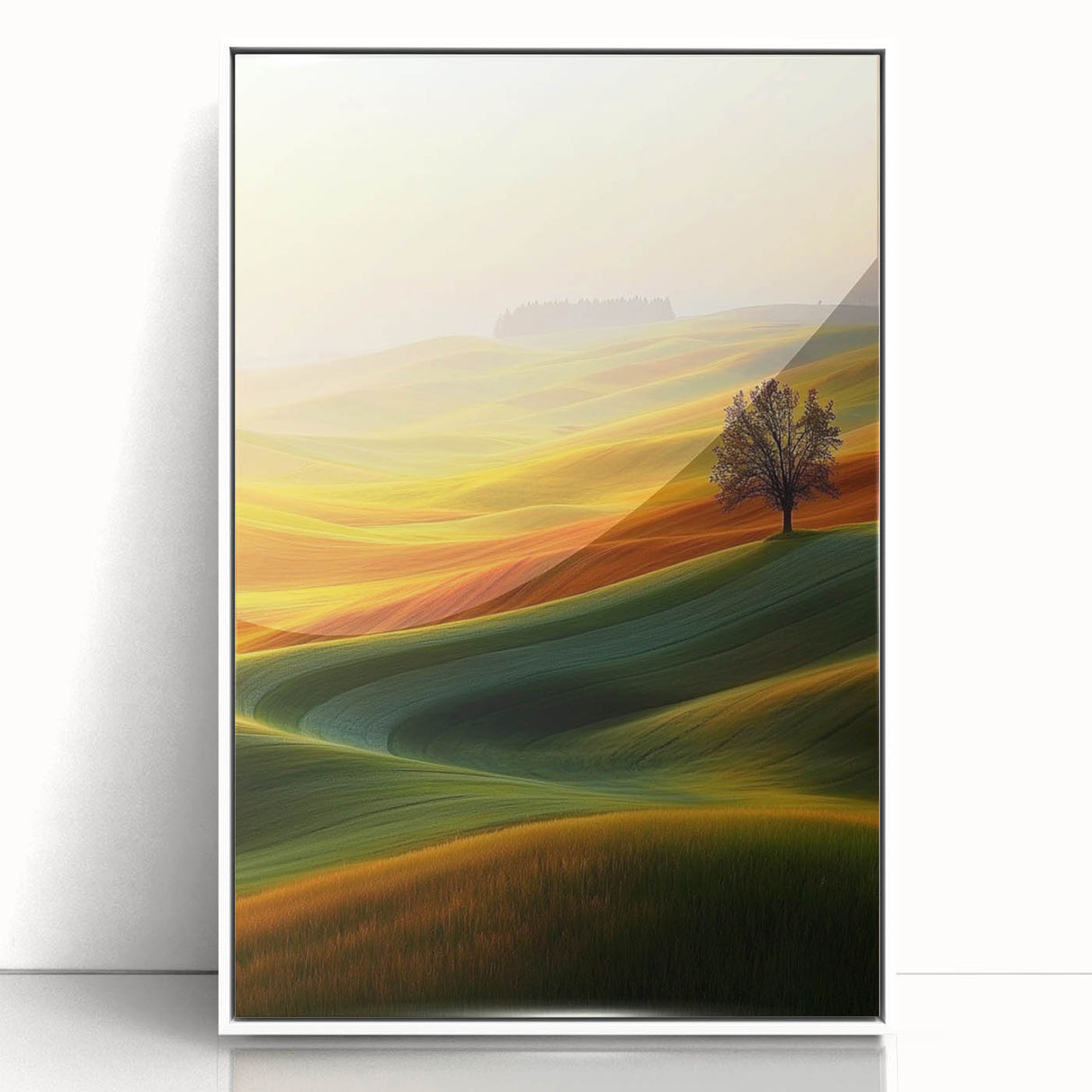 Step into a world of peaceful beauty with this tree art print, featuring a solitary tree standing amidst rolling golden and green hills bathed in soft sunlight. The natural flow of colors and gentle light creates a nature-inspired wall art piece that brings warmth, serenity, and depth to any space.