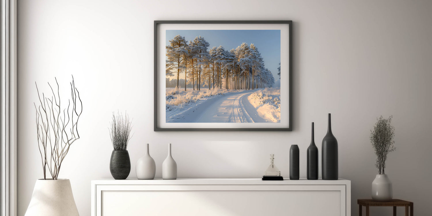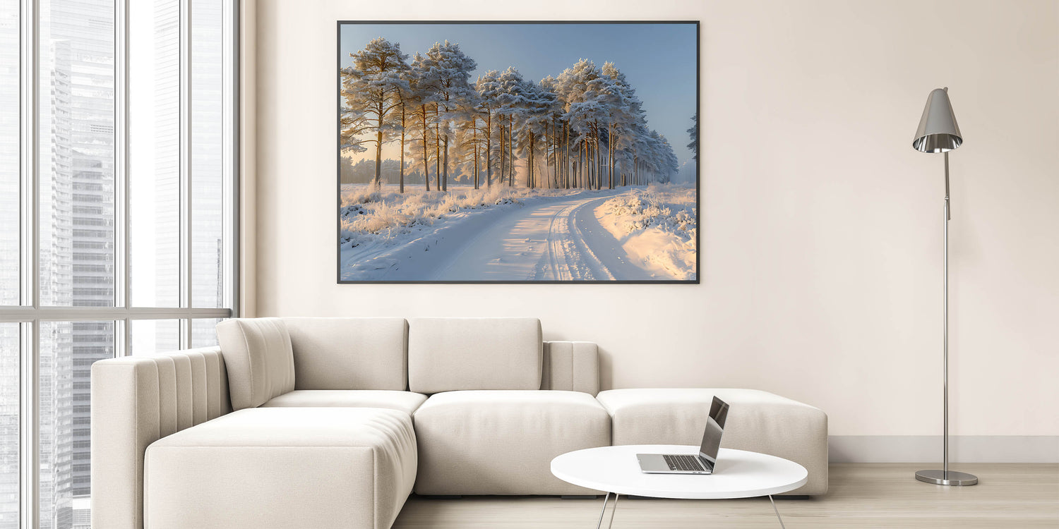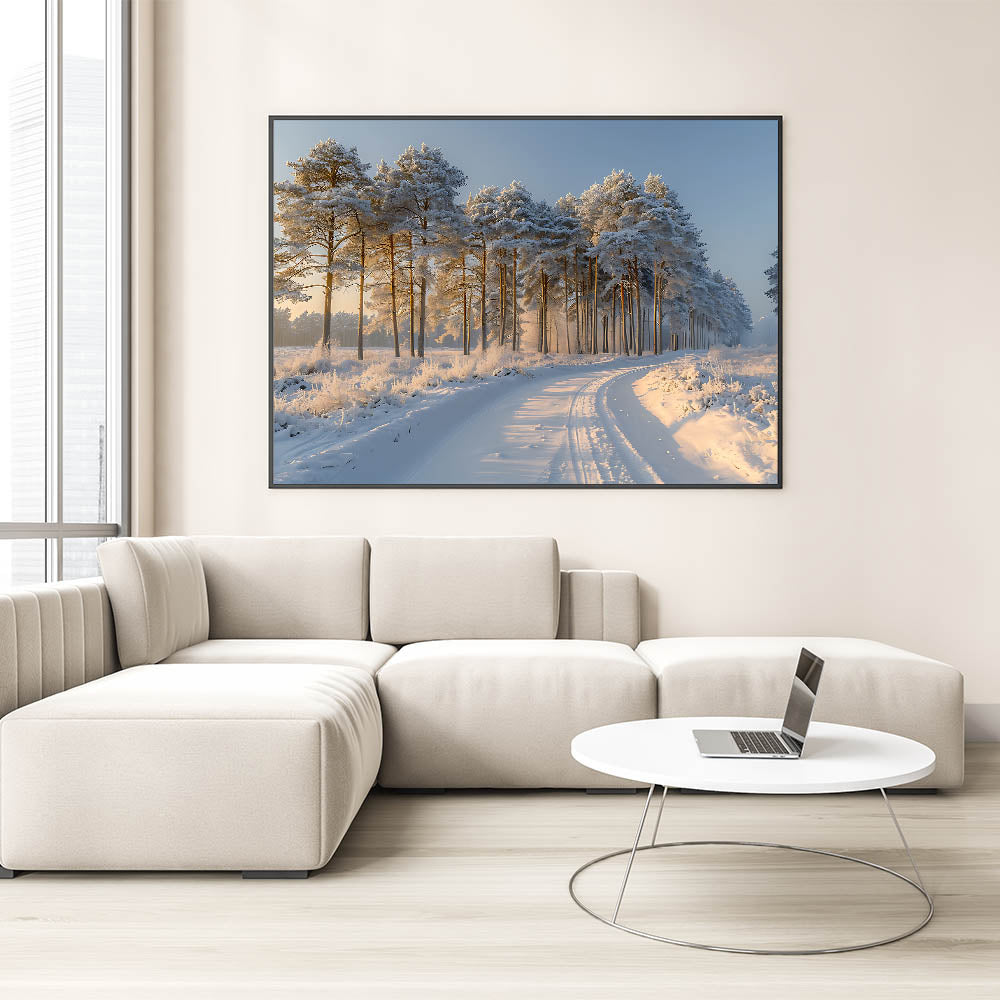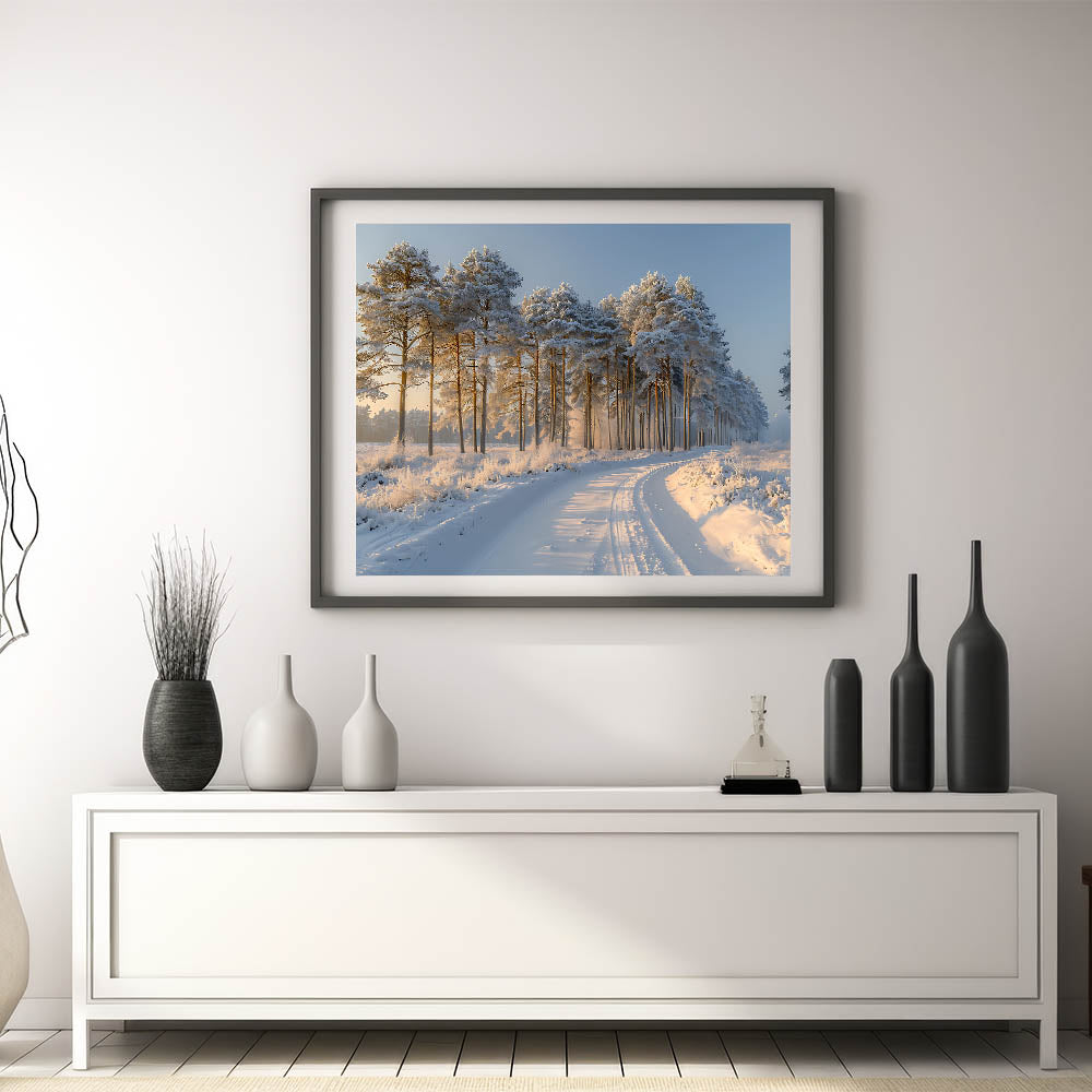 Capture the tranquil beauty of a winter morning with this exquisite golden hour winter path tree wall art. This artwork features a serene, snow-covered path winding through a forest of tall pines, gently kissed by the warm light of the rising sun. The golden sunlight contrasts beautifully with the crisp white snow and the soft blue sky, creating a peaceful and inviting atmosphere.