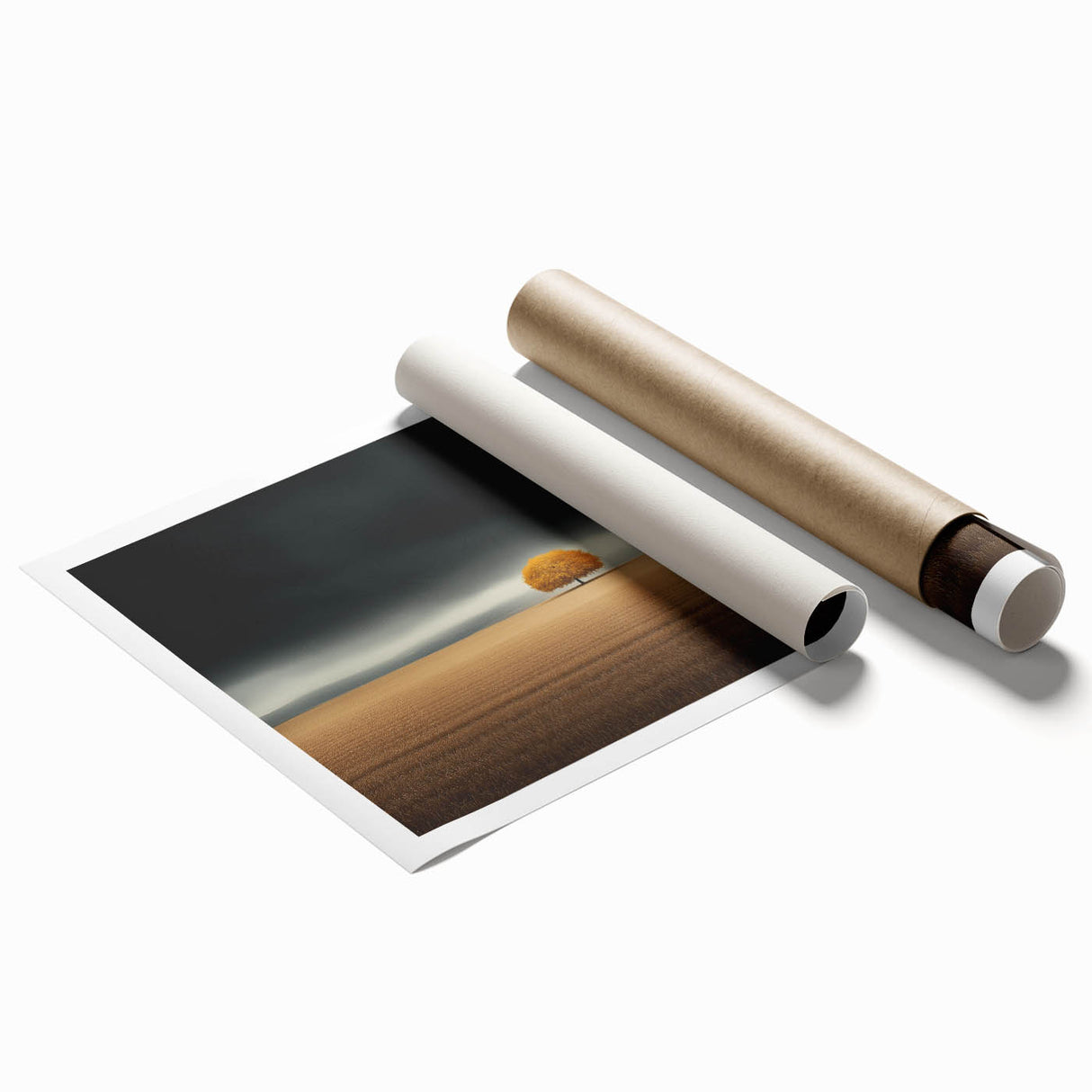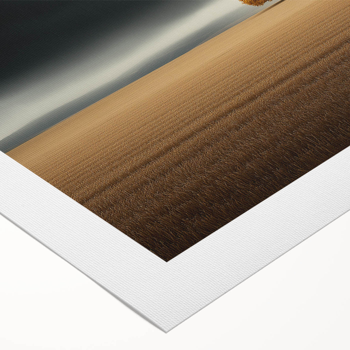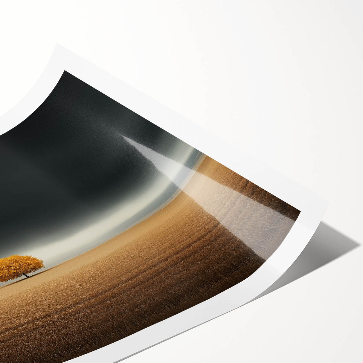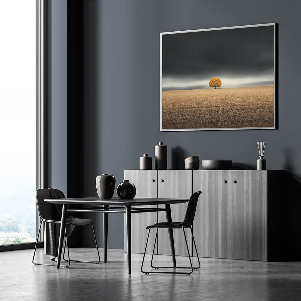 Capture the beauty of contrast with this striking tree art print, featuring a solitary golden tree standing in a vast wheat field under a dramatic dark sky. The deep interplay of gold, black, and beige creates a powerful yet serene ambiance, making this landscape art print an unforgettable addition to any space. Whether you love nature-inspired wall art or are drawn to bold and moody scenery, this forest art print is a masterpiece of depth and emotion.