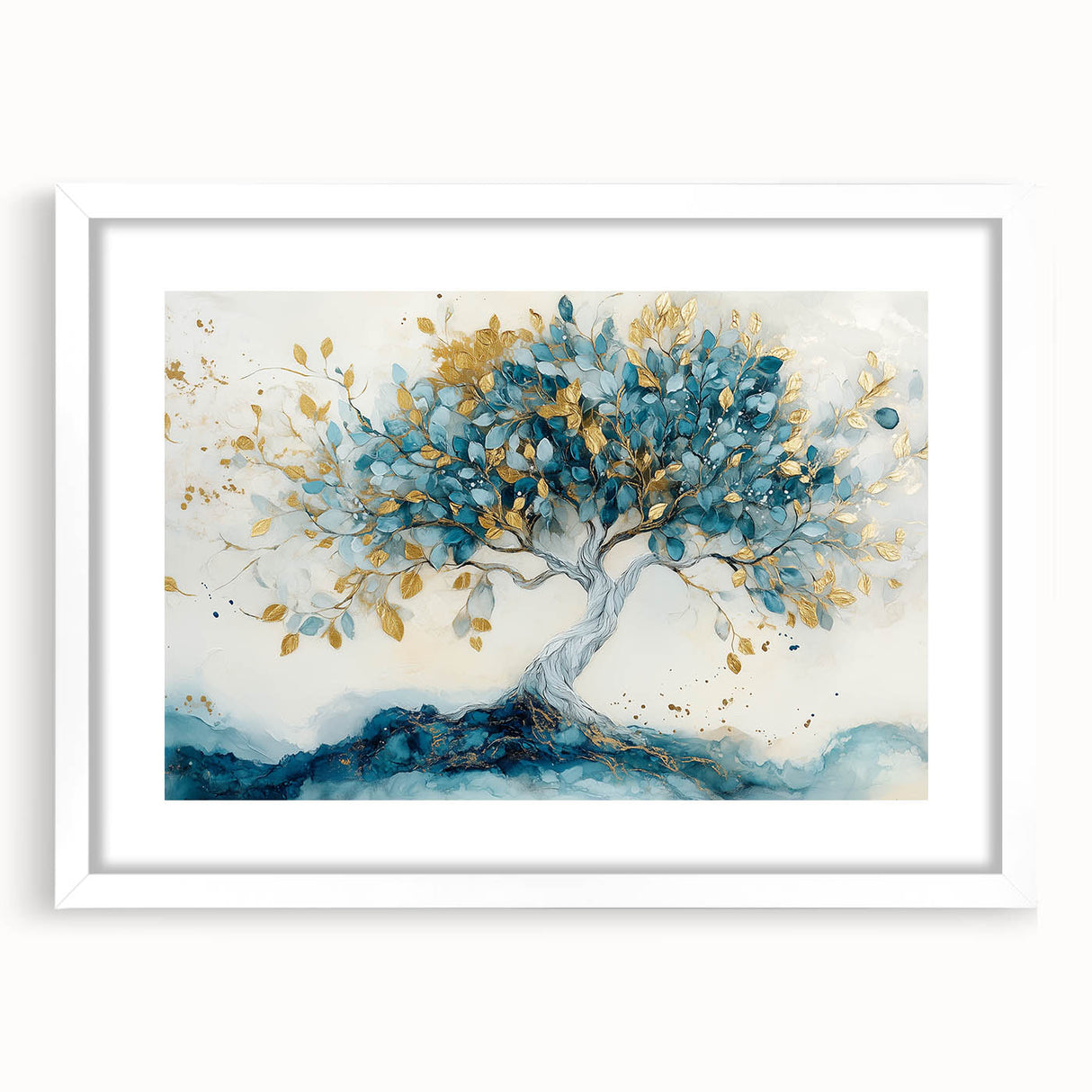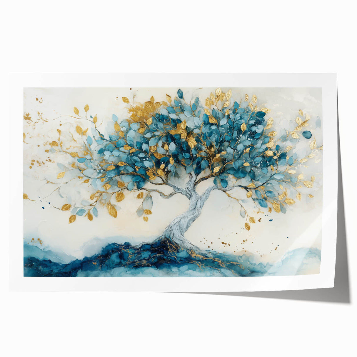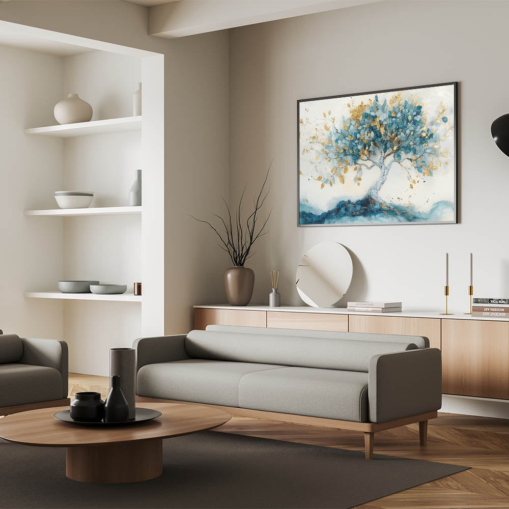 Bring elegance and tranquility into your space with this tree art print, featuring a majestic tree with flowing teal leaves and shimmering gold accents. The soft, abstract background enhances the tree’s intricate details, creating a nature-inspired wall art piece that blends luxury with organic beauty.