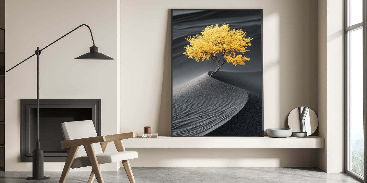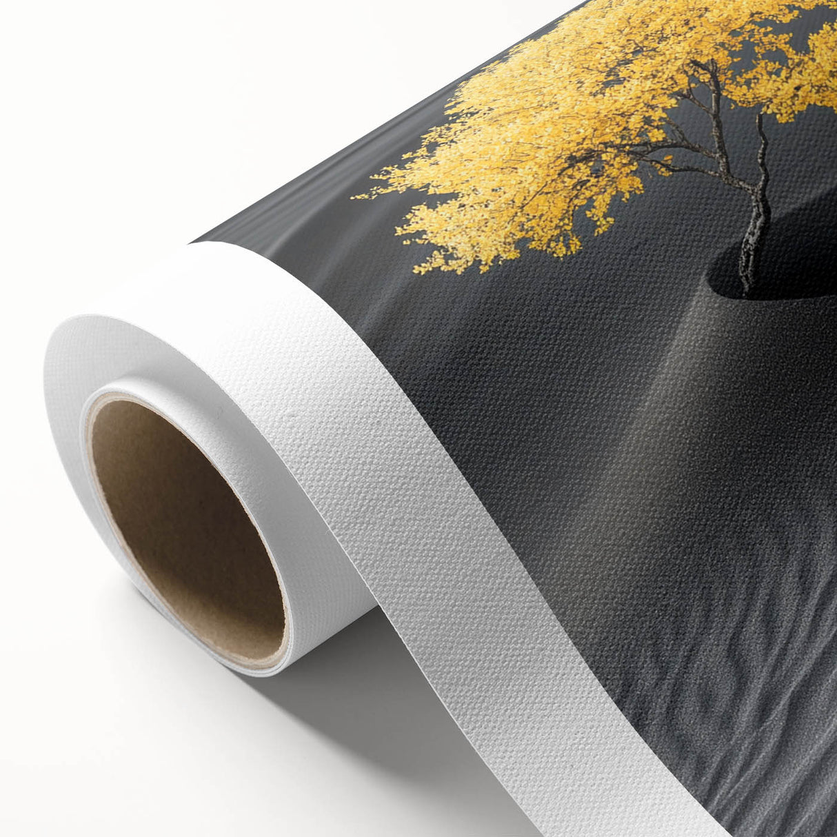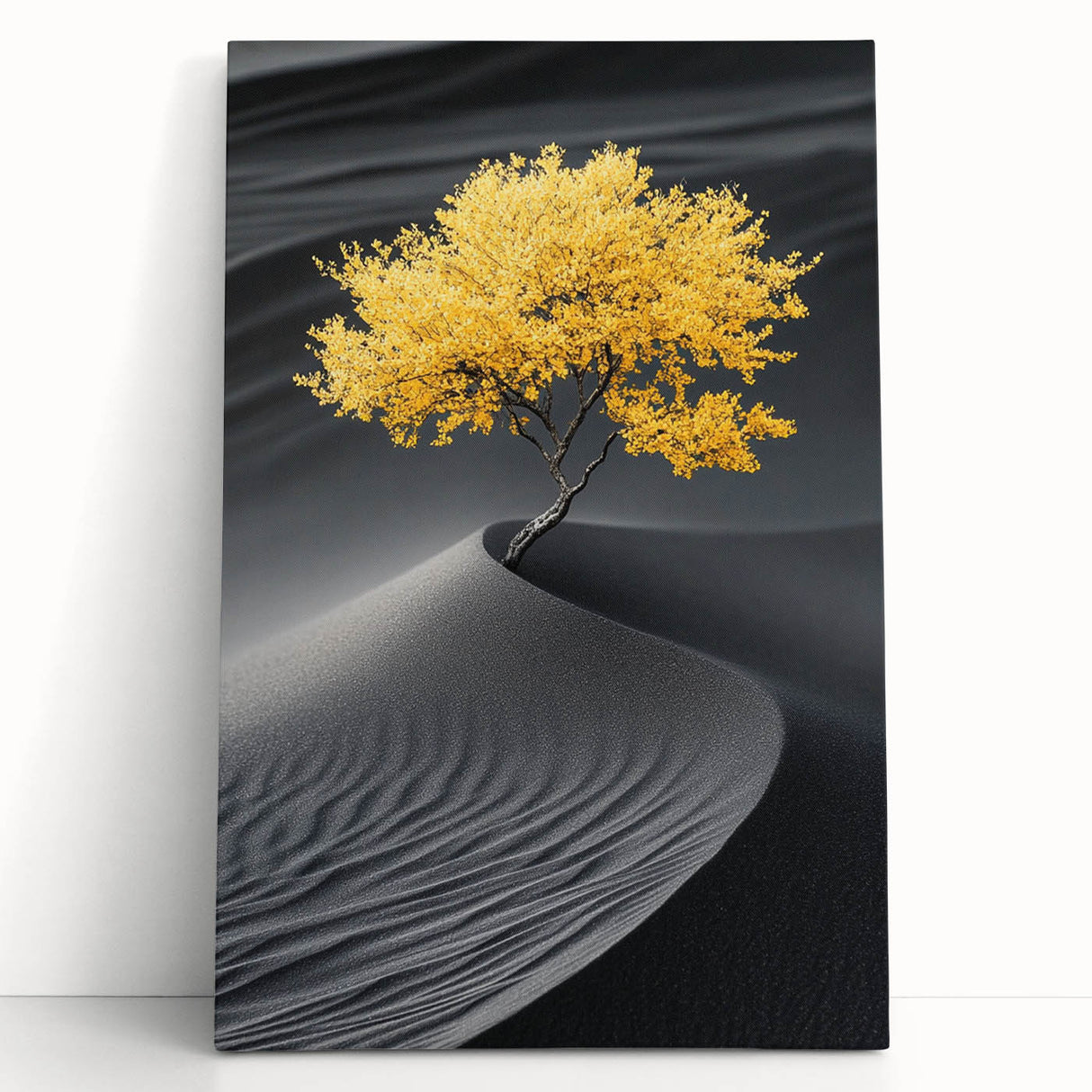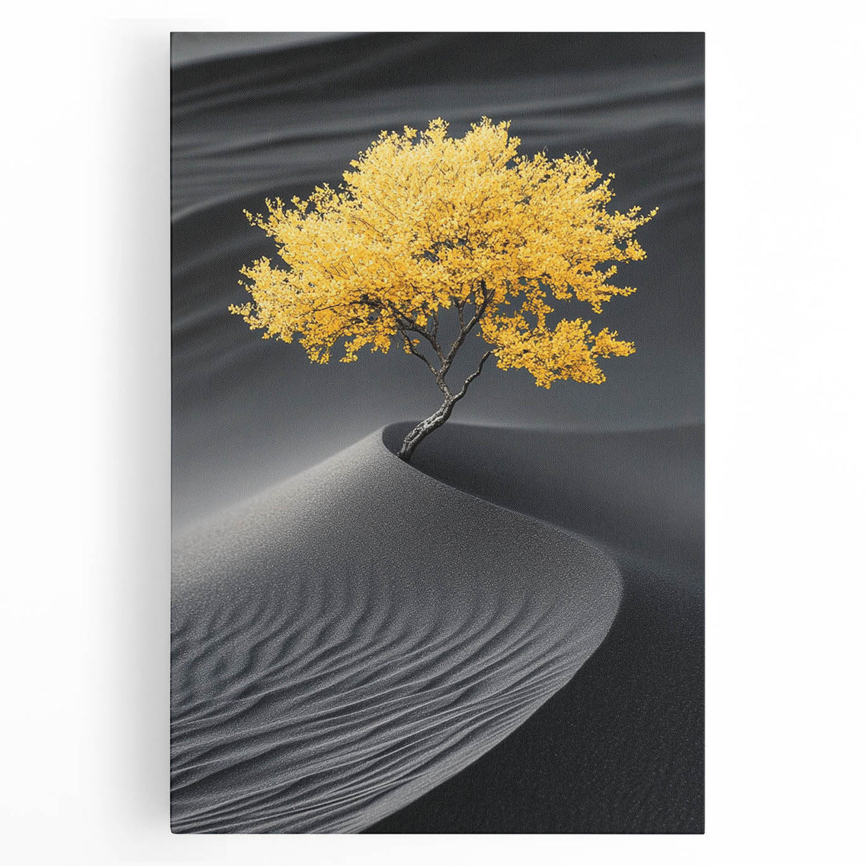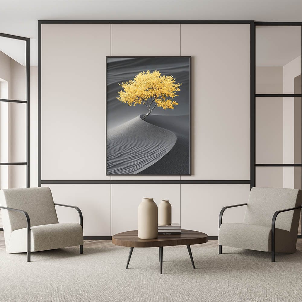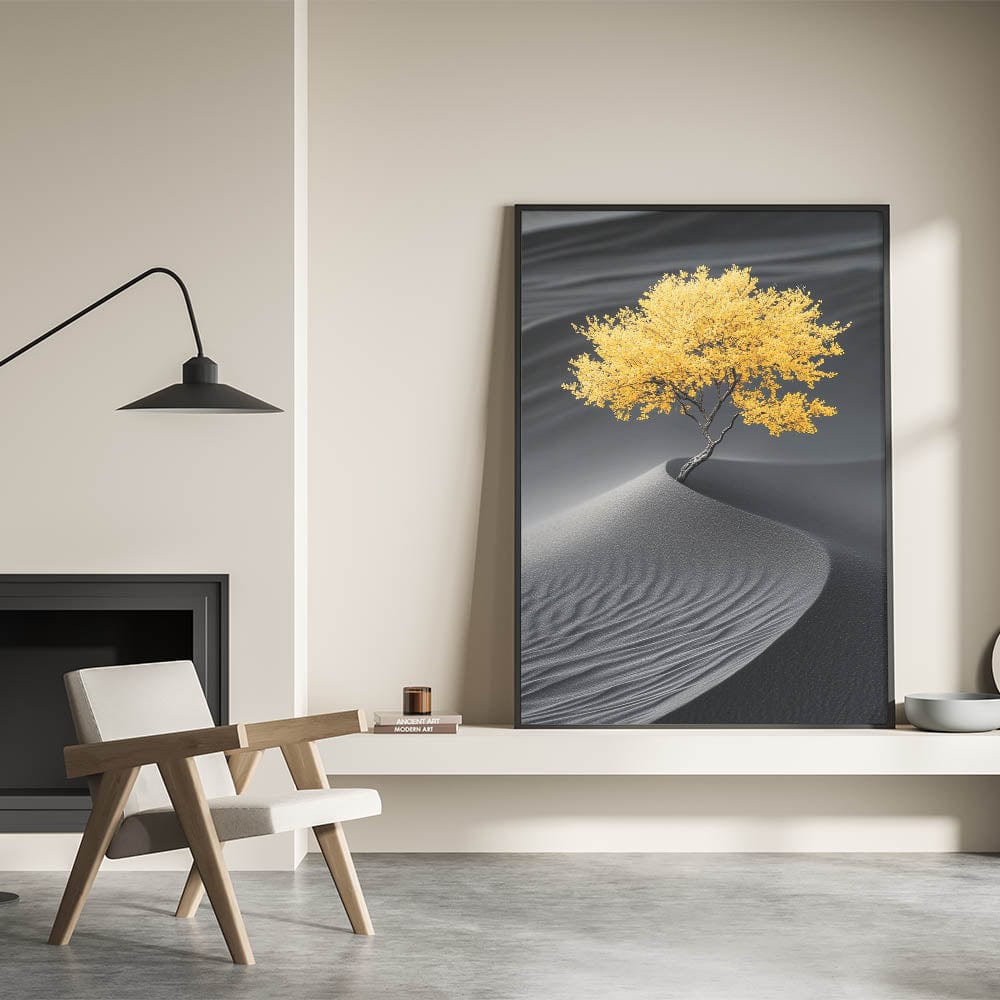 Bring a bold contrast to your space with this stunning golden tree art print, featuring a lone yellow tree standing in a surreal black desert. This nature-inspired wall art captures the essence of resilience, growth, and beauty amidst a stark landscape, making it a perfect centerpiece for modern and contemporary interiors.