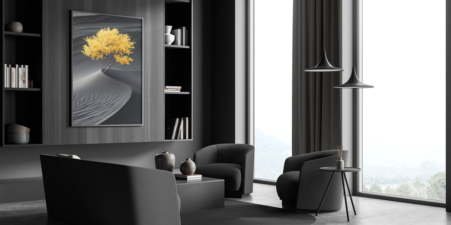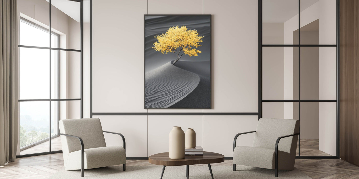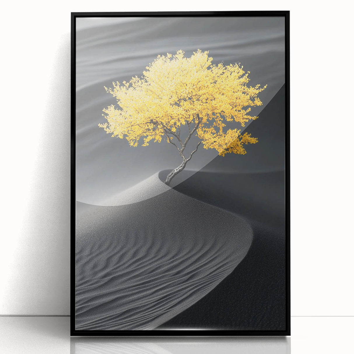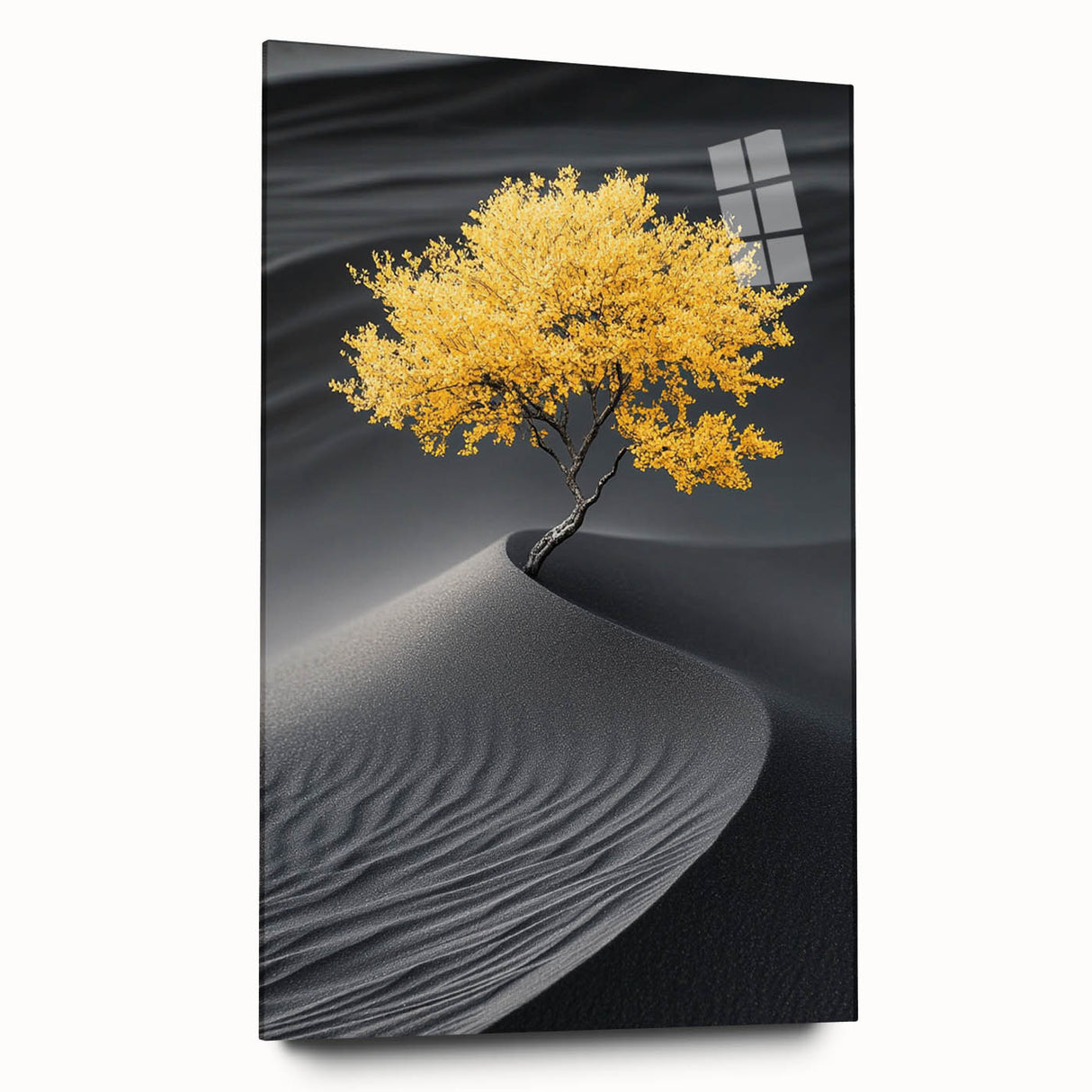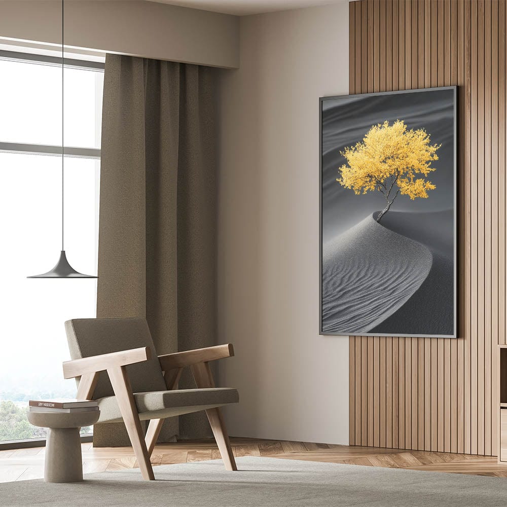 Bring a bold contrast to your space with this stunning golden tree art print, featuring a lone yellow tree standing in a surreal black desert. This nature-inspired wall art captures the essence of resilience, growth, and beauty amidst a stark landscape, making it a perfect centerpiece for modern and contemporary interiors.