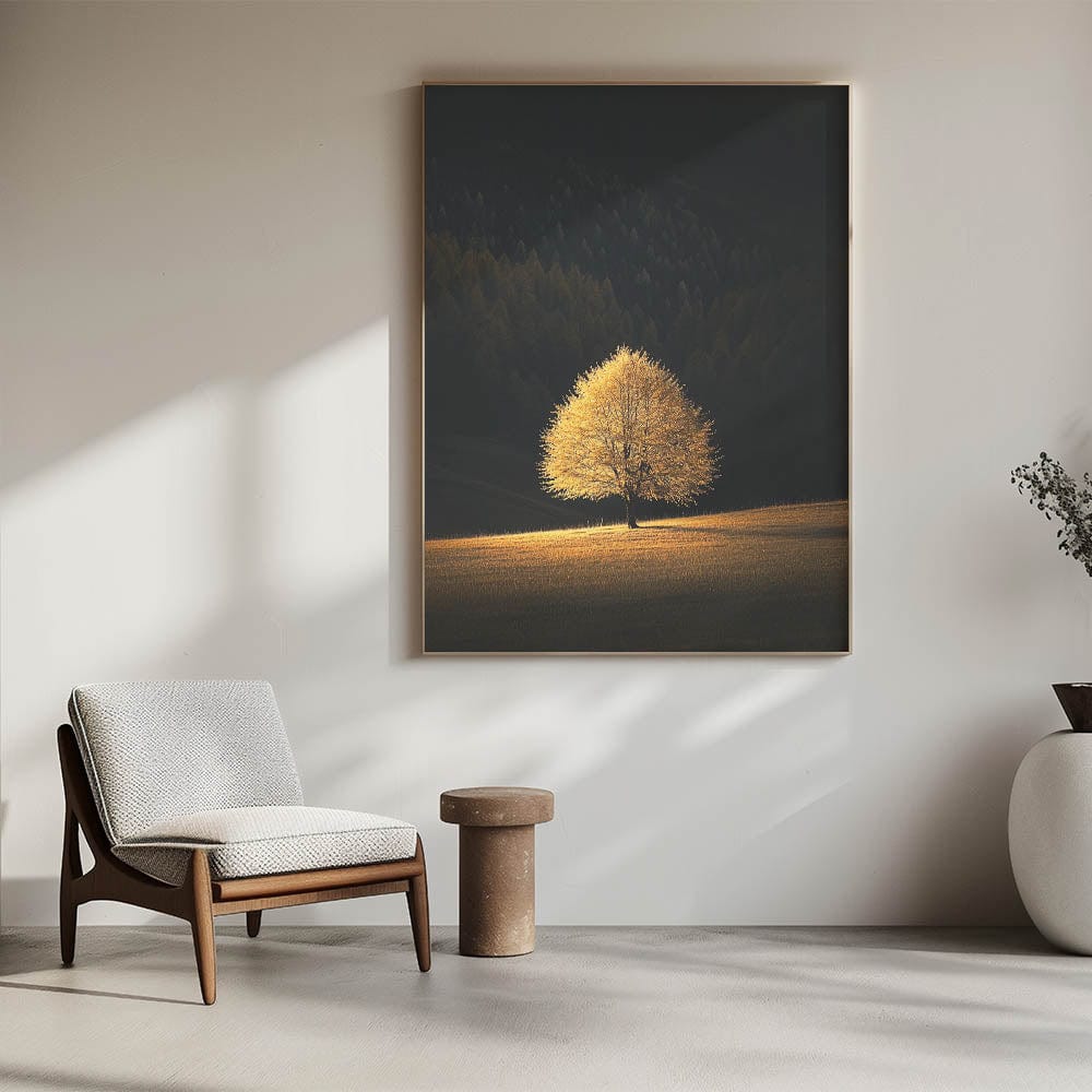 Illuminate your space with this Tree Art Print, featuring a stunning golden tree bathed in warm sunlight against a deep forest backdrop. This captivating composition creates a striking contrast between light and shadow, making it an ideal Nature-Inspired Wall Art piece for those who appreciate elegant and dramatic landscapes. The glowing tree stands alone in an open field, exuding a sense of strength, beauty, and tranquility.