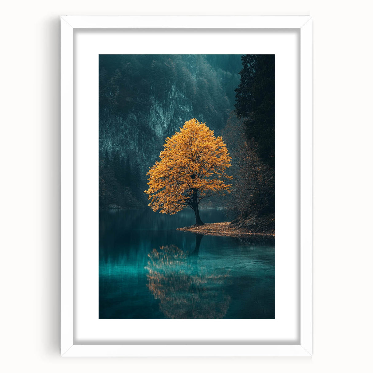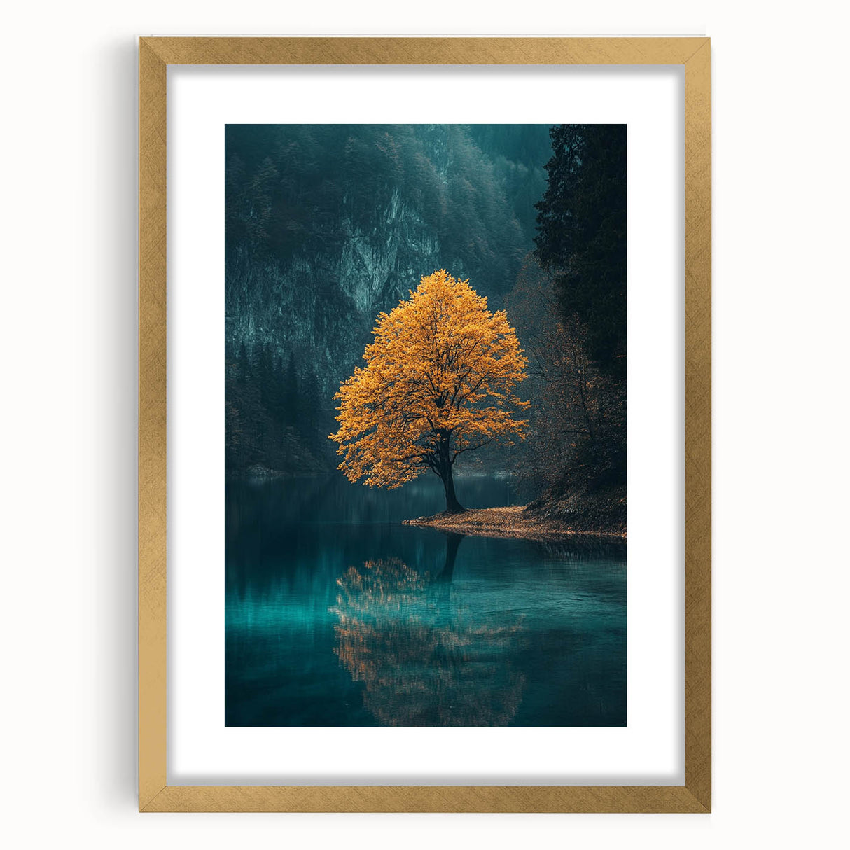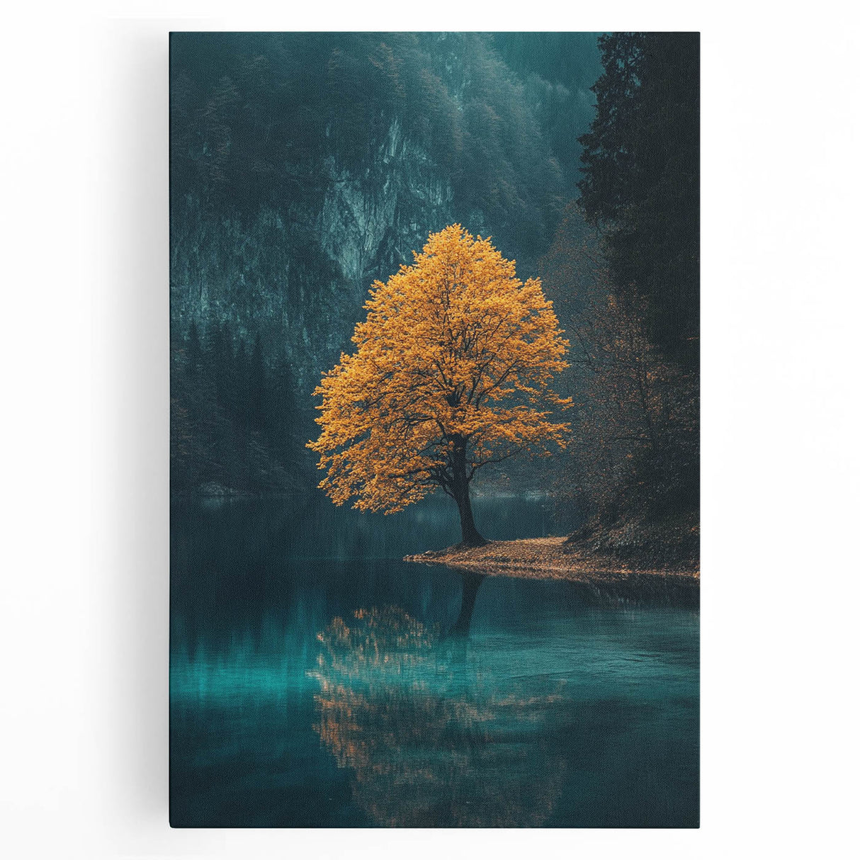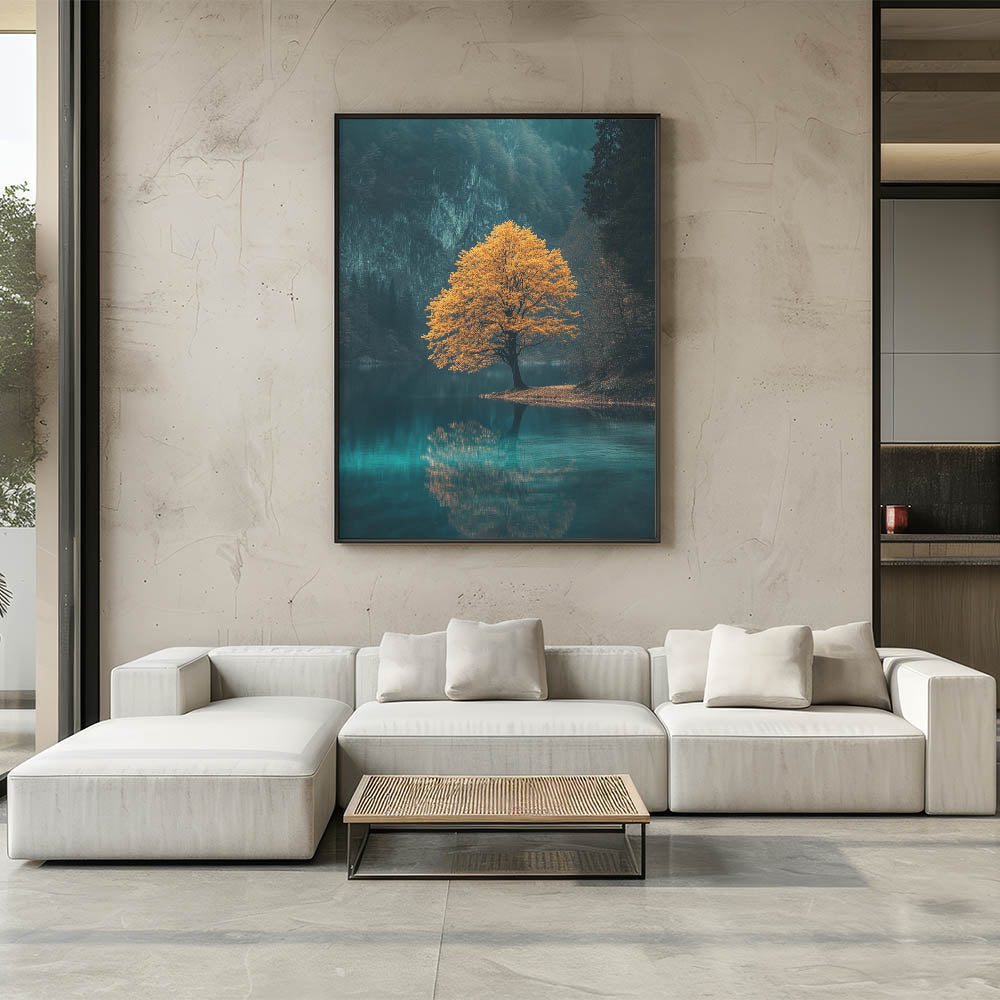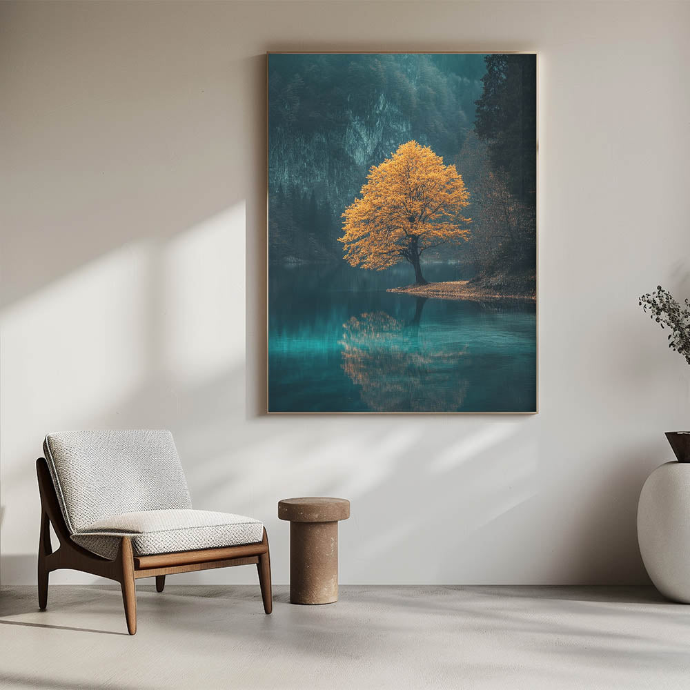 Step into a world of serenity with this tree art print, featuring a golden-yellow tree standing on a small island, beautifully reflected in a deep teal lake. The contrast between the vibrant foliage and the cool, moody mountain backdrop creates a breathtaking nature-inspired wall art piece that exudes tranquility and elegance.