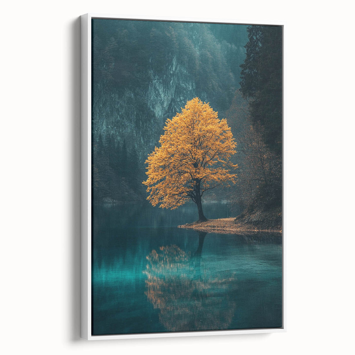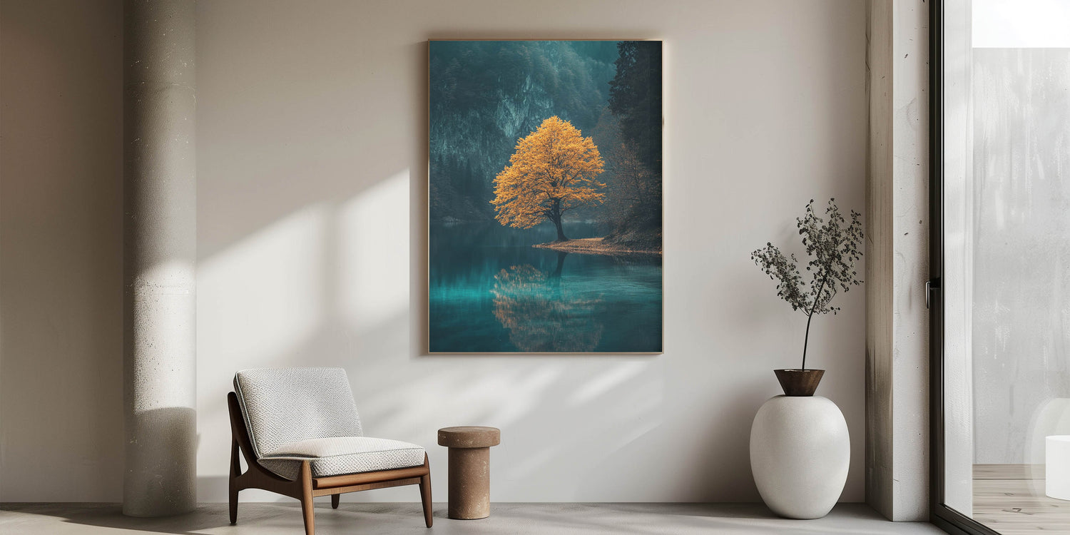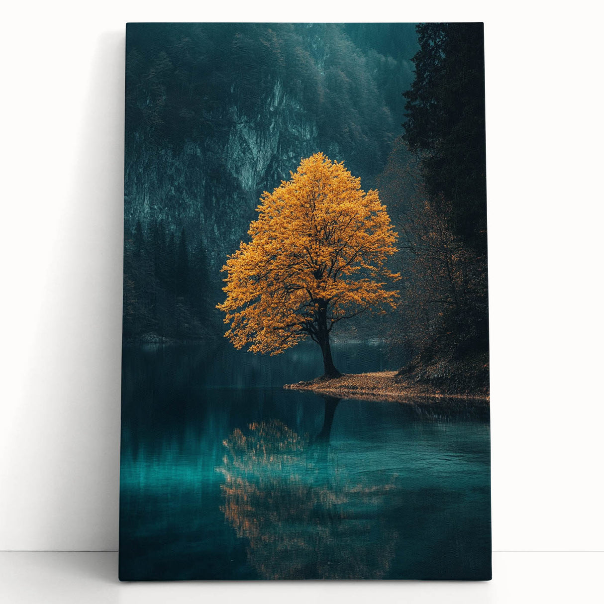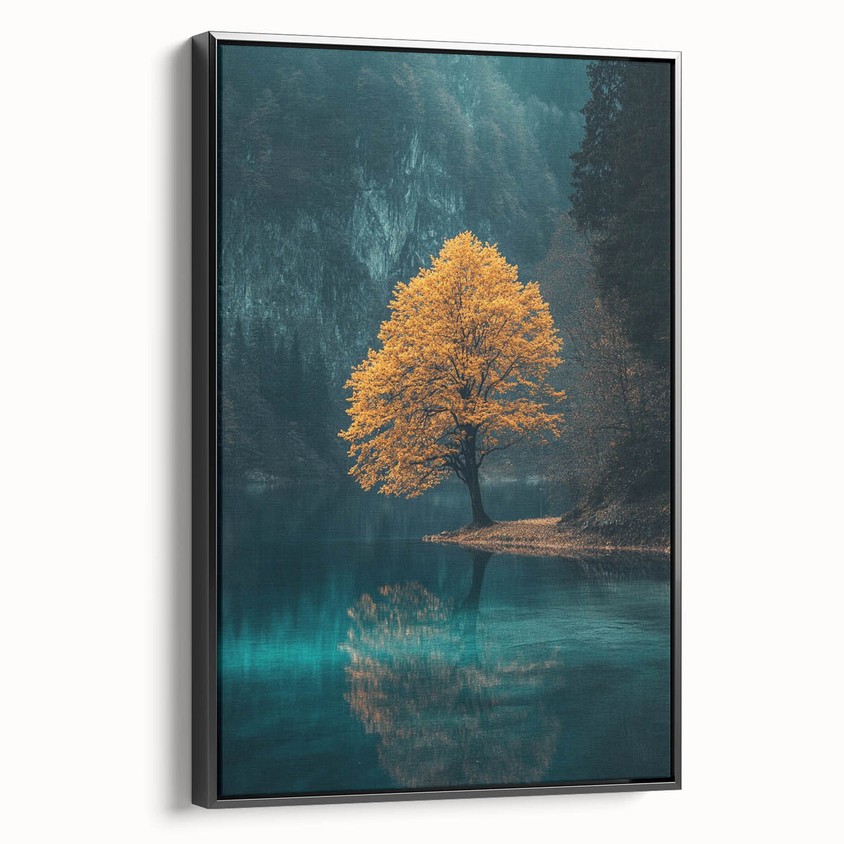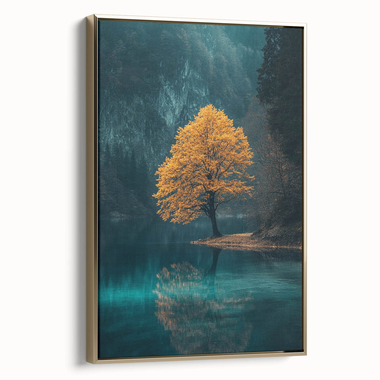 Step into a world of serenity with this tree art print, featuring a golden-yellow tree standing on a small island, beautifully reflected in a deep teal lake. The contrast between the vibrant foliage and the cool, moody mountain backdrop creates a breathtaking nature-inspired wall art piece that exudes tranquility and elegance.