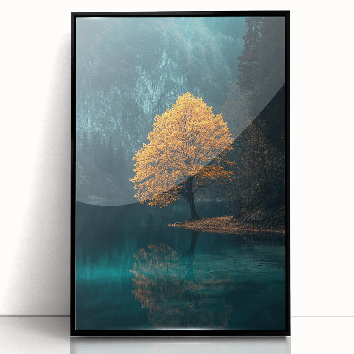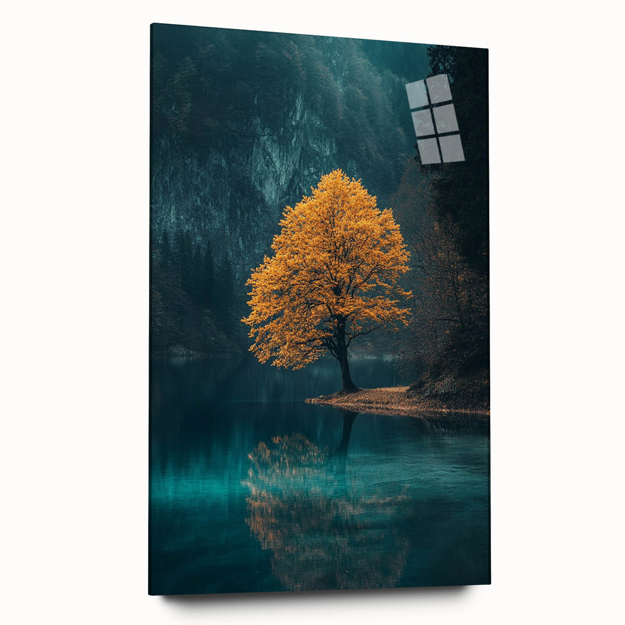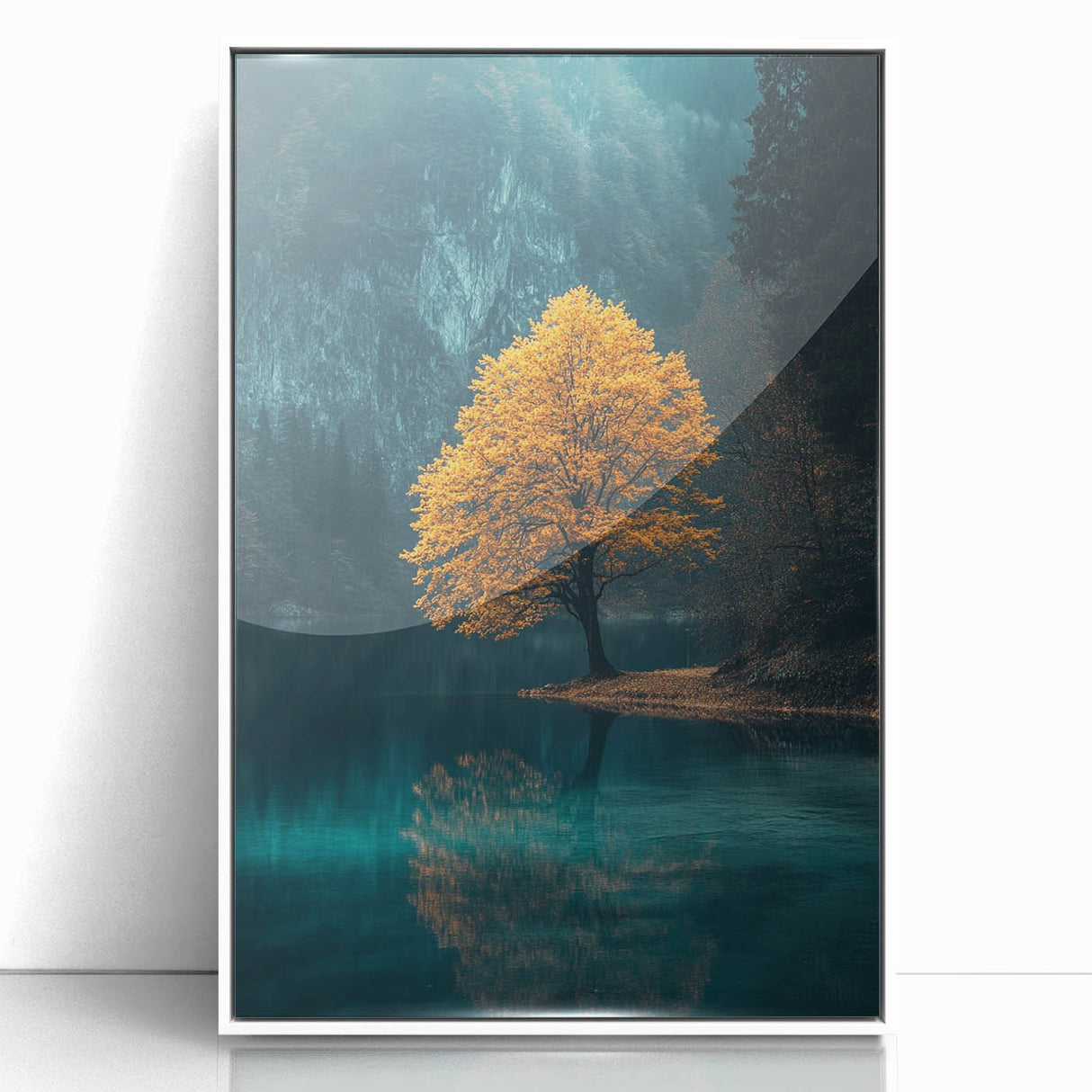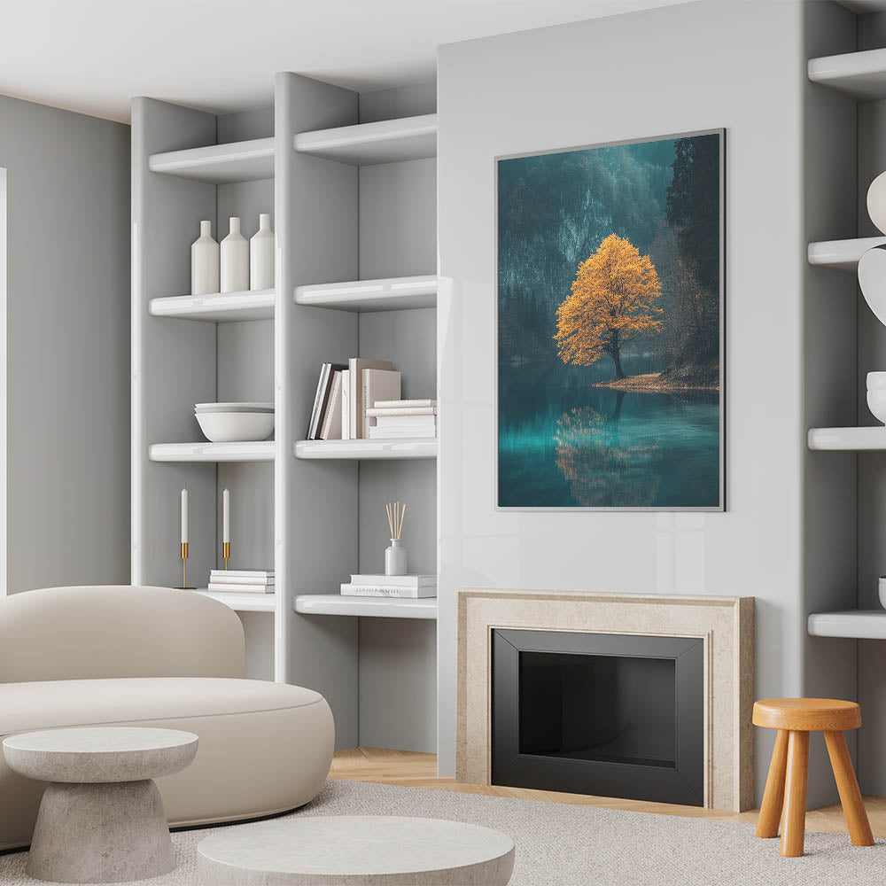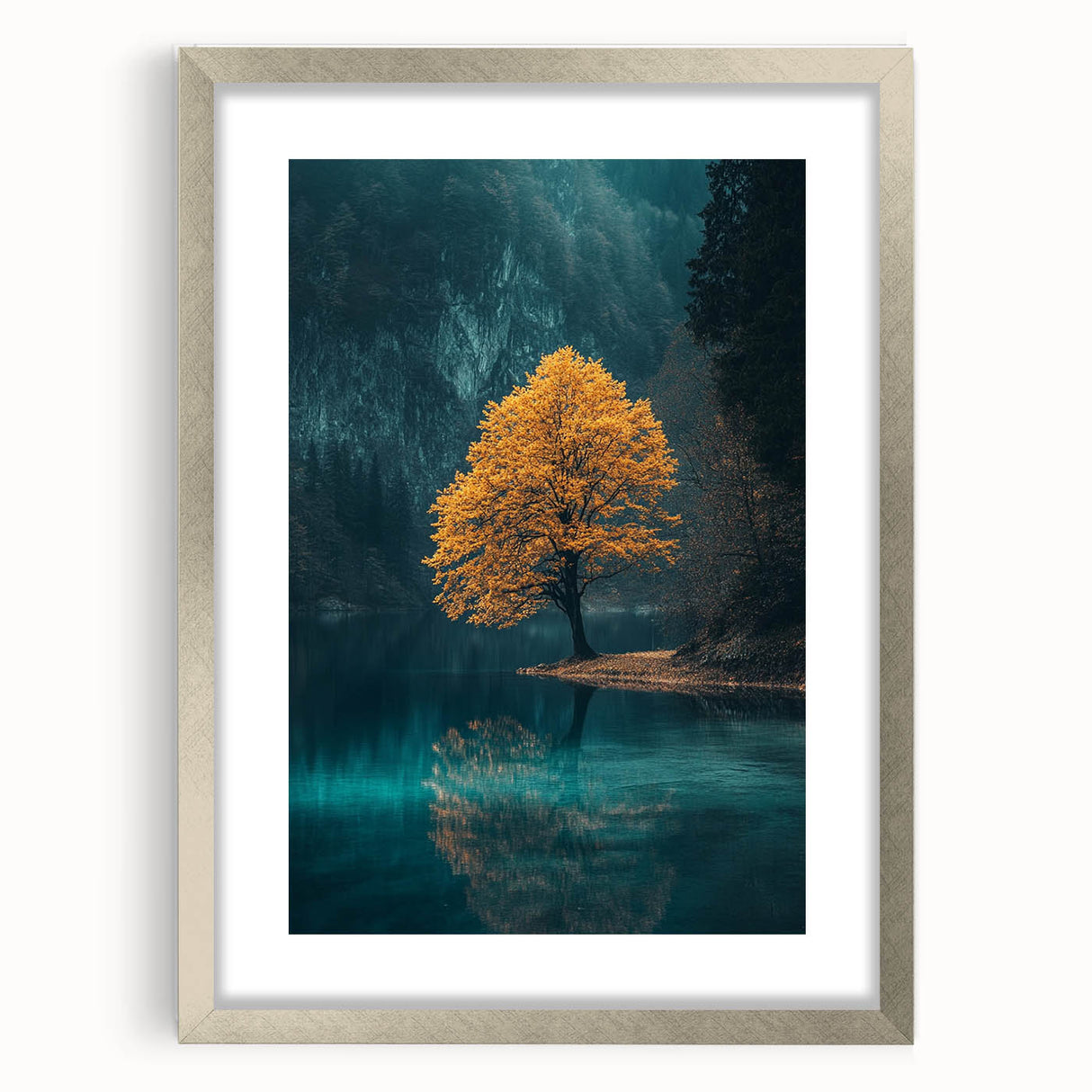 Step into a world of serenity with this tree art print, featuring a golden-yellow tree standing on a small island, beautifully reflected in a deep teal lake. The contrast between the vibrant foliage and the cool, moody mountain backdrop creates a breathtaking nature-inspired wall art piece that exudes tranquility and elegance.