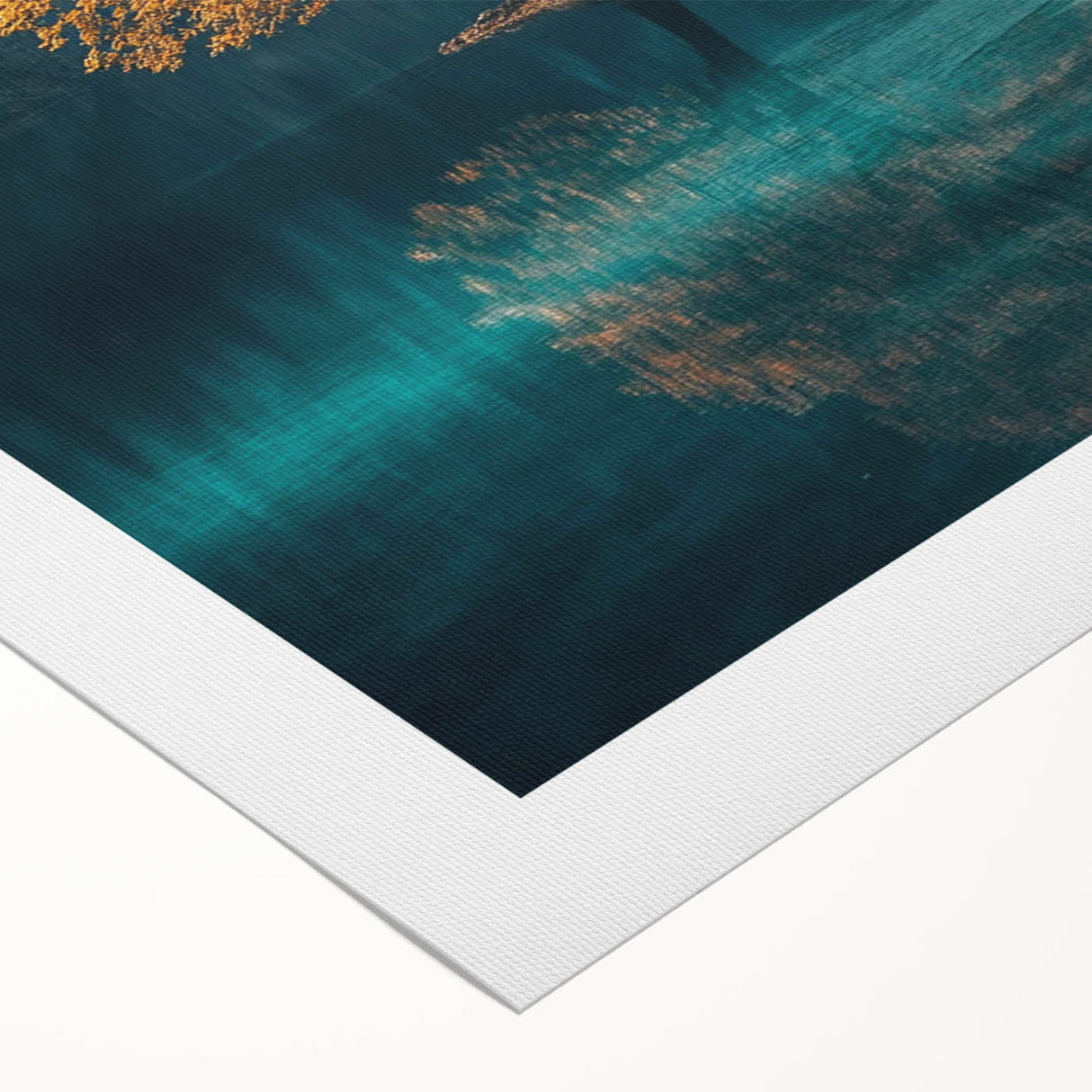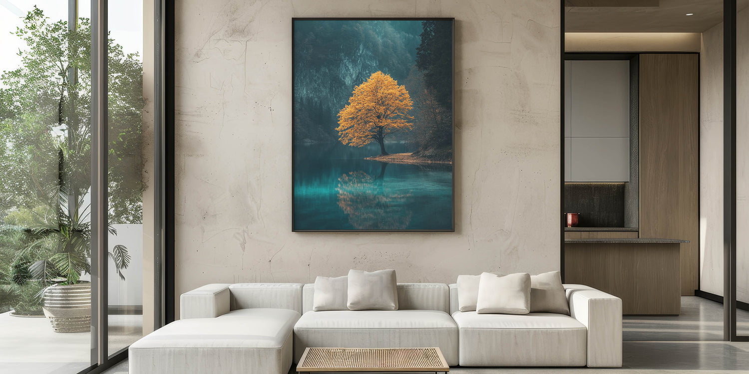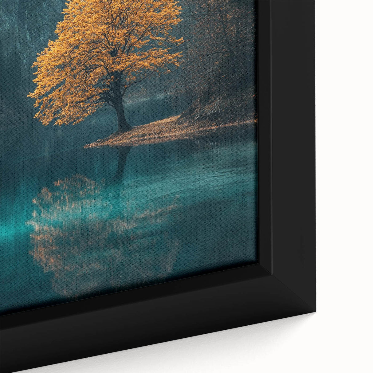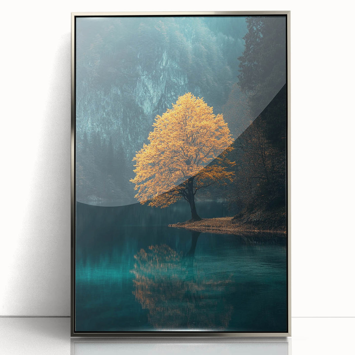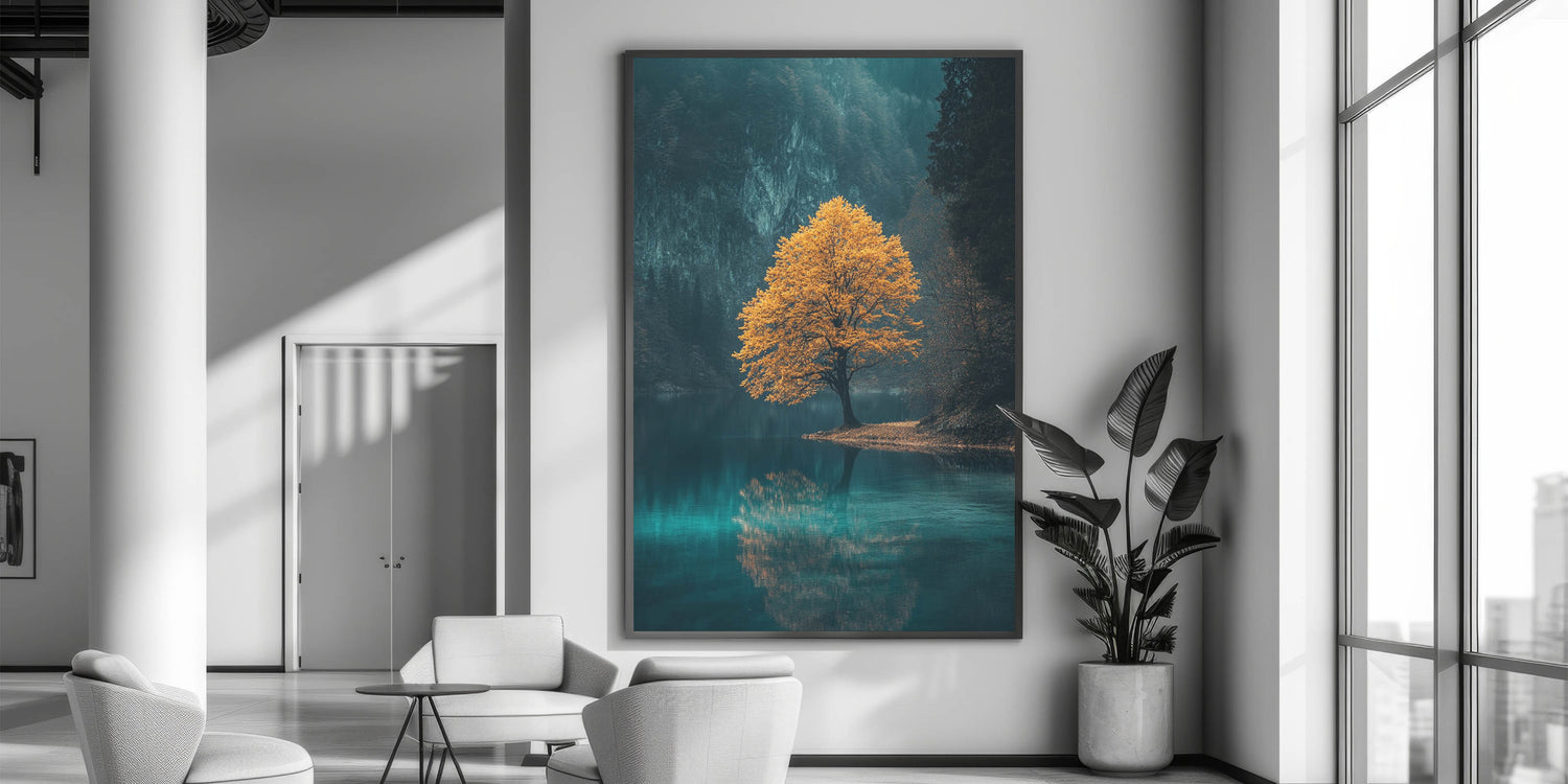 Step into a world of serenity with this tree art print, featuring a golden-yellow tree standing on a small island, beautifully reflected in a deep teal lake. The contrast between the vibrant foliage and the cool, moody mountain backdrop creates a breathtaking nature-inspired wall art piece that exudes tranquility and elegance.