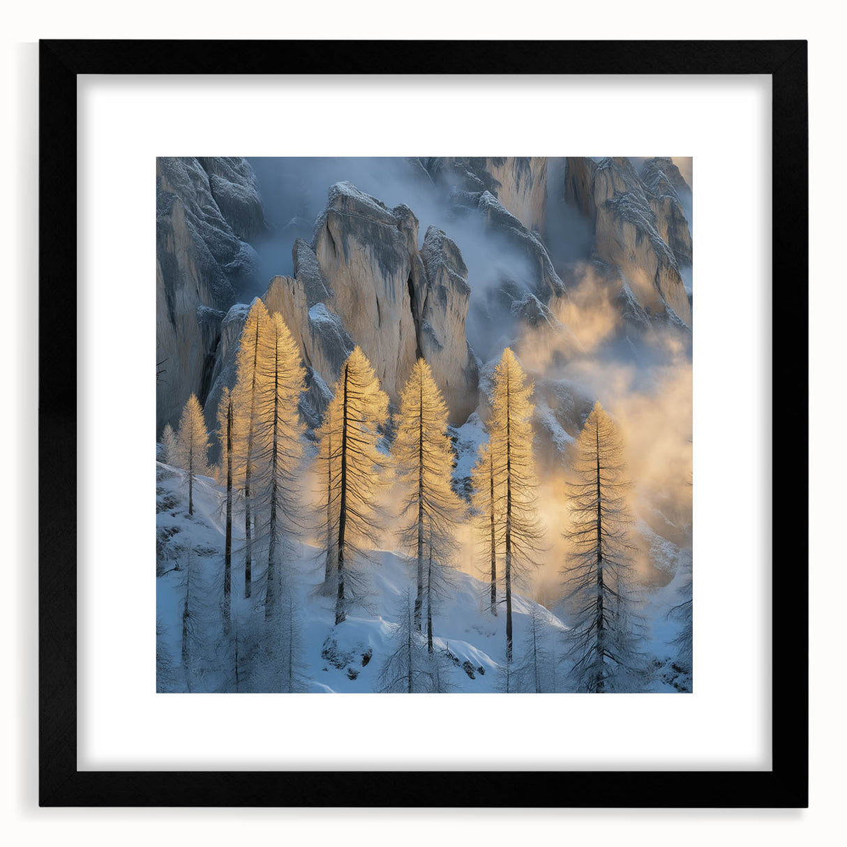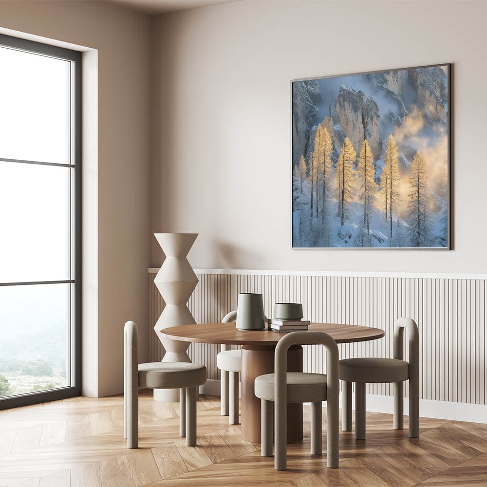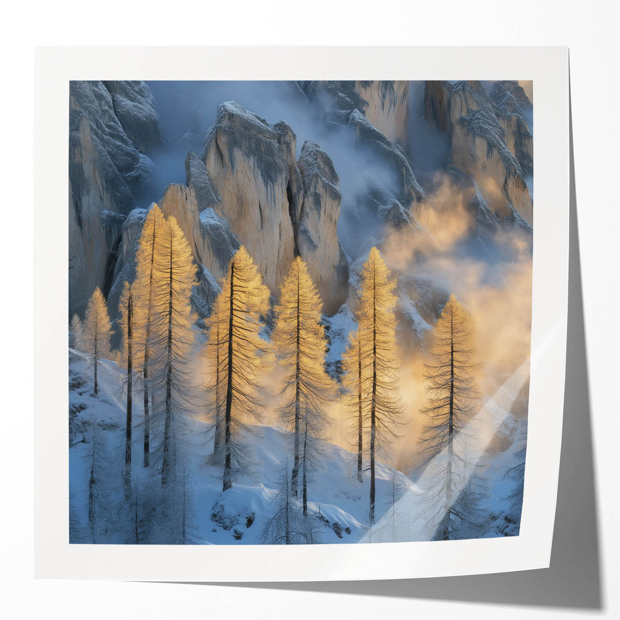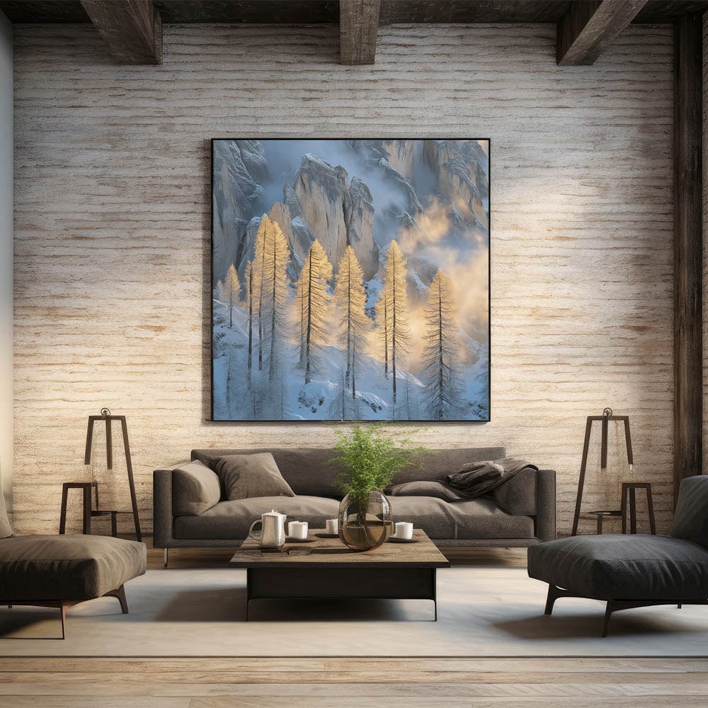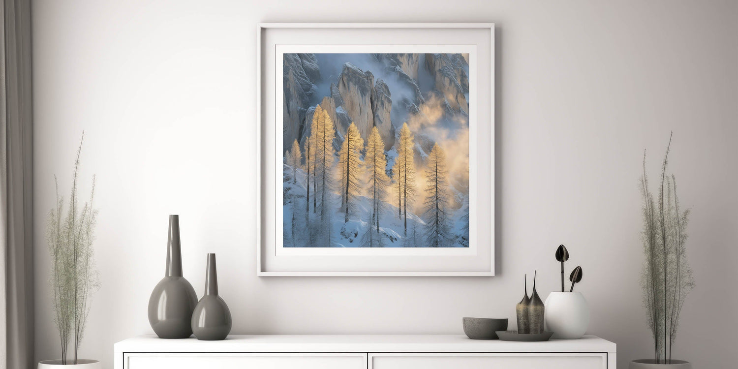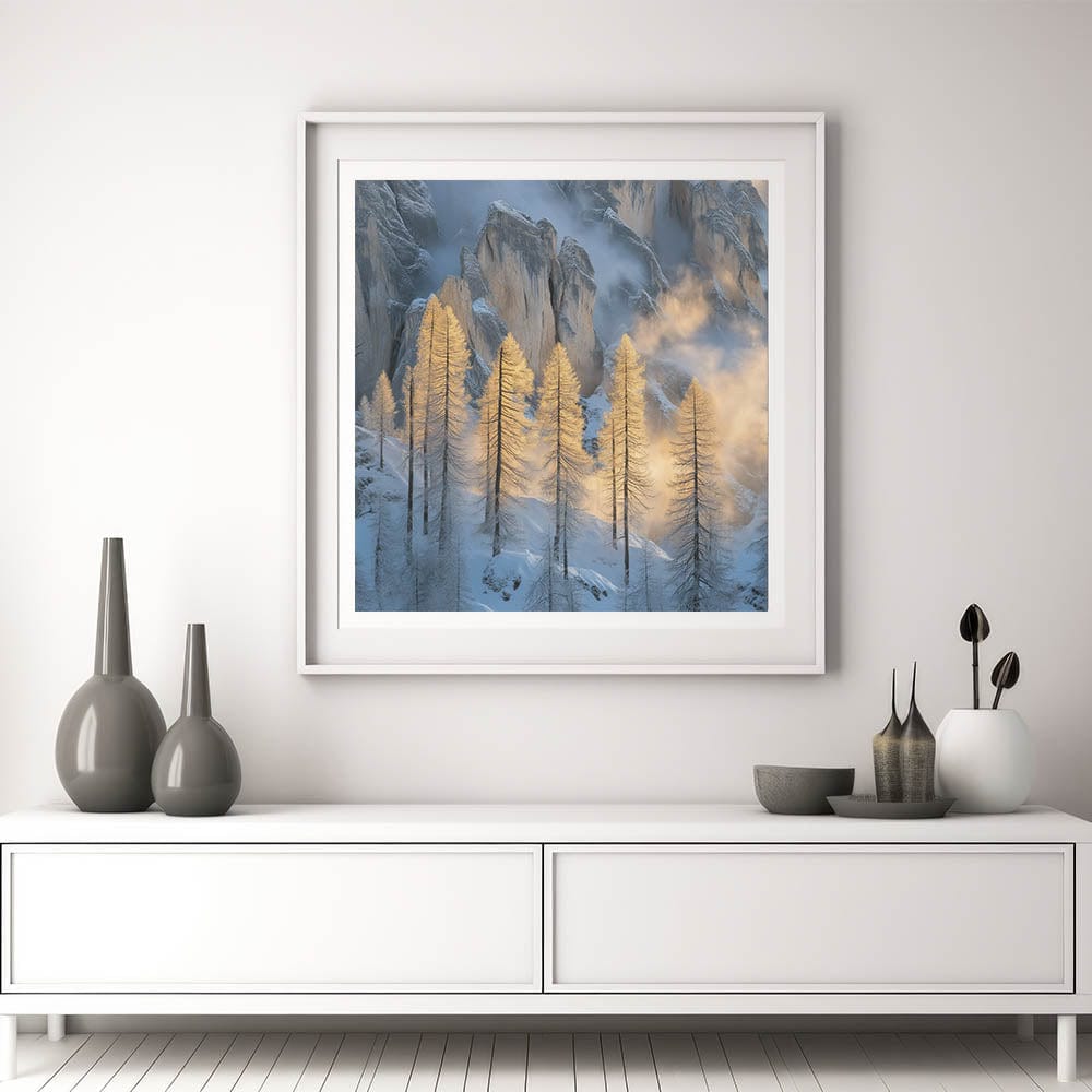 Embrace the breathtaking beauty of winter with this Tree Art Print, featuring tall golden-lit trees standing against a dramatic snow-covered mountain backdrop. The warm glow of sunlight filtering through the mist creates a stunning contrast between icy blues and golden tones, making this Nature-Inspired Wall Art a mesmerizing addition to any space. The delicate balance of light and shadow adds depth and elegance to this artwork, making it a perfect statement piece for lovers of scenic landscapes.