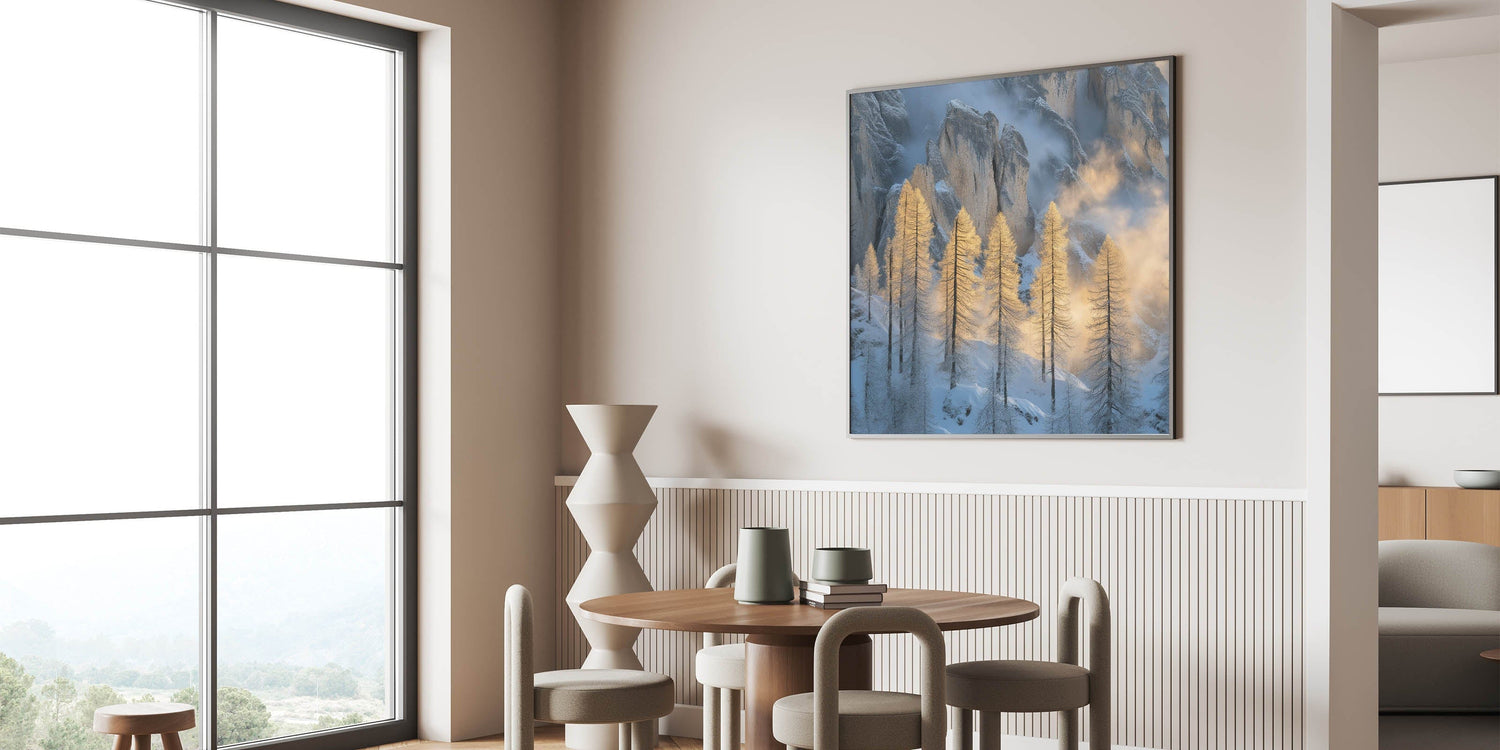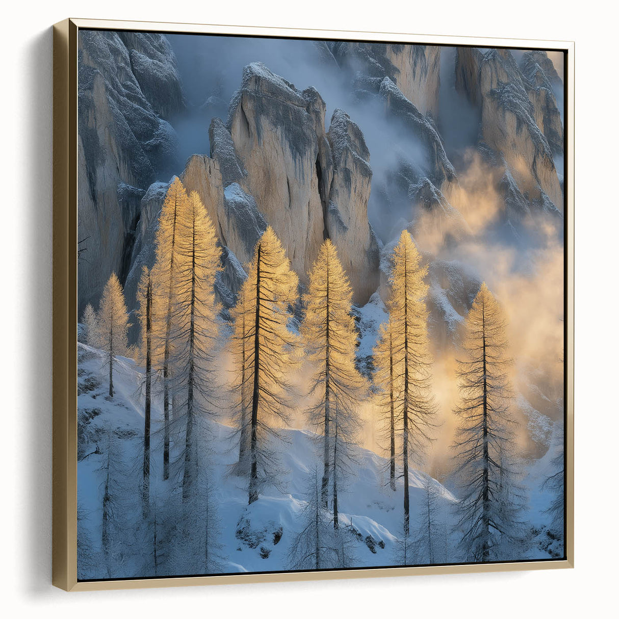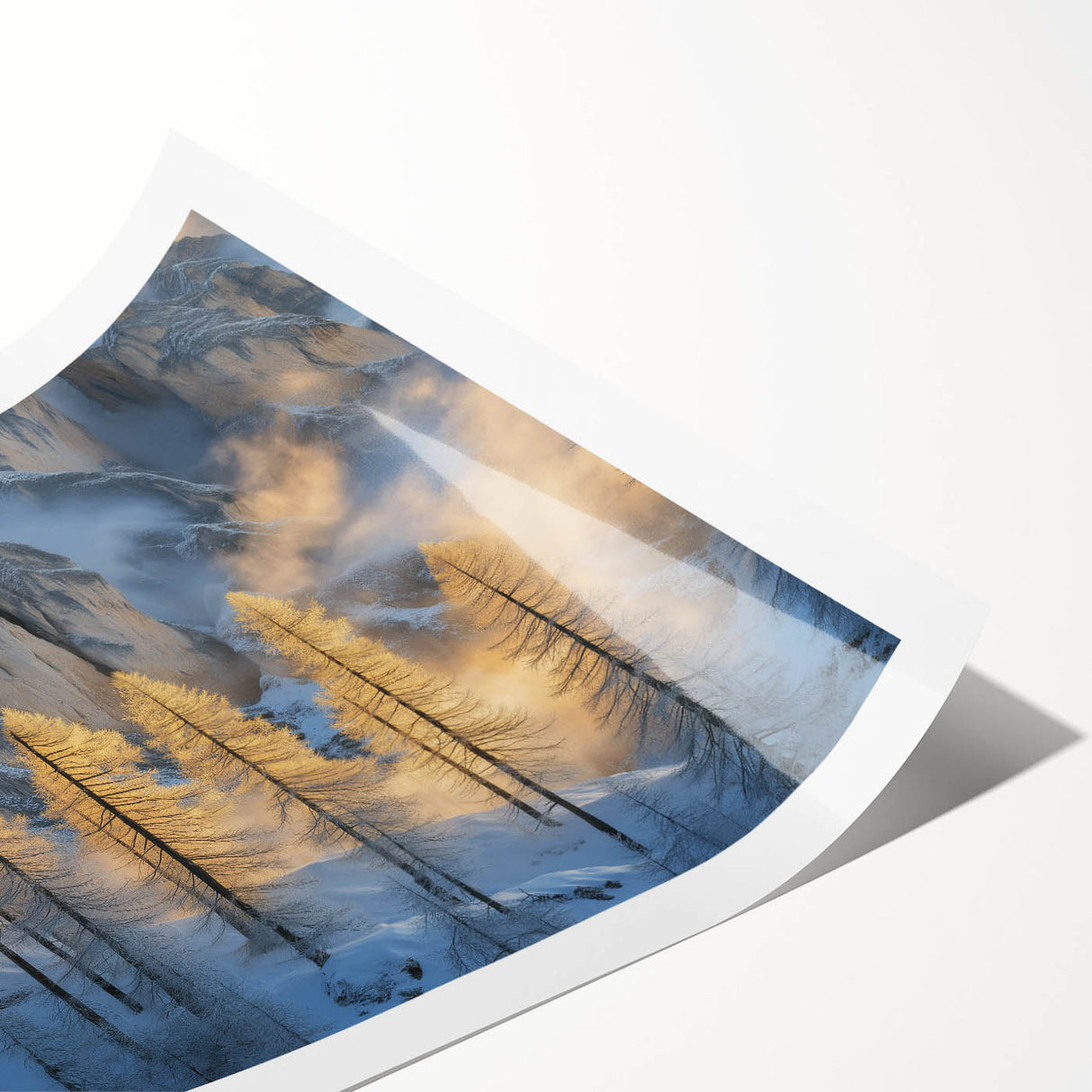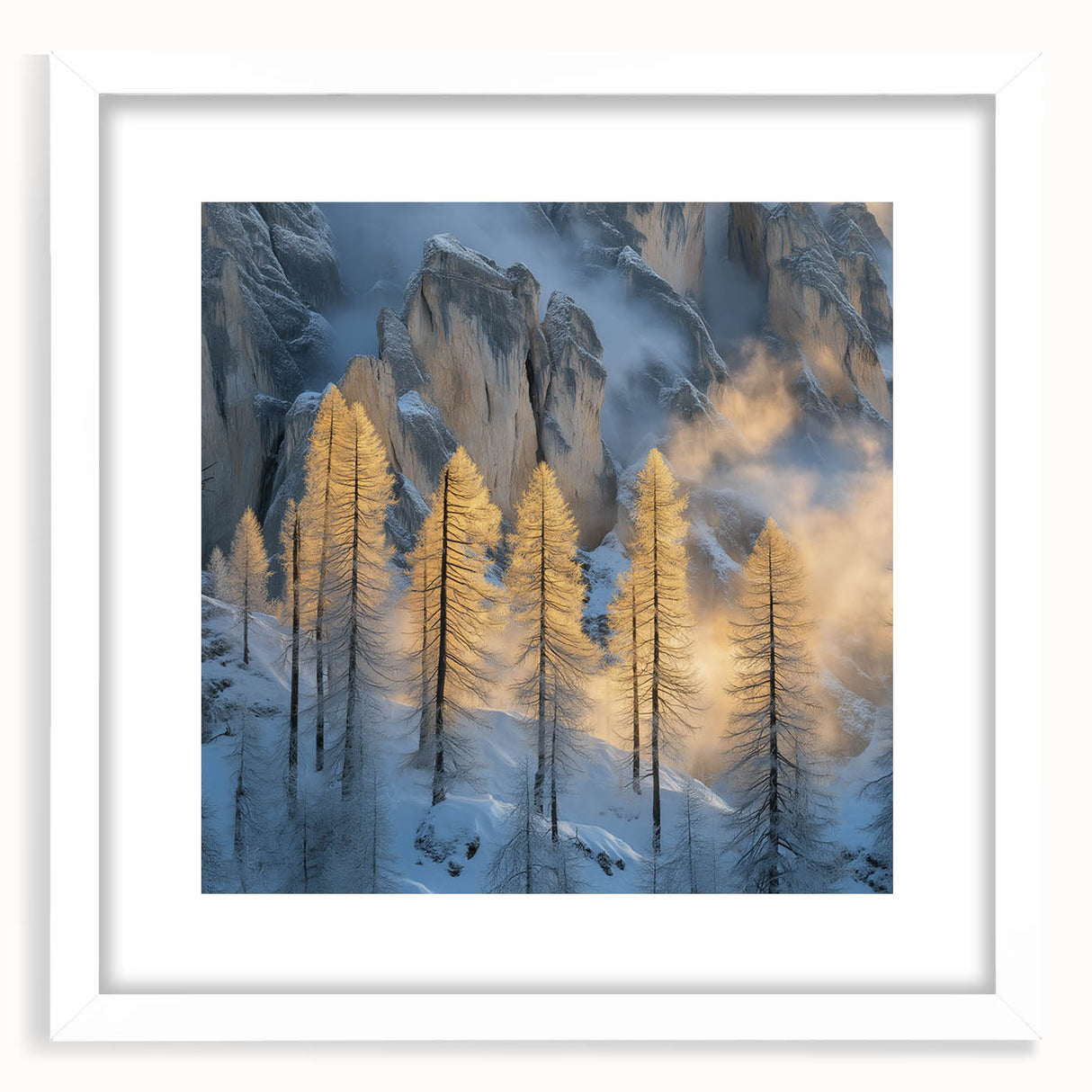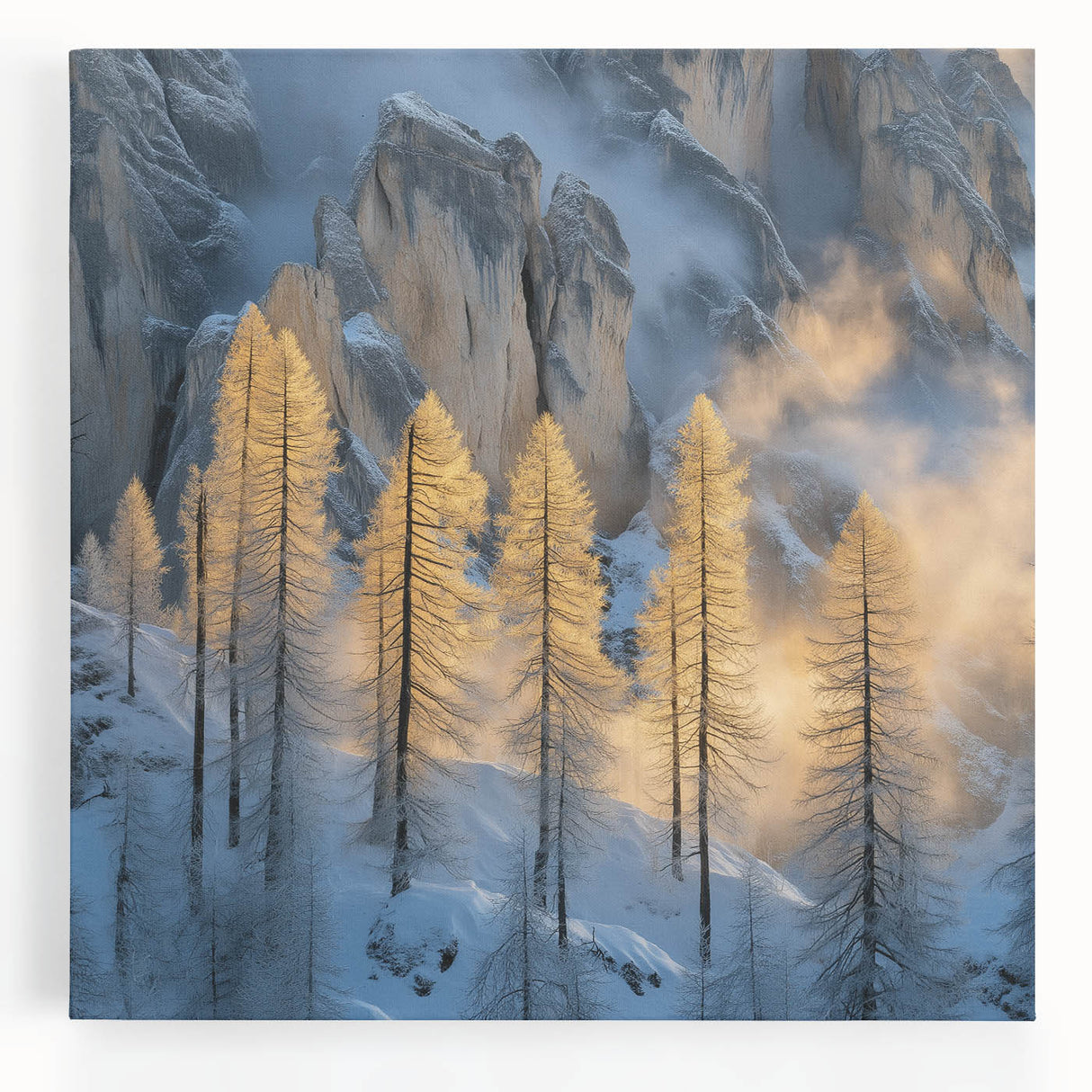 Embrace the breathtaking beauty of winter with this Tree Art Print, featuring tall golden-lit trees standing against a dramatic snow-covered mountain backdrop. The warm glow of sunlight filtering through the mist creates a stunning contrast between icy blues and golden tones, making this Nature-Inspired Wall Art a mesmerizing addition to any space. The delicate balance of light and shadow adds depth and elegance to this artwork, making it a perfect statement piece for lovers of scenic landscapes.