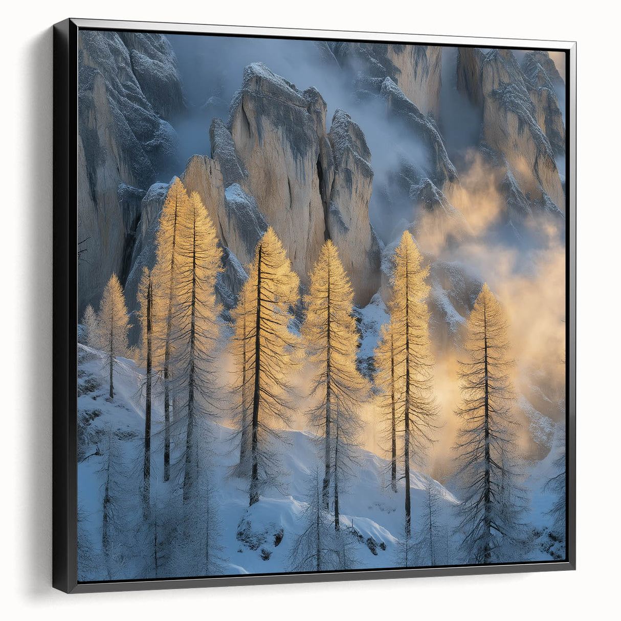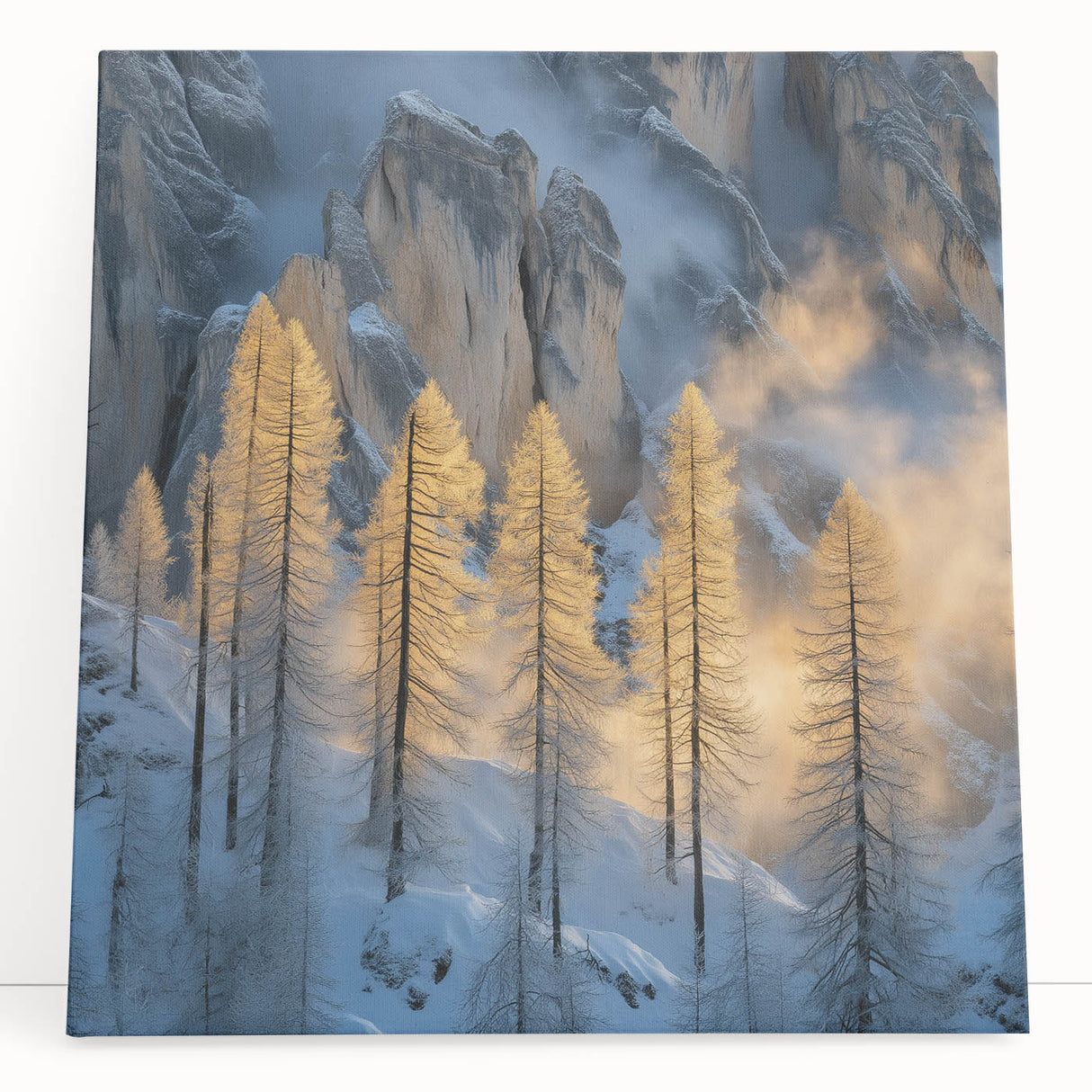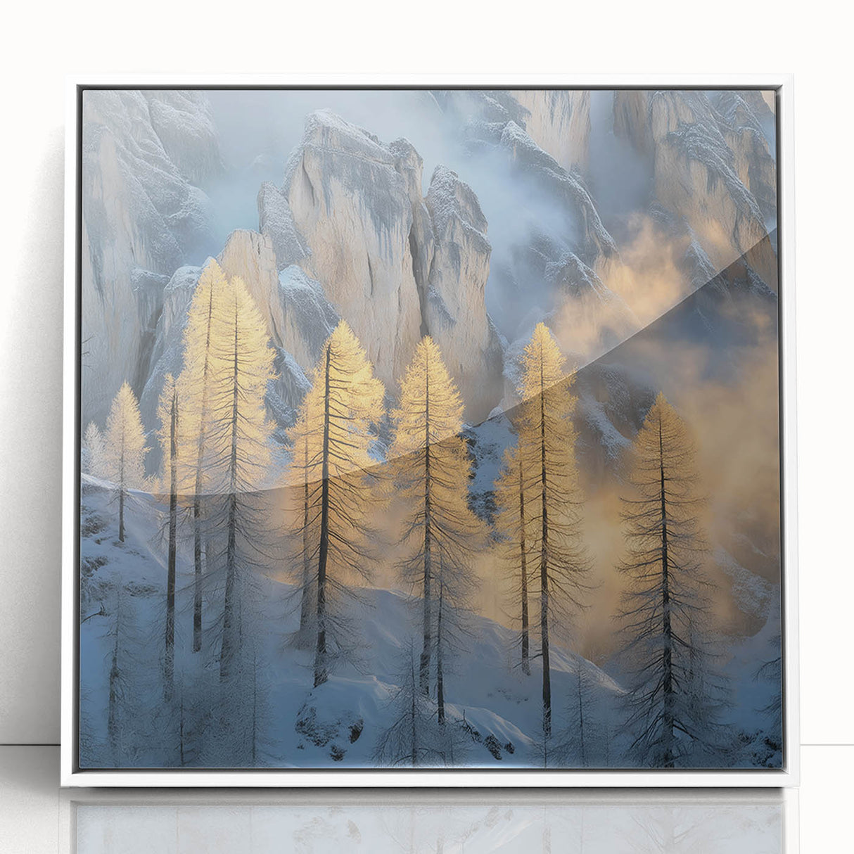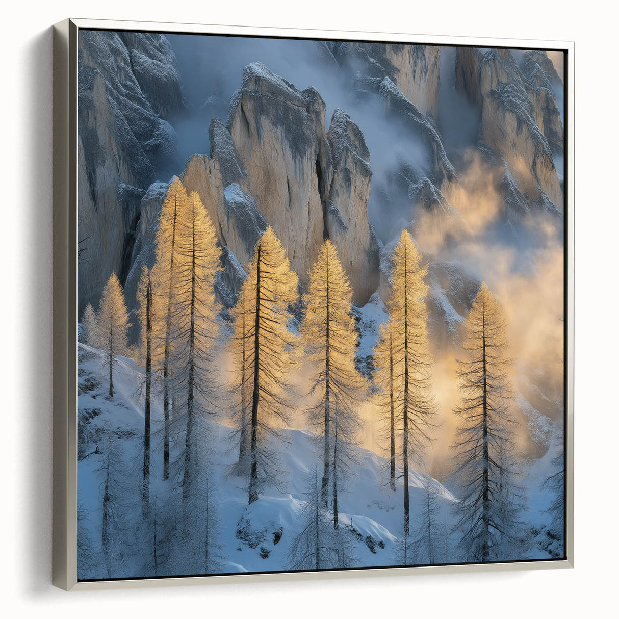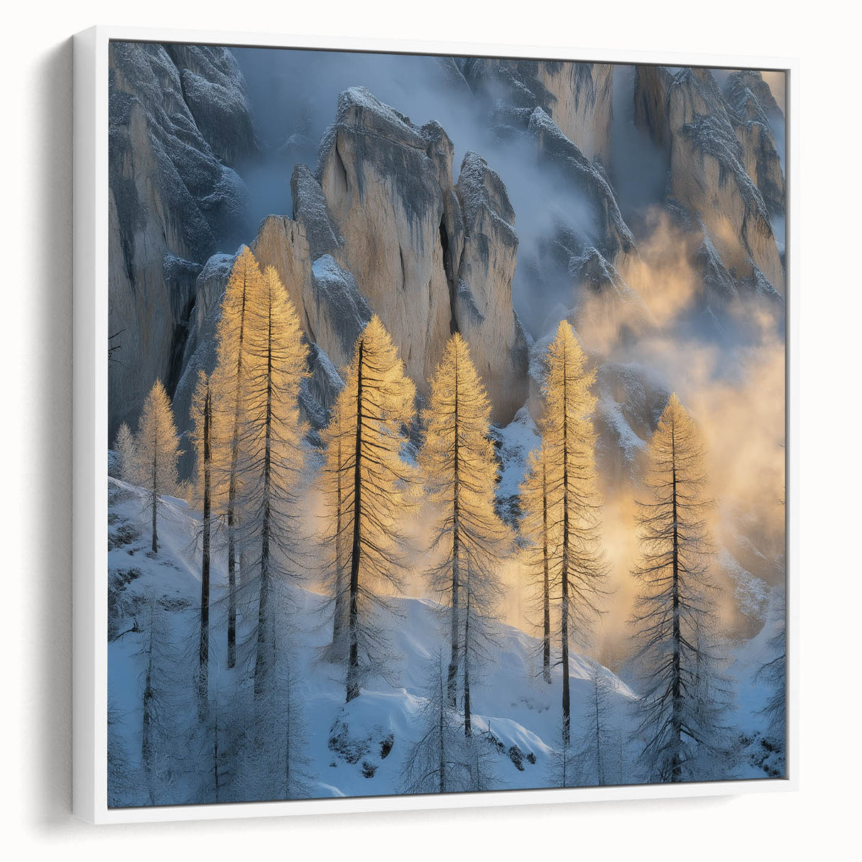 Embrace the breathtaking beauty of winter with this Tree Art Print, featuring tall golden-lit trees standing against a dramatic snow-covered mountain backdrop. The warm glow of sunlight filtering through the mist creates a stunning contrast between icy blues and golden tones, making this Nature-Inspired Wall Art a mesmerizing addition to any space. The delicate balance of light and shadow adds depth and elegance to this artwork, making it a perfect statement piece for lovers of scenic landscapes.