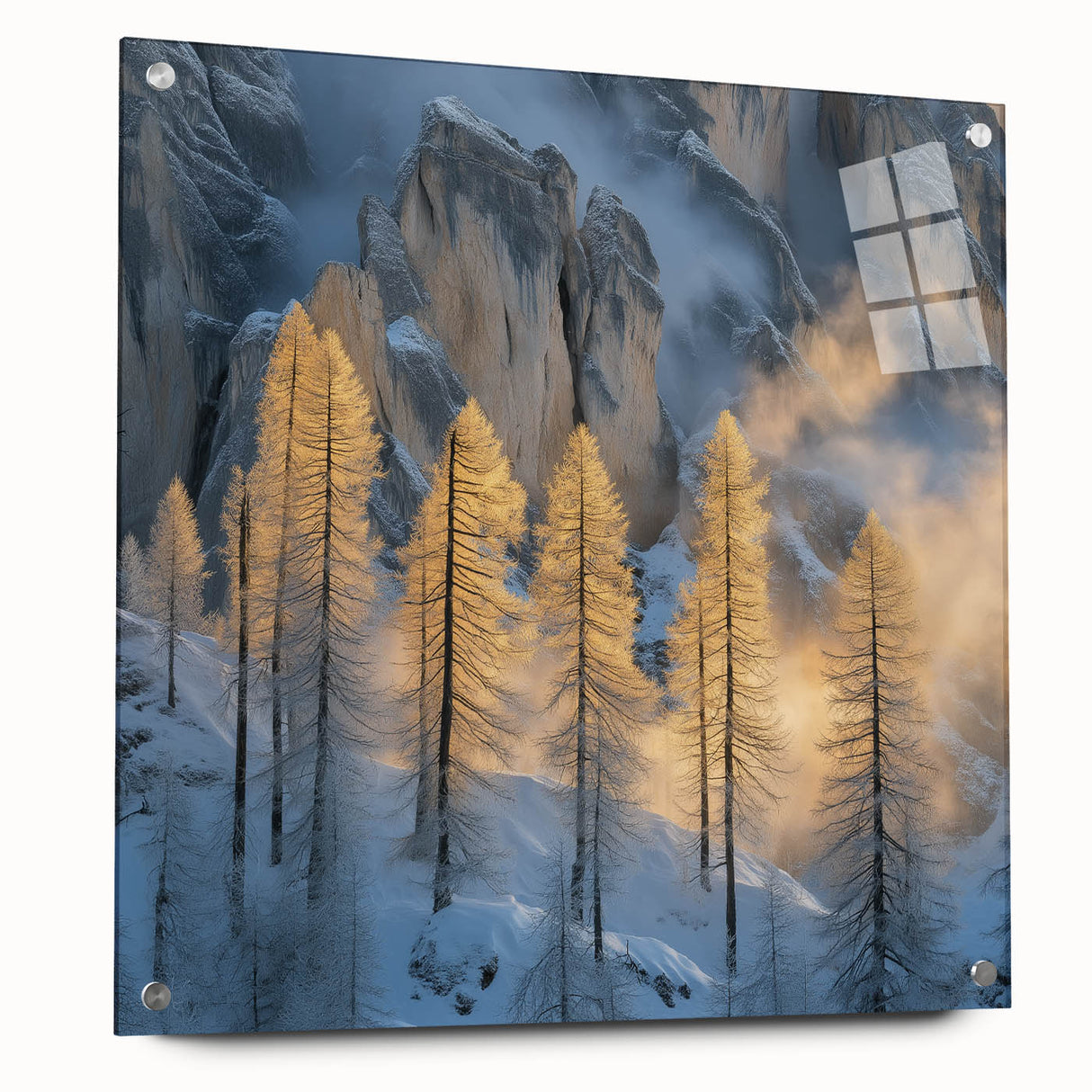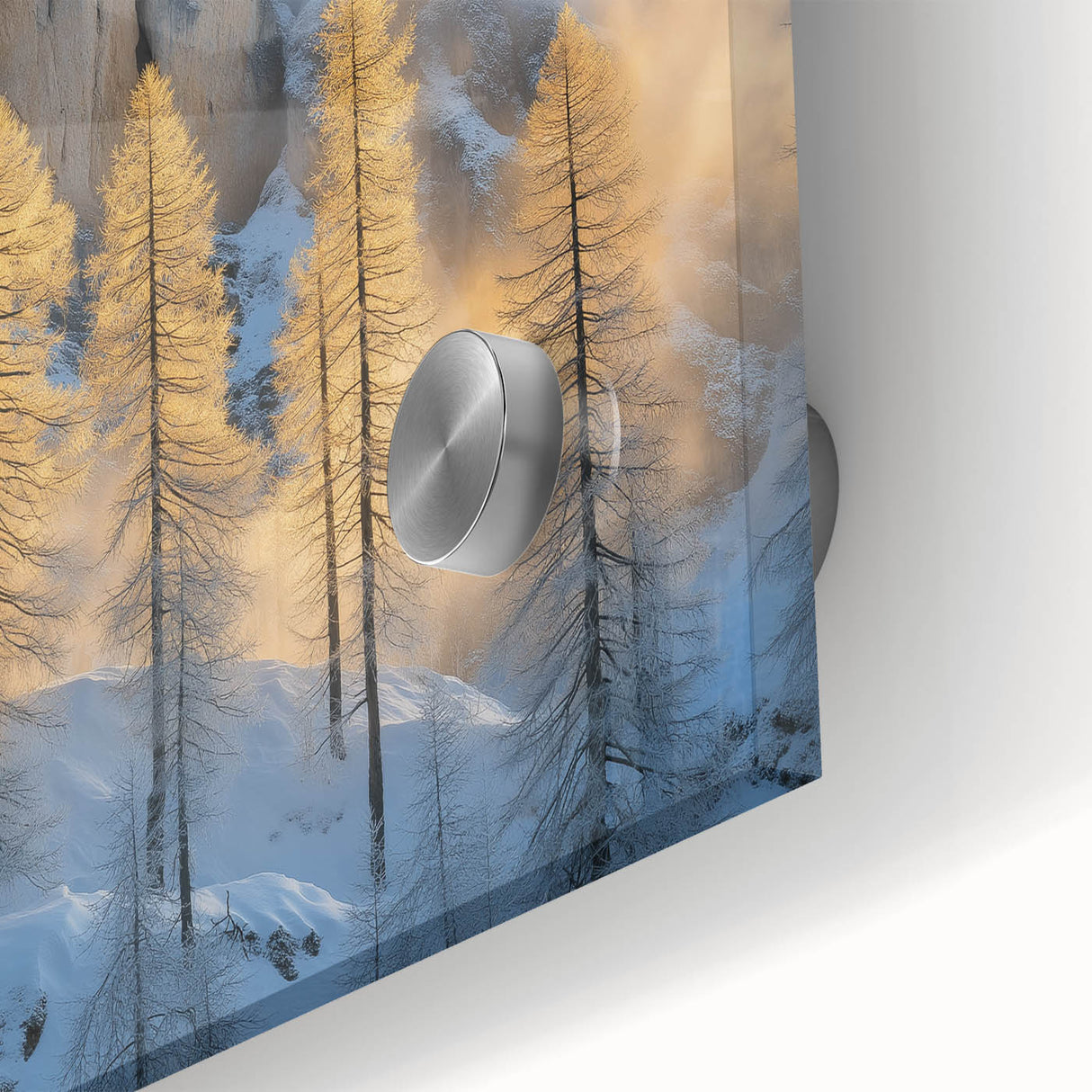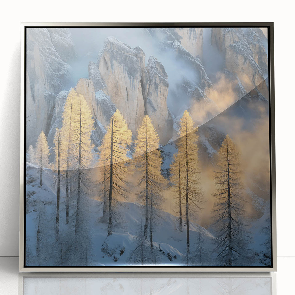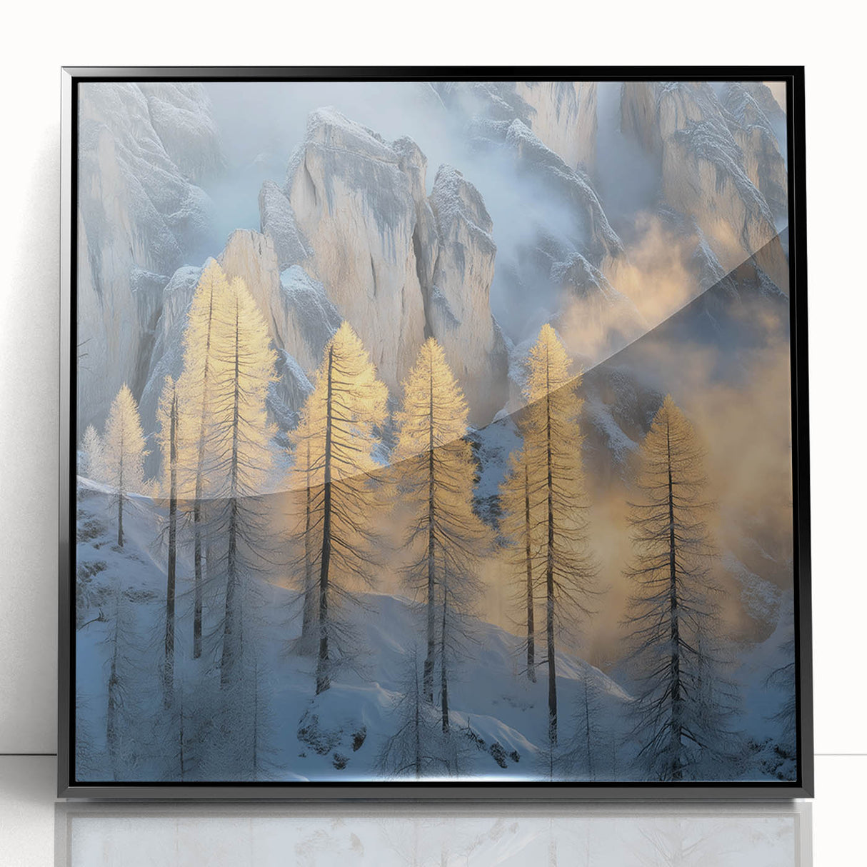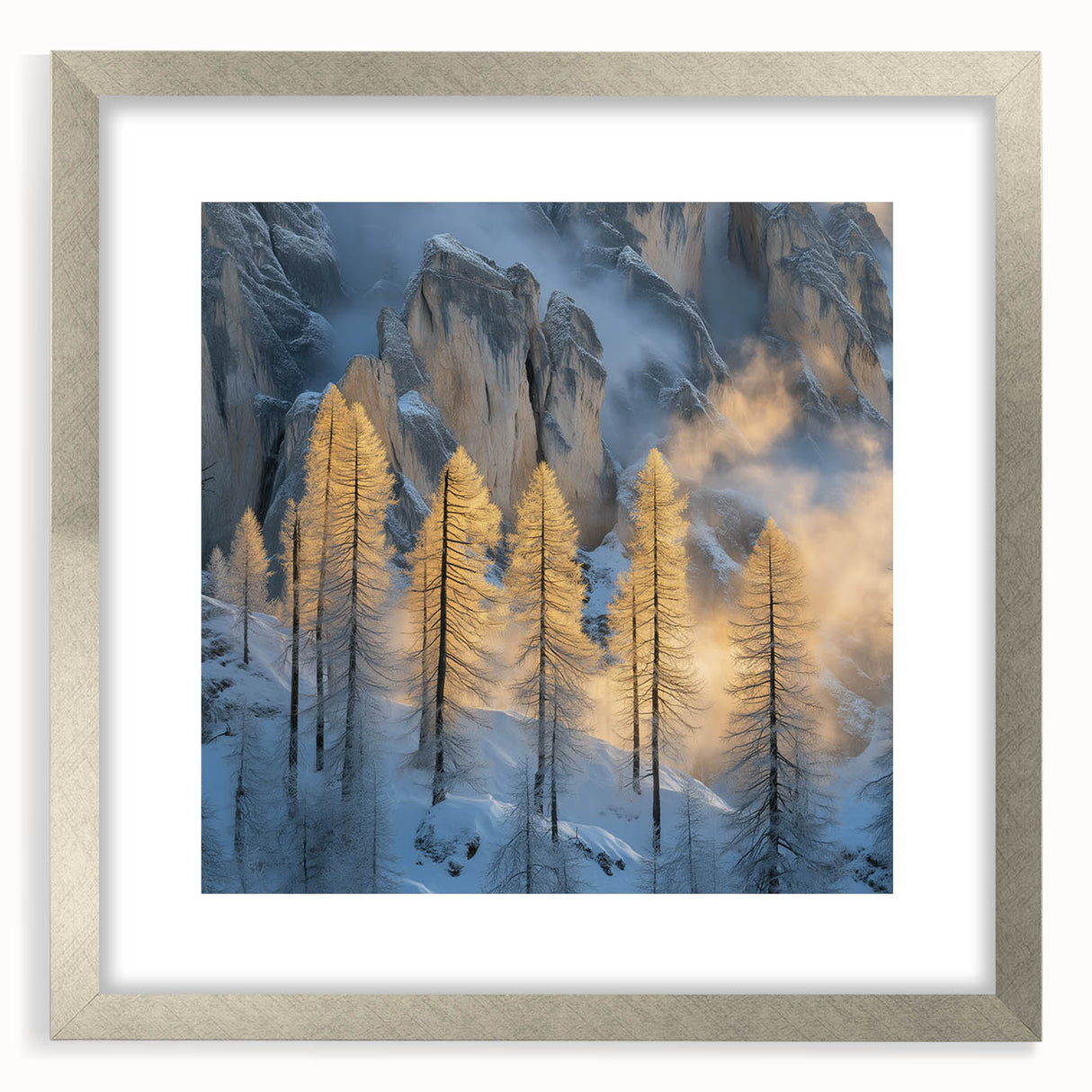 Embrace the breathtaking beauty of winter with this Tree Art Print, featuring tall golden-lit trees standing against a dramatic snow-covered mountain backdrop. The warm glow of sunlight filtering through the mist creates a stunning contrast between icy blues and golden tones, making this Nature-Inspired Wall Art a mesmerizing addition to any space. The delicate balance of light and shadow adds depth and elegance to this artwork, making it a perfect statement piece for lovers of scenic landscapes.