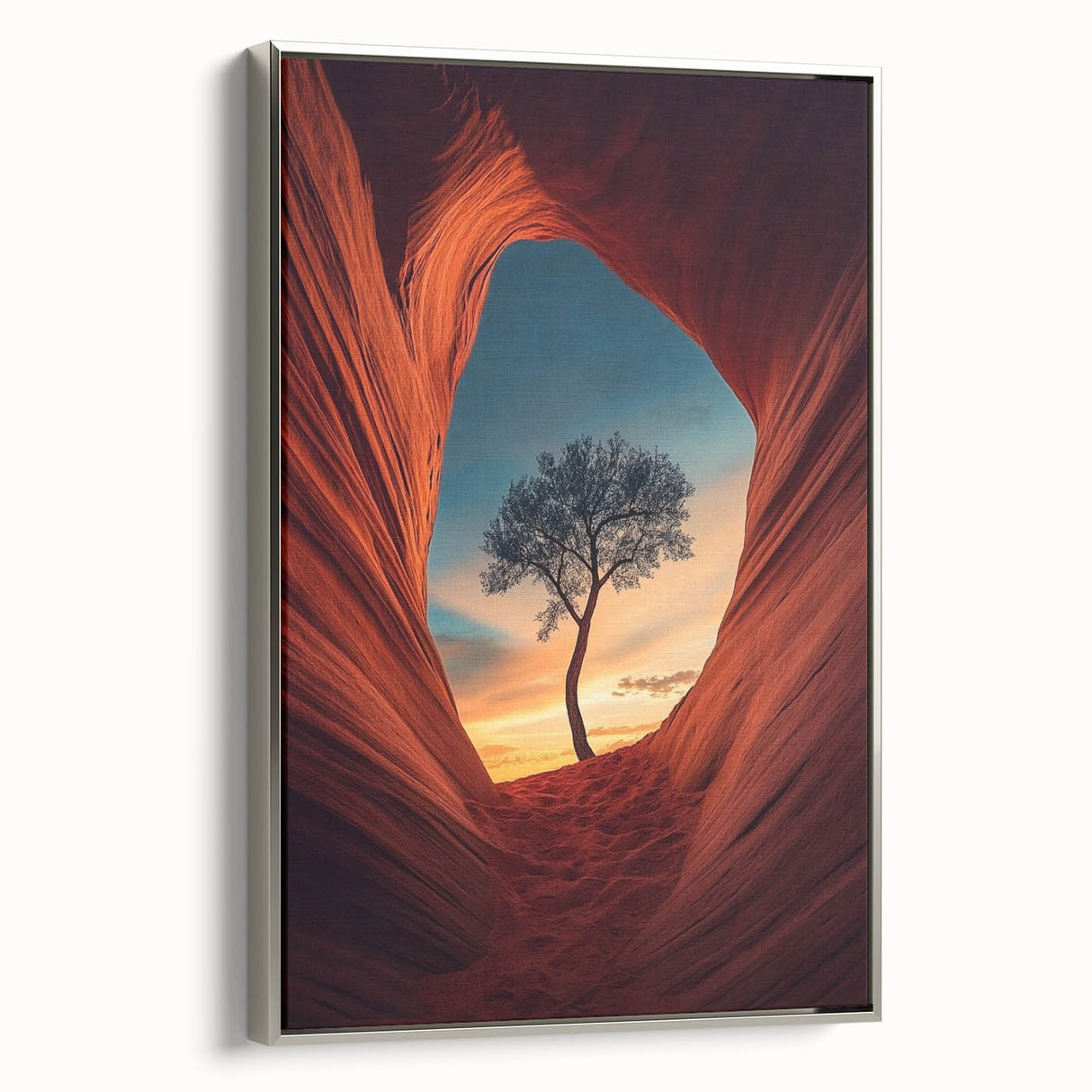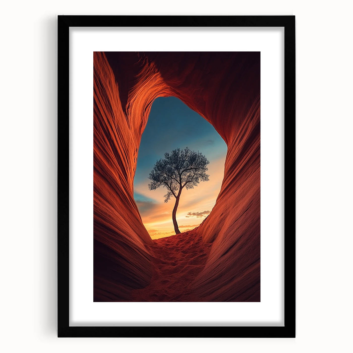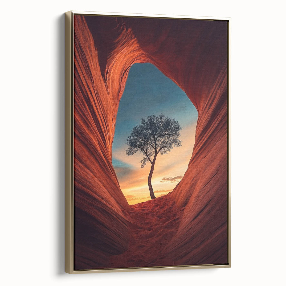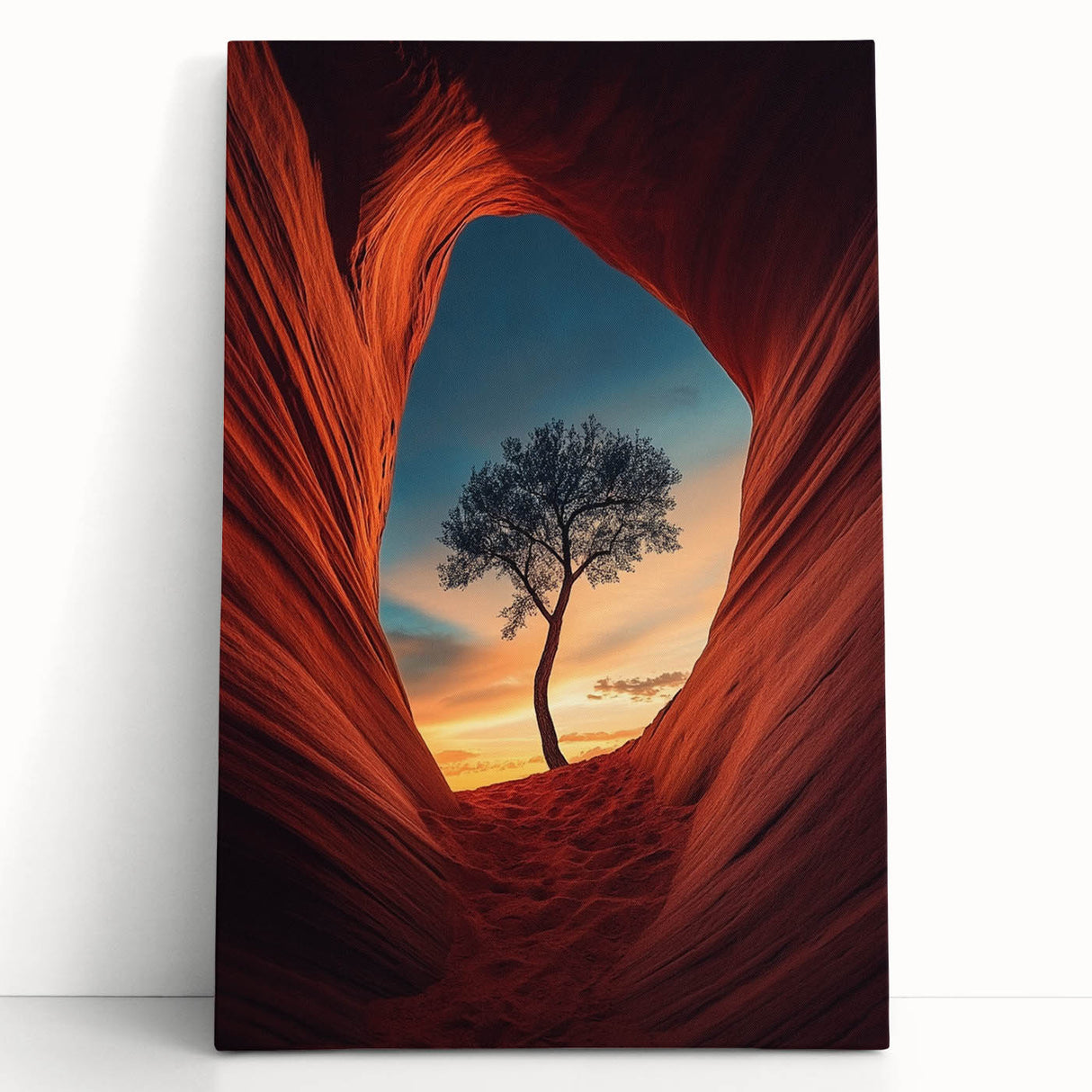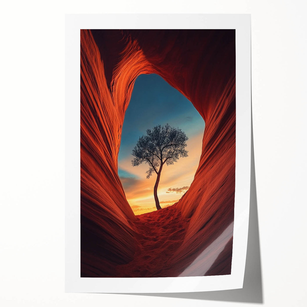 Step into a world of breathtaking contrasts with this Tree Art Print, featuring a lone tree standing tall against a stunning canyon sunset. Framed by the rich, red sandstone walls of a desert cave, the golden hues of the sky blend seamlessly with the deep orange sands, creating a striking Nature-Inspired Wall Art piece. This artwork embodies resilience and beauty, making it a perfect focal point for any space.