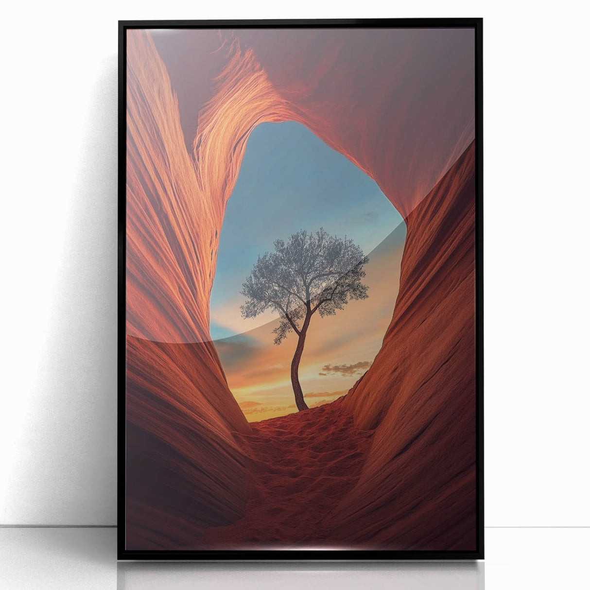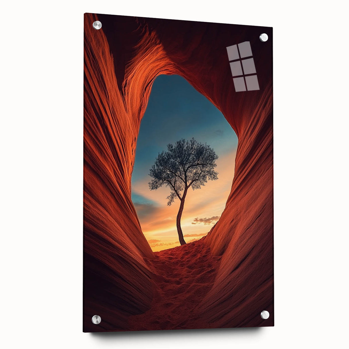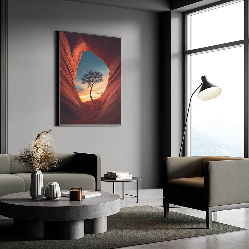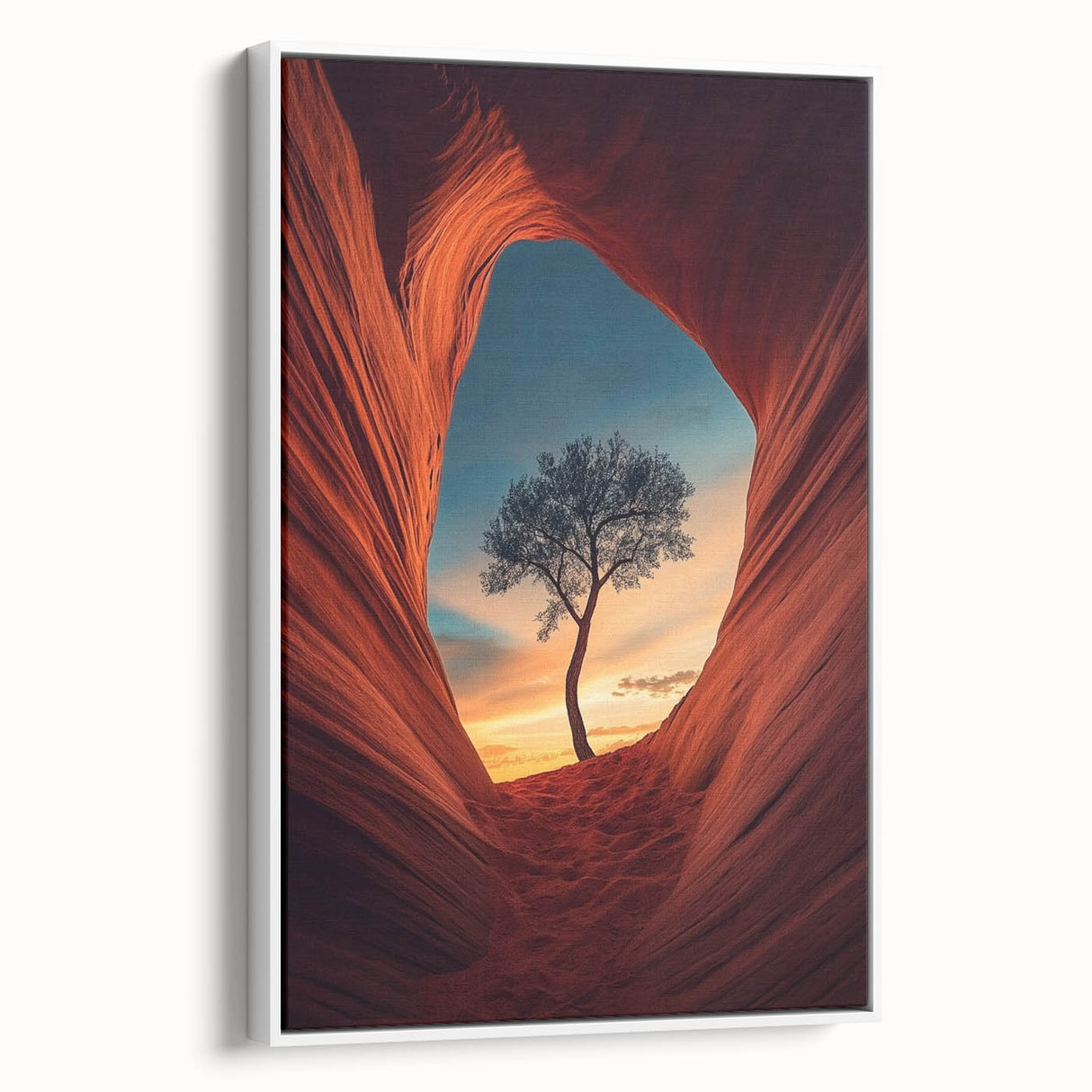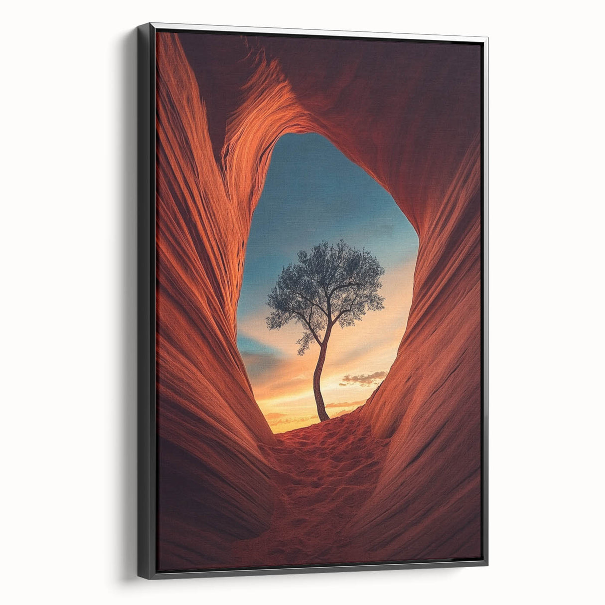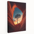 Step into a world of breathtaking contrasts with this Tree Art Print, featuring a lone tree standing tall against a stunning canyon sunset. Framed by the rich, red sandstone walls of a desert cave, the golden hues of the sky blend seamlessly with the deep orange sands, creating a striking Nature-Inspired Wall Art piece. This artwork embodies resilience and beauty, making it a perfect focal point for any space.