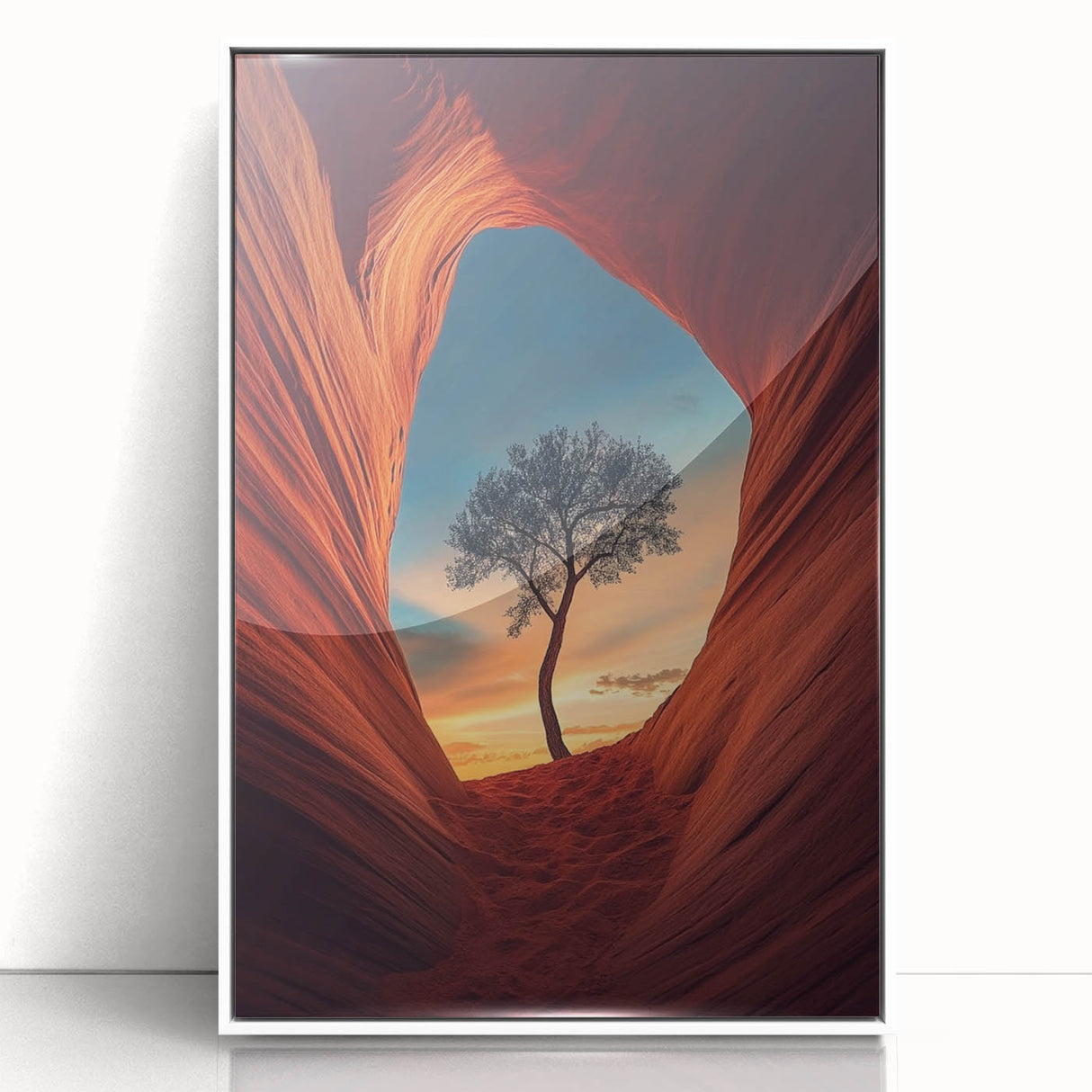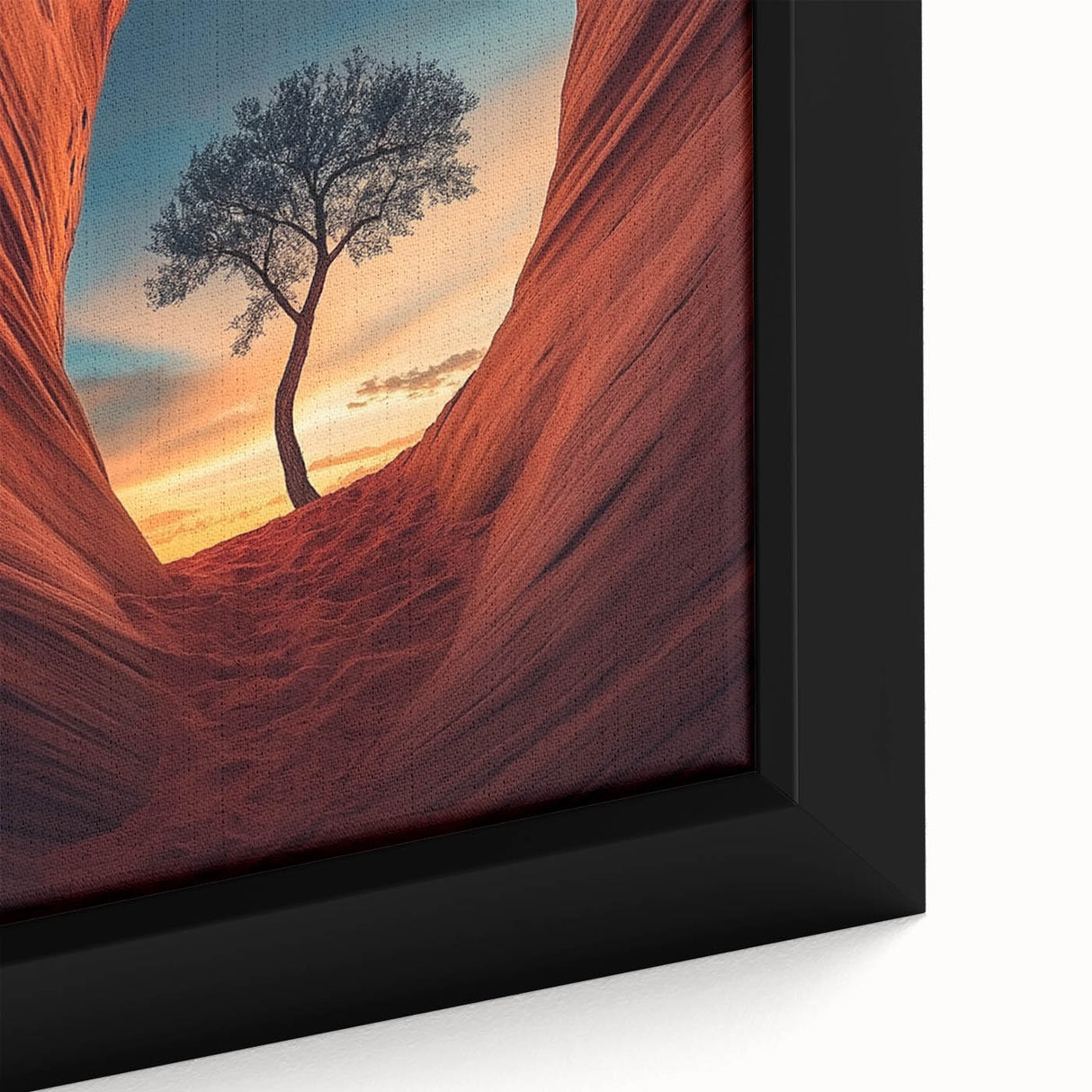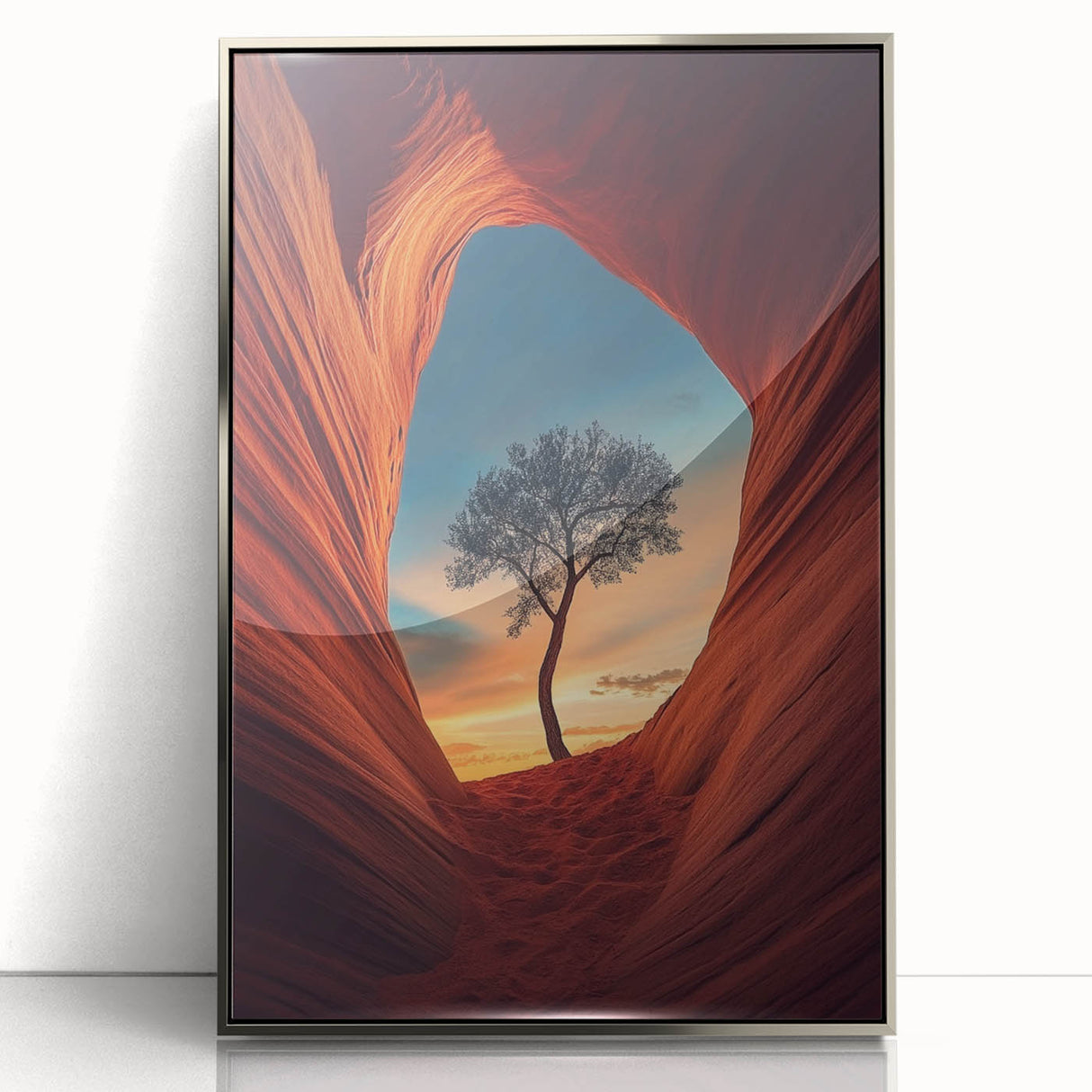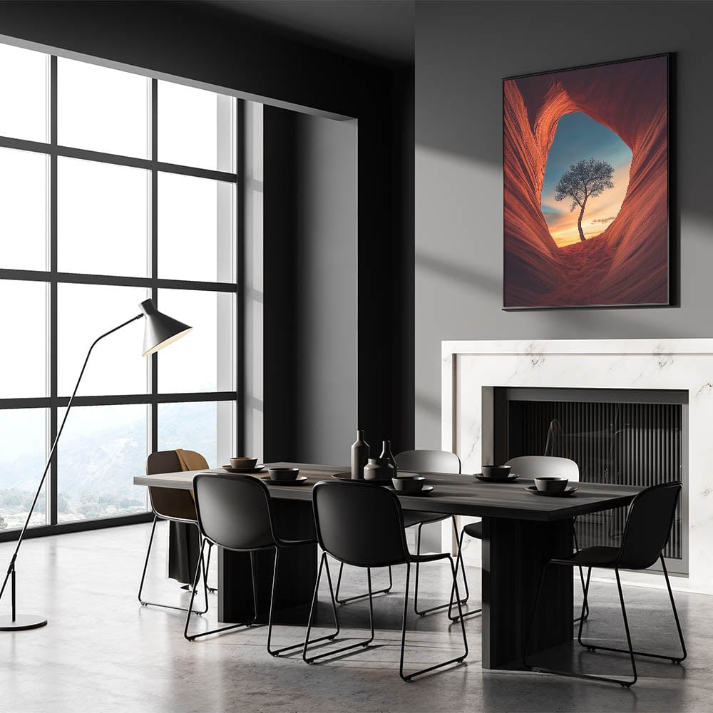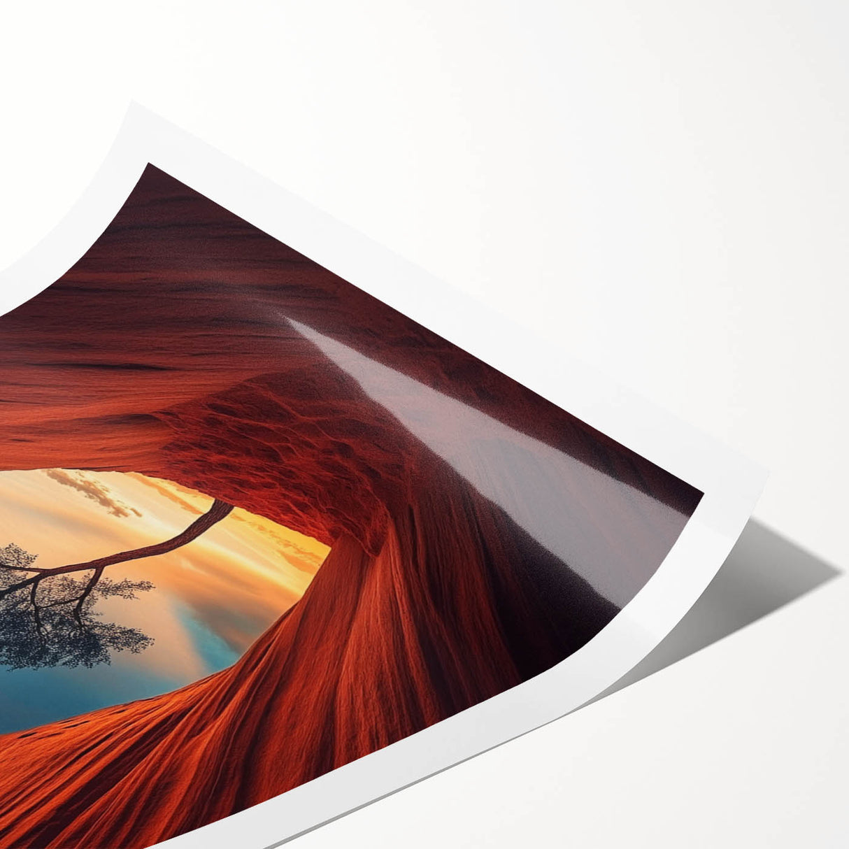 Step into a world of breathtaking contrasts with this Tree Art Print, featuring a lone tree standing tall against a stunning canyon sunset. Framed by the rich, red sandstone walls of a desert cave, the golden hues of the sky blend seamlessly with the deep orange sands, creating a striking Nature-Inspired Wall Art piece. This artwork embodies resilience and beauty, making it a perfect focal point for any space.
