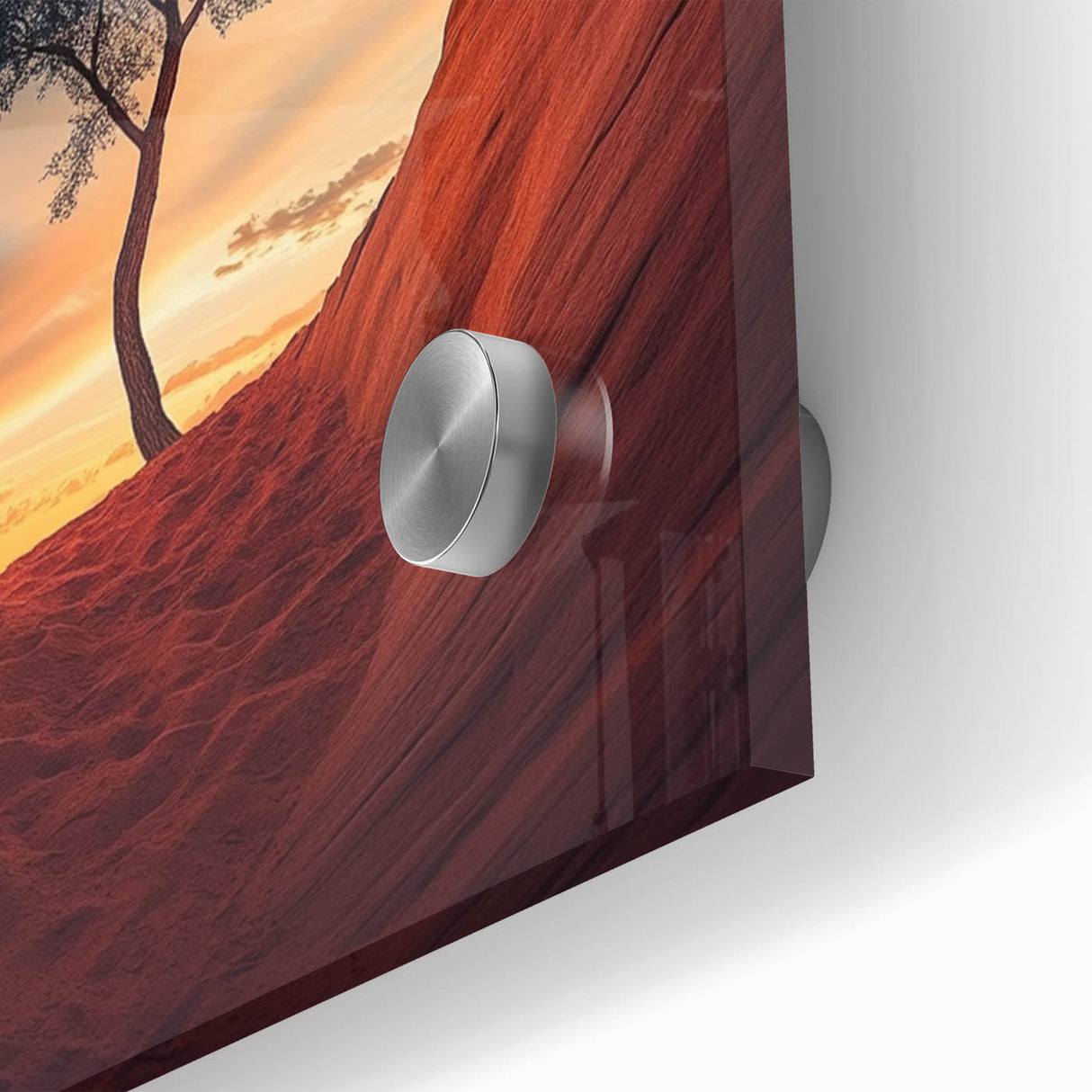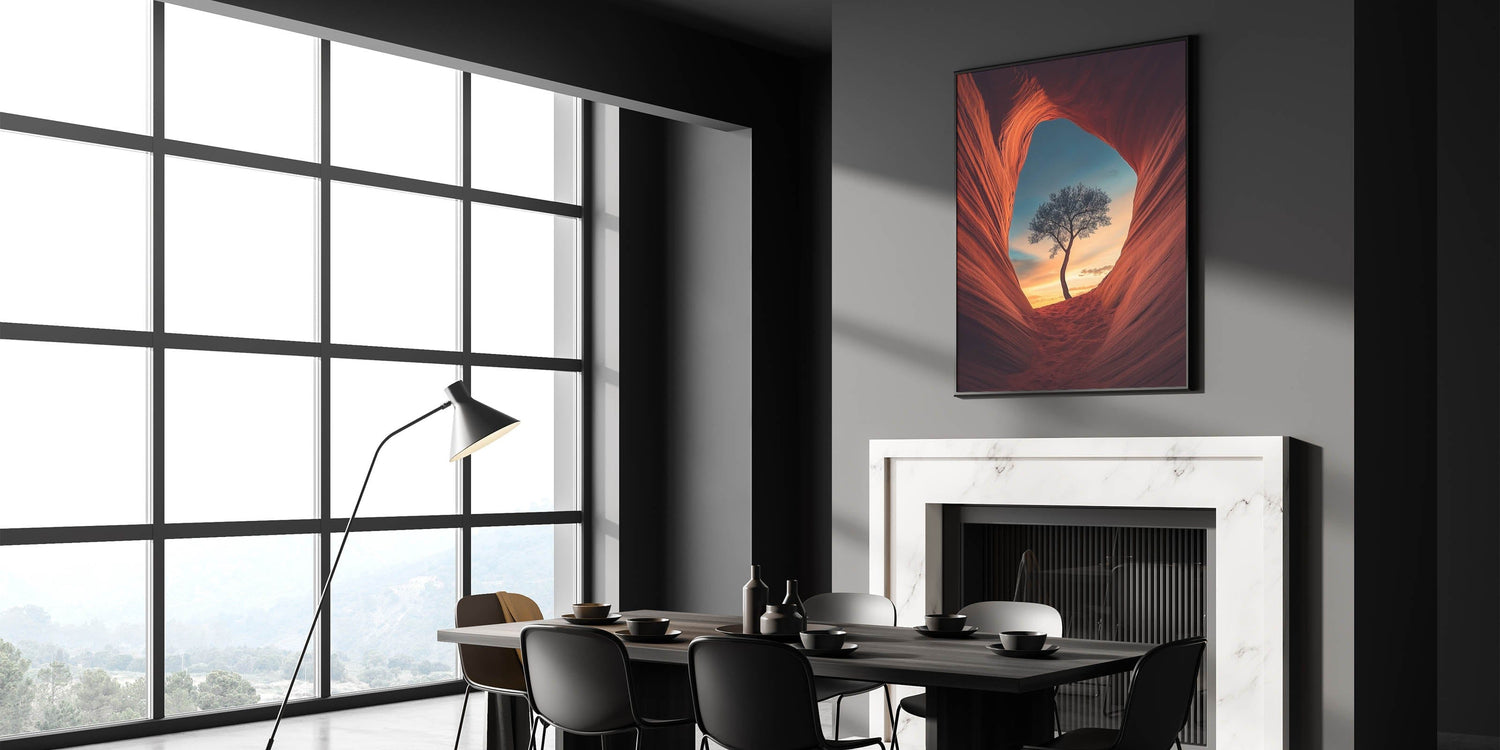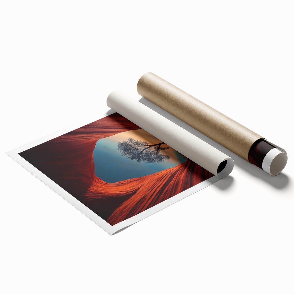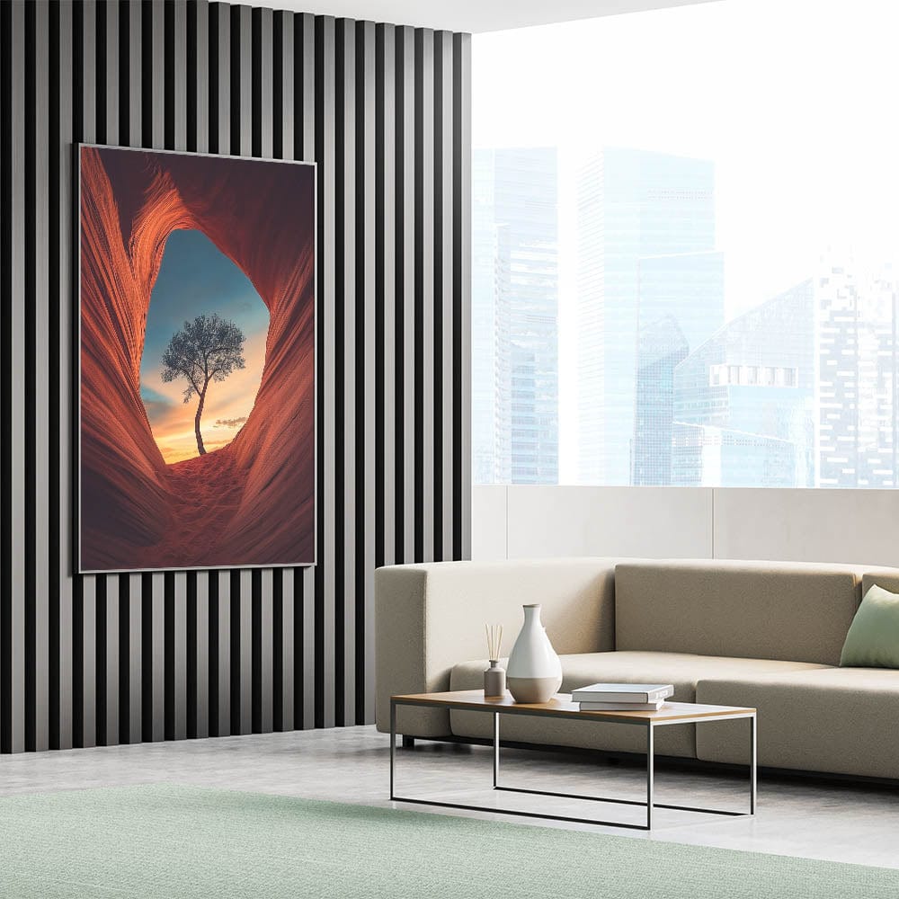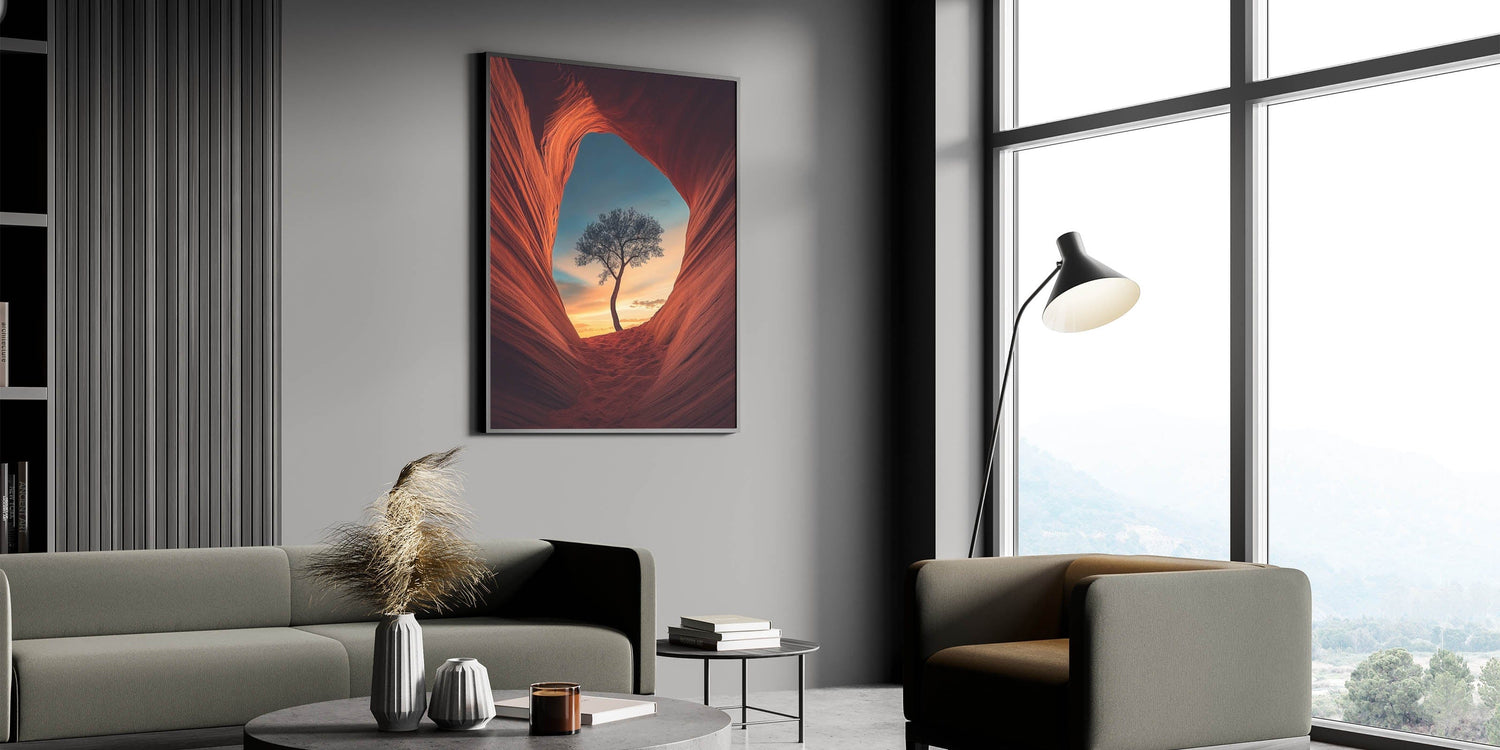 Step into a world of breathtaking contrasts with this Tree Art Print, featuring a lone tree standing tall against a stunning canyon sunset. Framed by the rich, red sandstone walls of a desert cave, the golden hues of the sky blend seamlessly with the deep orange sands, creating a striking Nature-Inspired Wall Art piece. This artwork embodies resilience and beauty, making it a perfect focal point for any space.