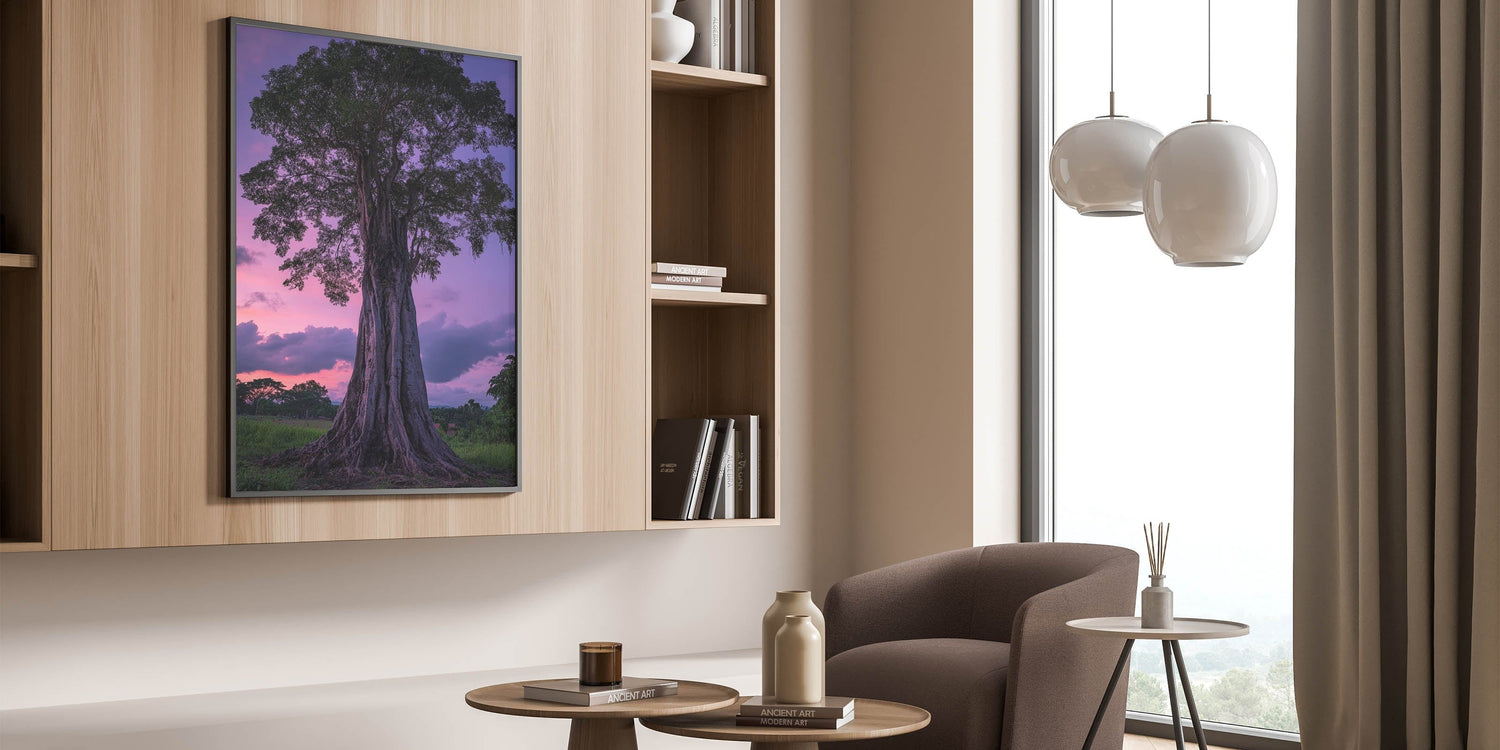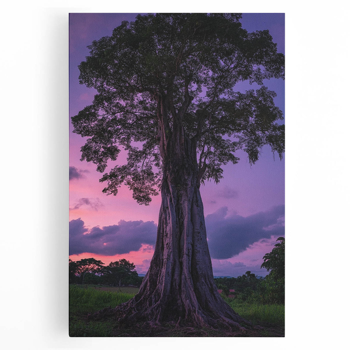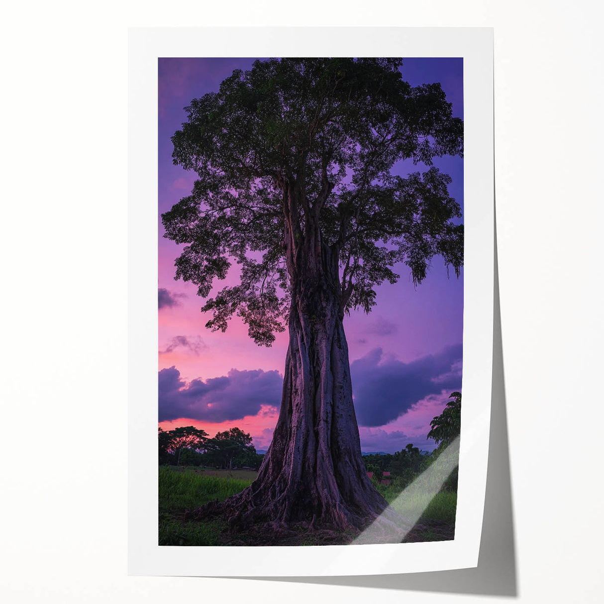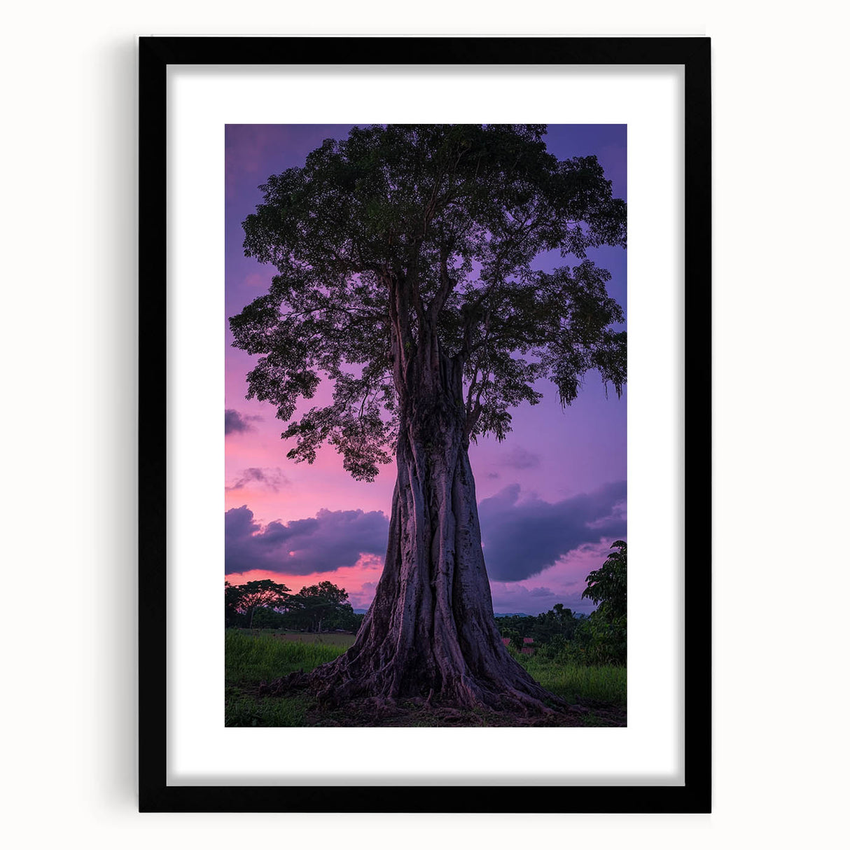 Elevate your space with the stunning beauty of this tree art print, featuring an ancient, majestic tree silhouetted against a breathtaking twilight sky. The deep hues of plum, dark green, and fiery sunset tones create a captivating contrast, making this landscape art print a perfect statement piece for any interior. Whether you love nature-inspired wall art or seek a dramatic forest art print, this artwork brings a sense of mystery and grandeur.