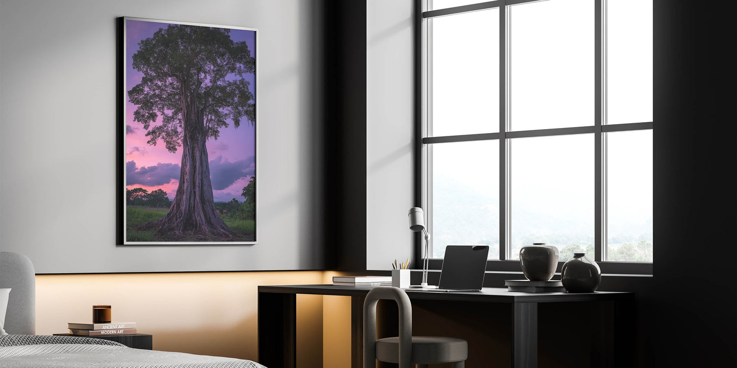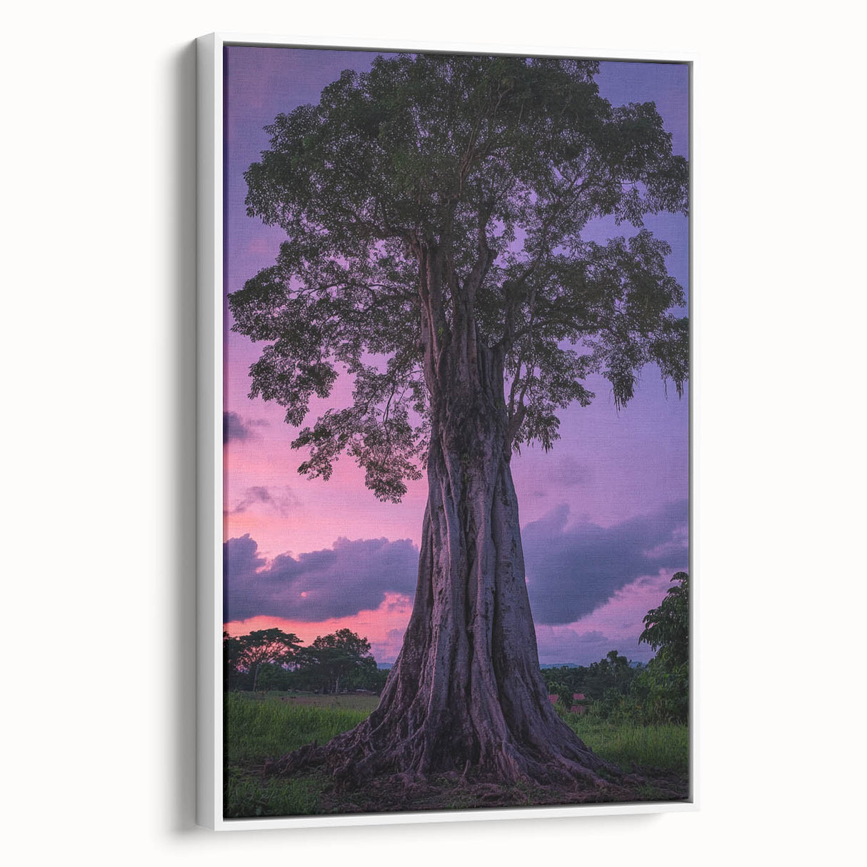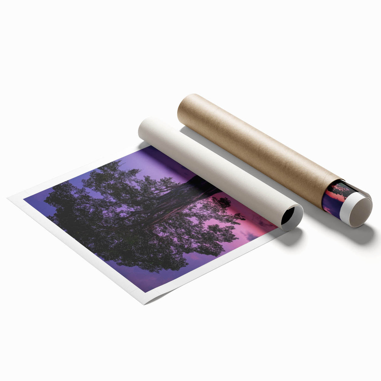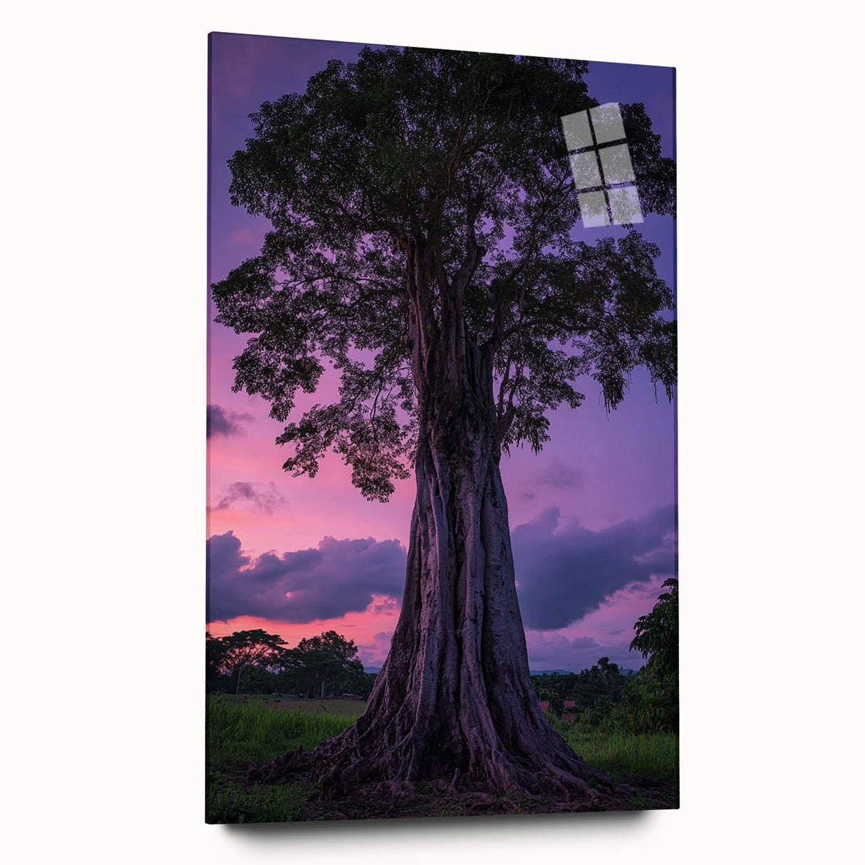 Elevate your space with the stunning beauty of this tree art print, featuring an ancient, majestic tree silhouetted against a breathtaking twilight sky. The deep hues of plum, dark green, and fiery sunset tones create a captivating contrast, making this landscape art print a perfect statement piece for any interior. Whether you love nature-inspired wall art or seek a dramatic forest art print, this artwork brings a sense of mystery and grandeur.