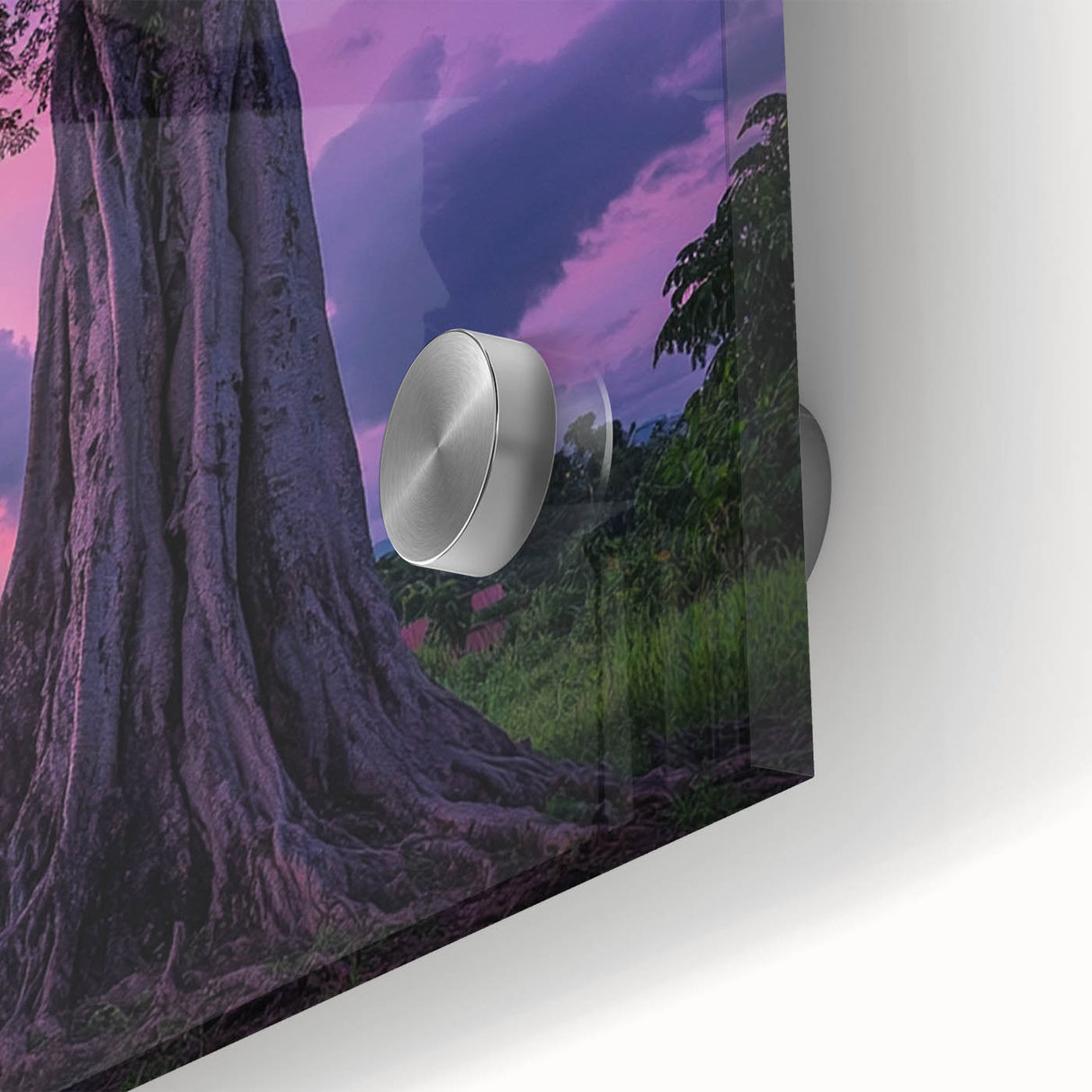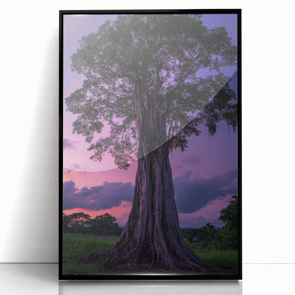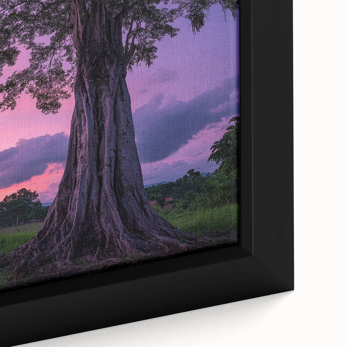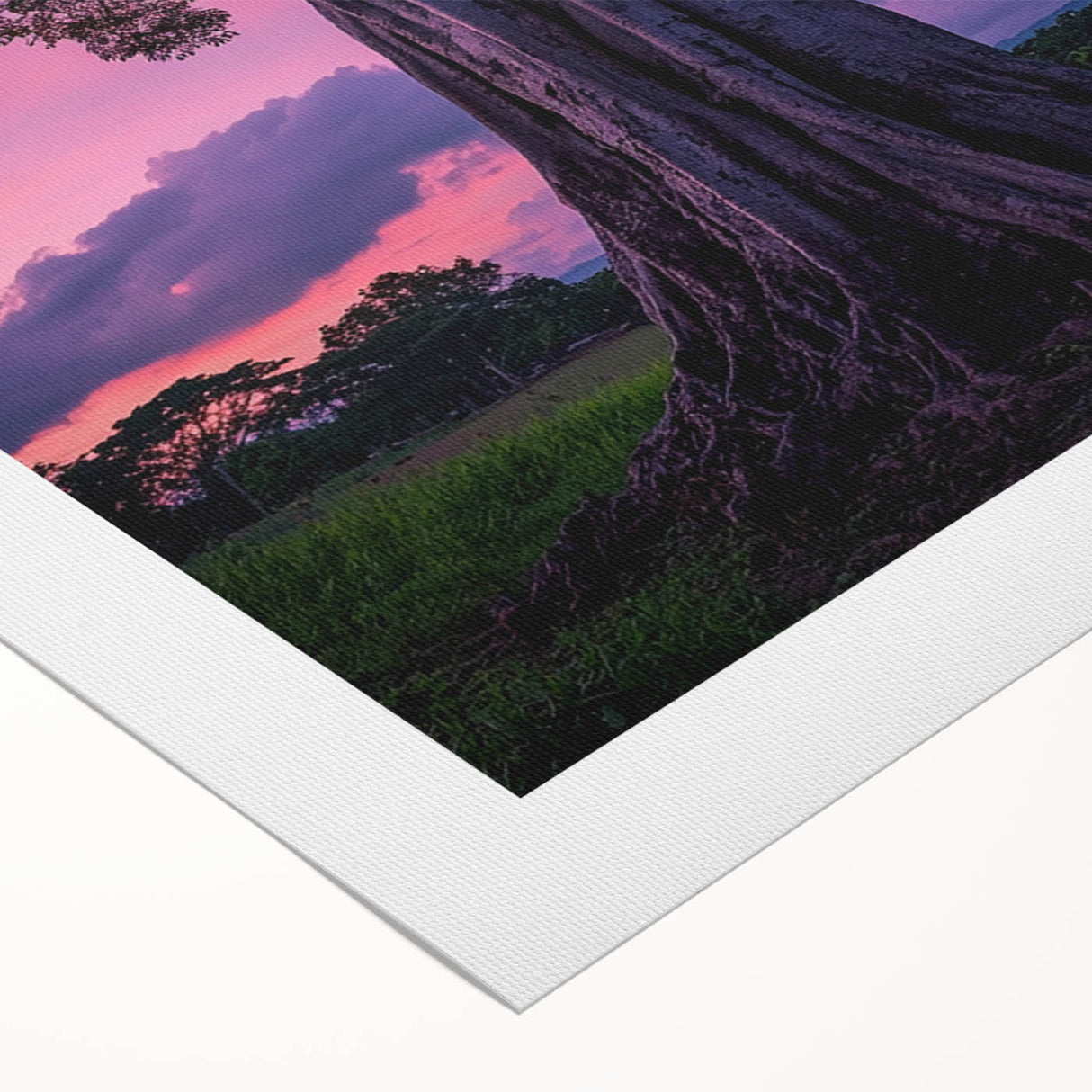 Elevate your space with the stunning beauty of this tree art print, featuring an ancient, majestic tree silhouetted against a breathtaking twilight sky. The deep hues of plum, dark green, and fiery sunset tones create a captivating contrast, making this landscape art print a perfect statement piece for any interior. Whether you love nature-inspired wall art or seek a dramatic forest art print, this artwork brings a sense of mystery and grandeur.