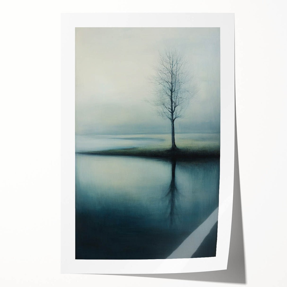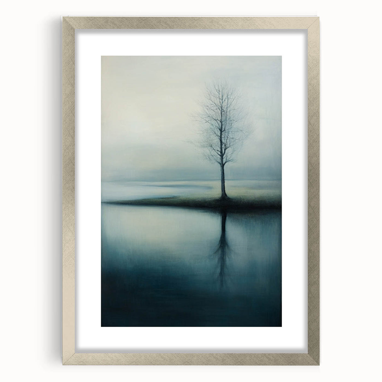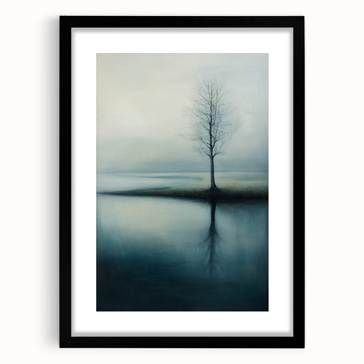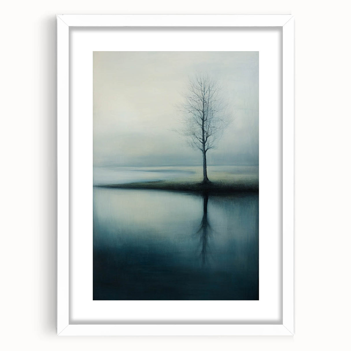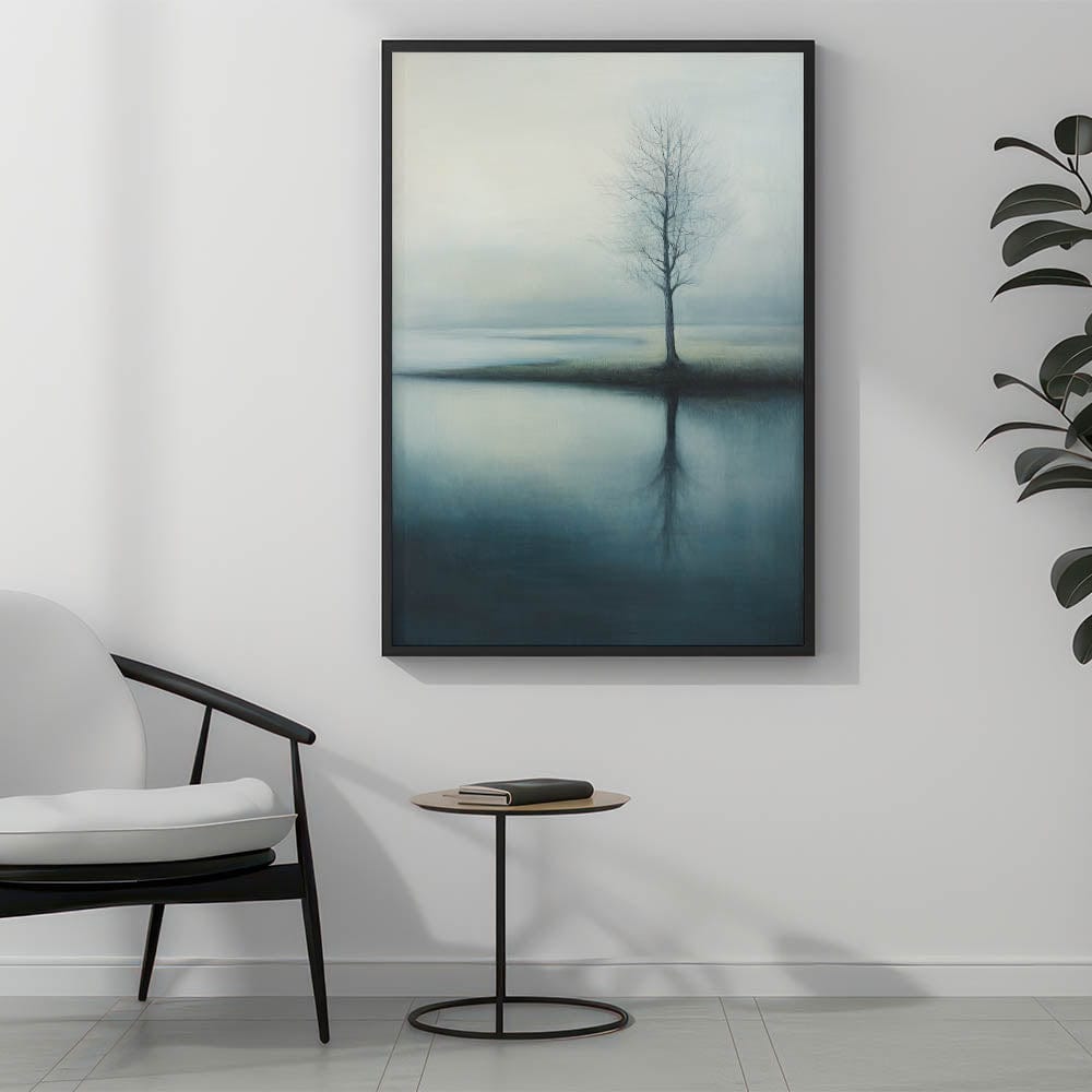 Immerse yourself in the serene beauty of this Tree Art Print, featuring a lone tree standing gracefully by a still body of water, its delicate reflection blending seamlessly into the misty atmosphere. The soft, muted tones of blue, gray, and white create a calming, dreamlike ambiance, making this Nature-Inspired Wall Art a perfect addition to contemporary, minimalist, and modern interiors.