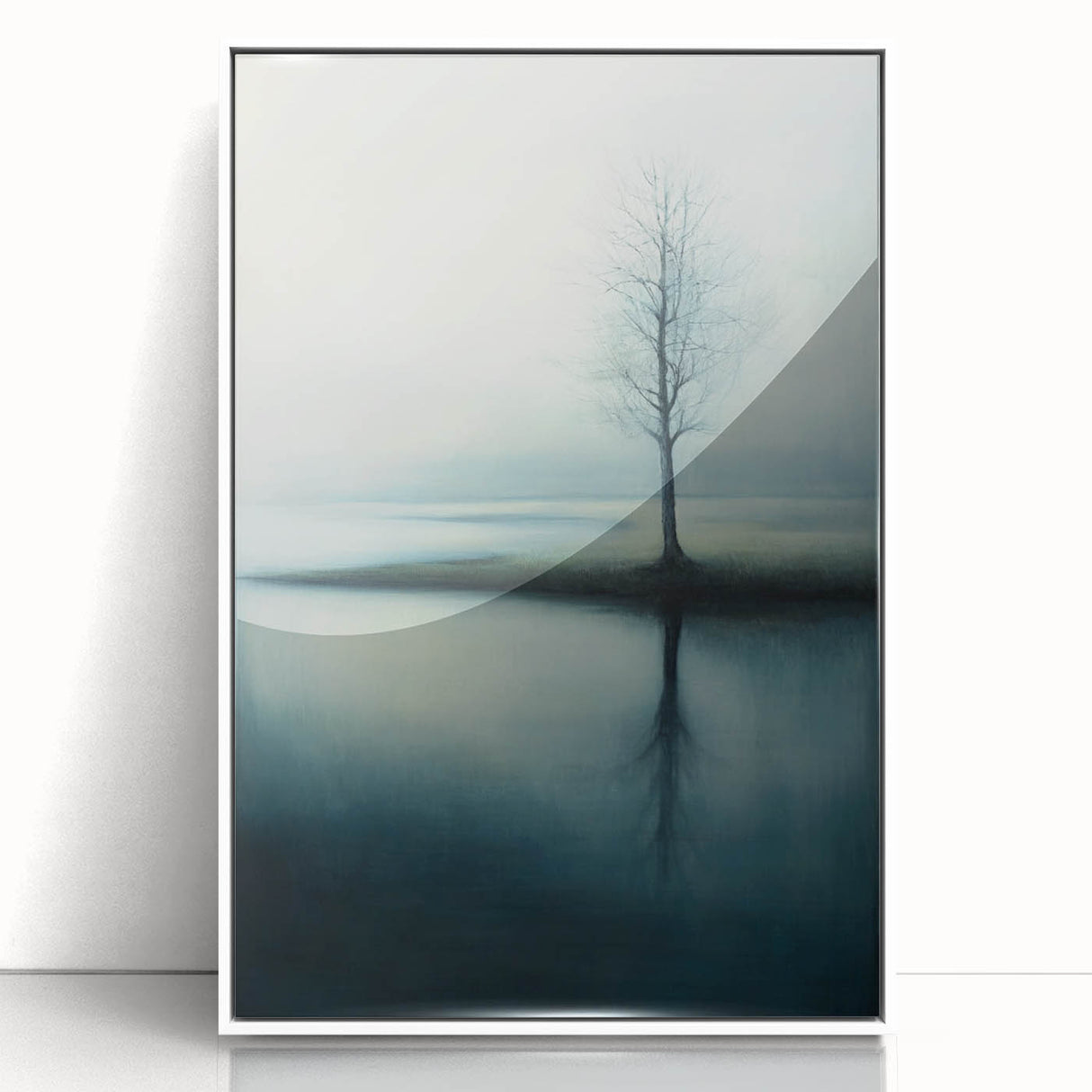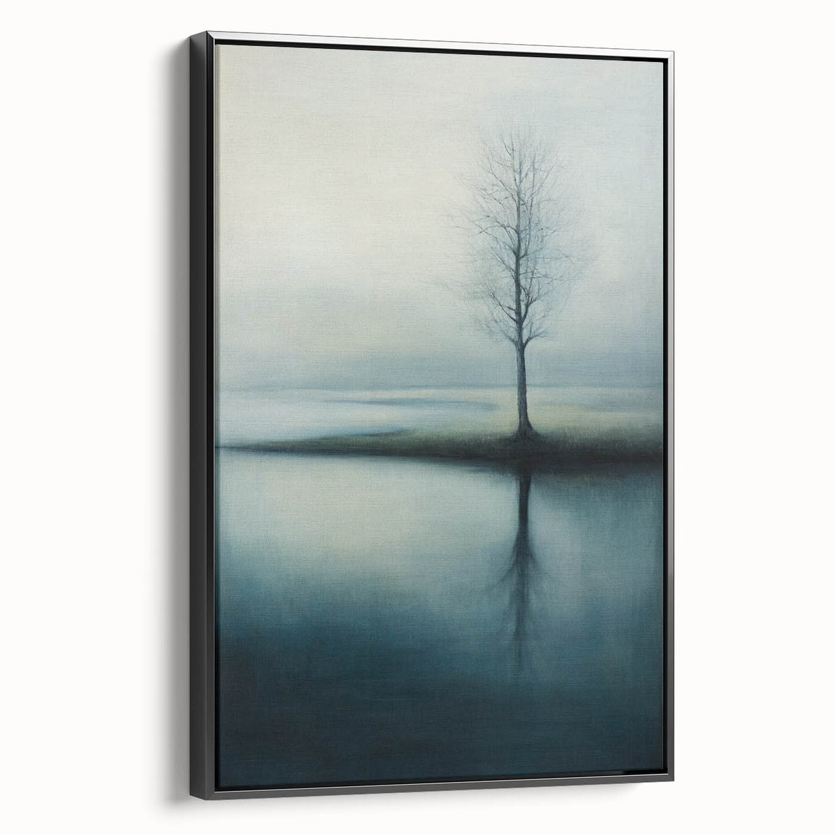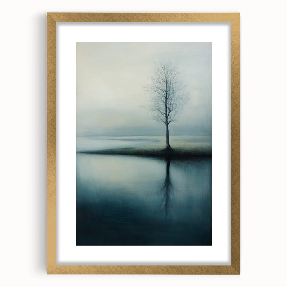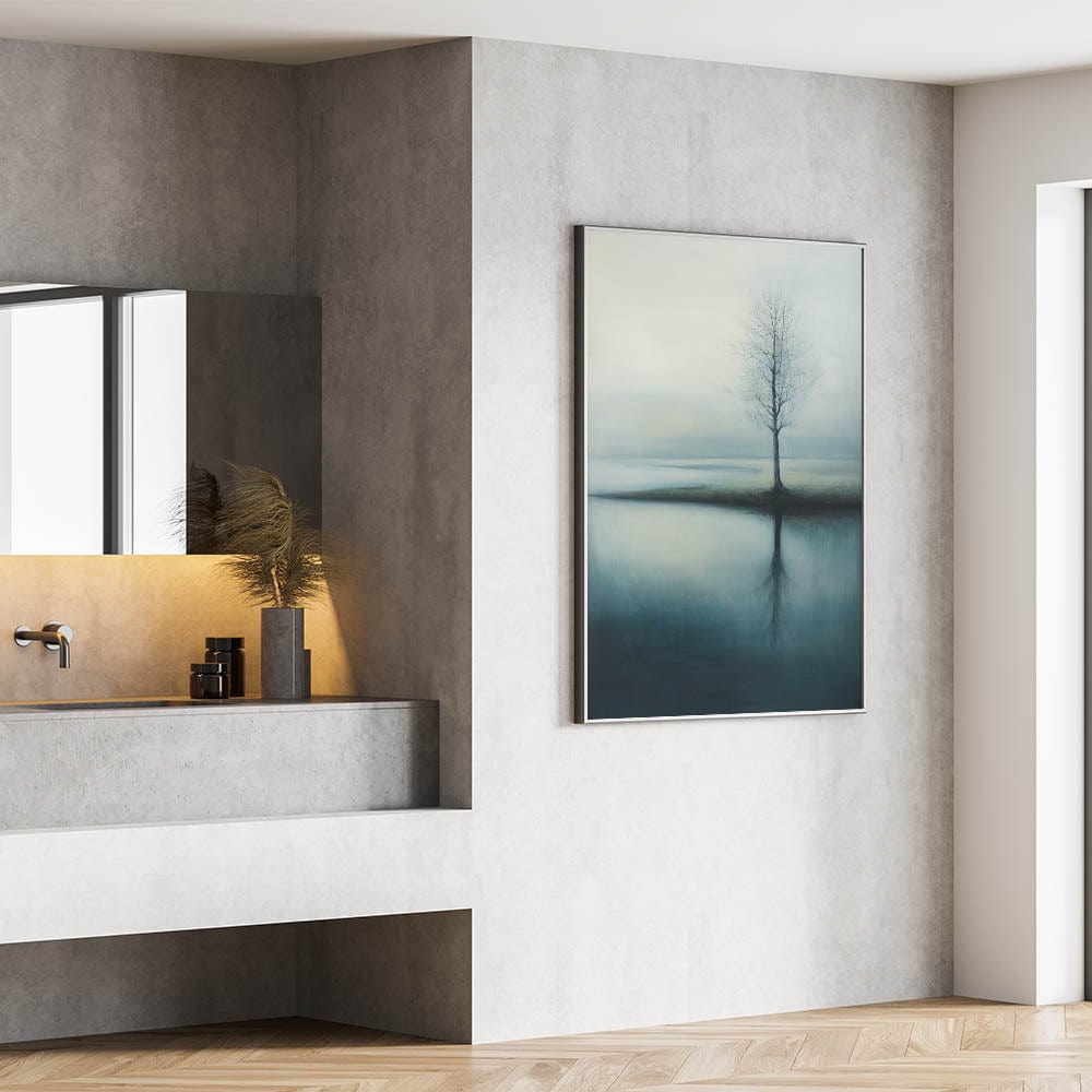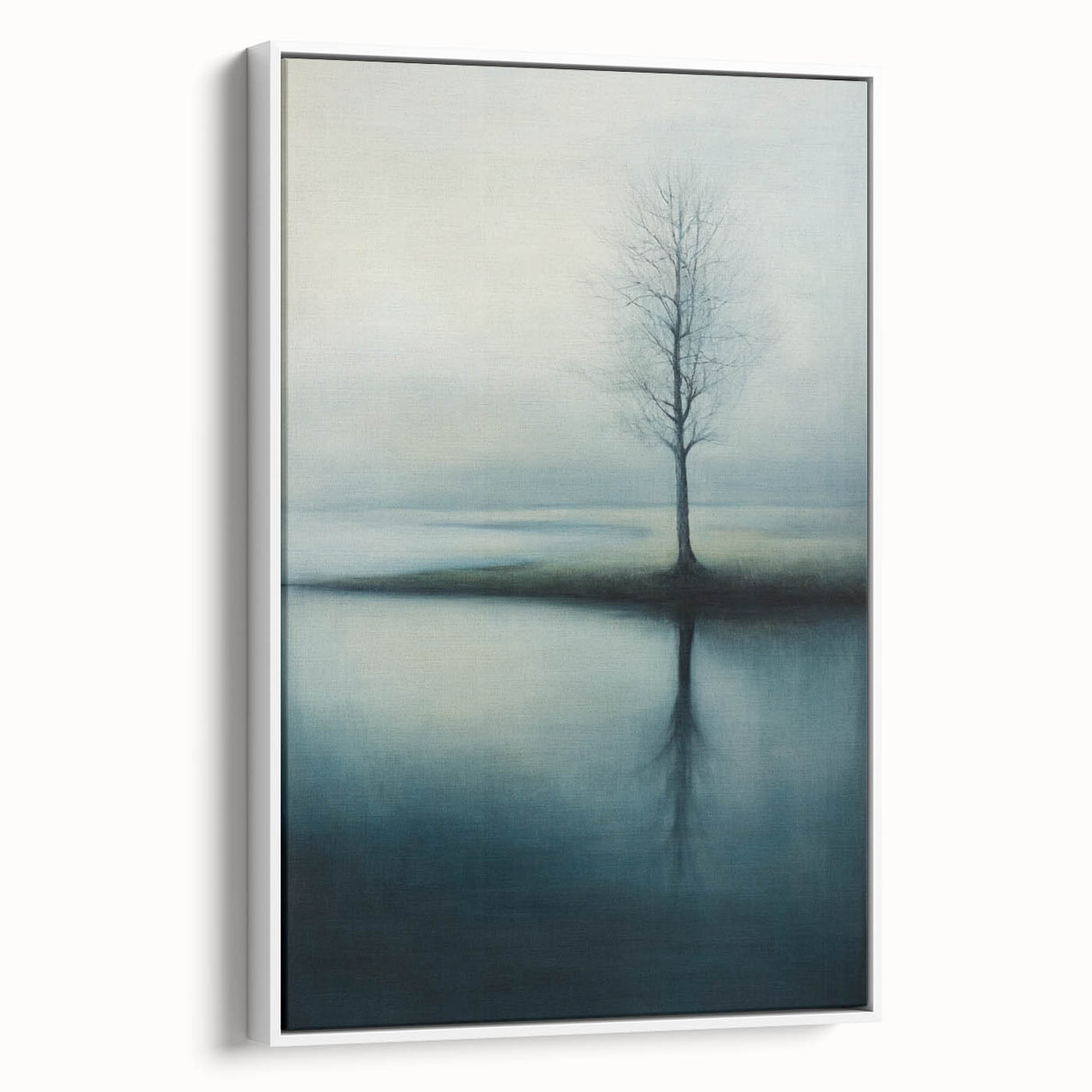 Immerse yourself in the serene beauty of this Tree Art Print, featuring a lone tree standing gracefully by a still body of water, its delicate reflection blending seamlessly into the misty atmosphere. The soft, muted tones of blue, gray, and white create a calming, dreamlike ambiance, making this Nature-Inspired Wall Art a perfect addition to contemporary, minimalist, and modern interiors.