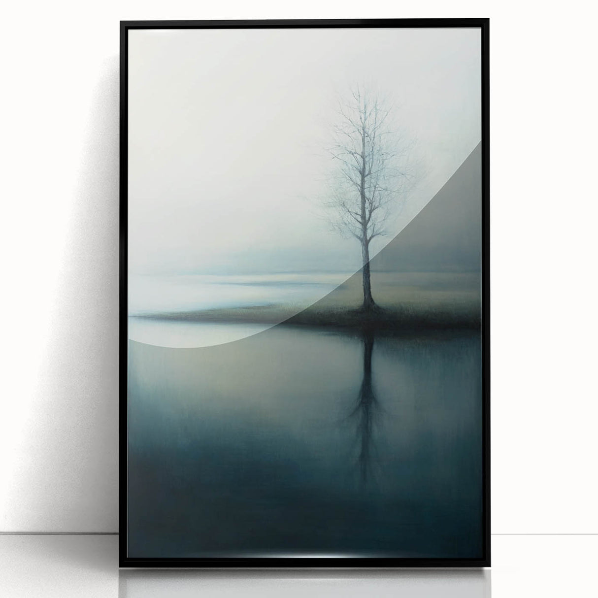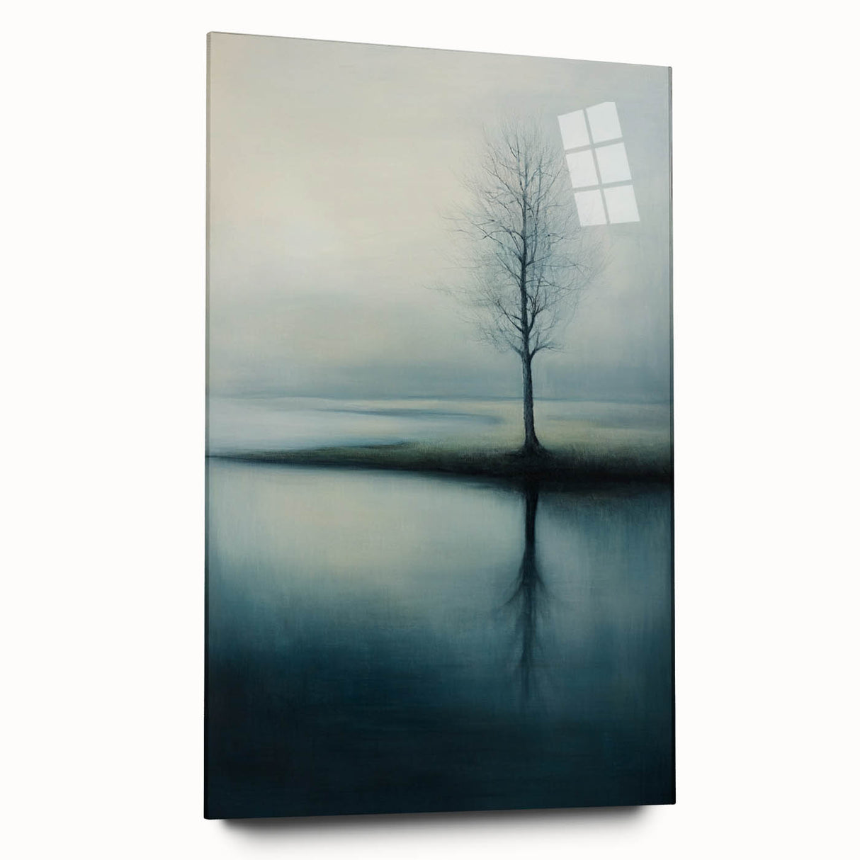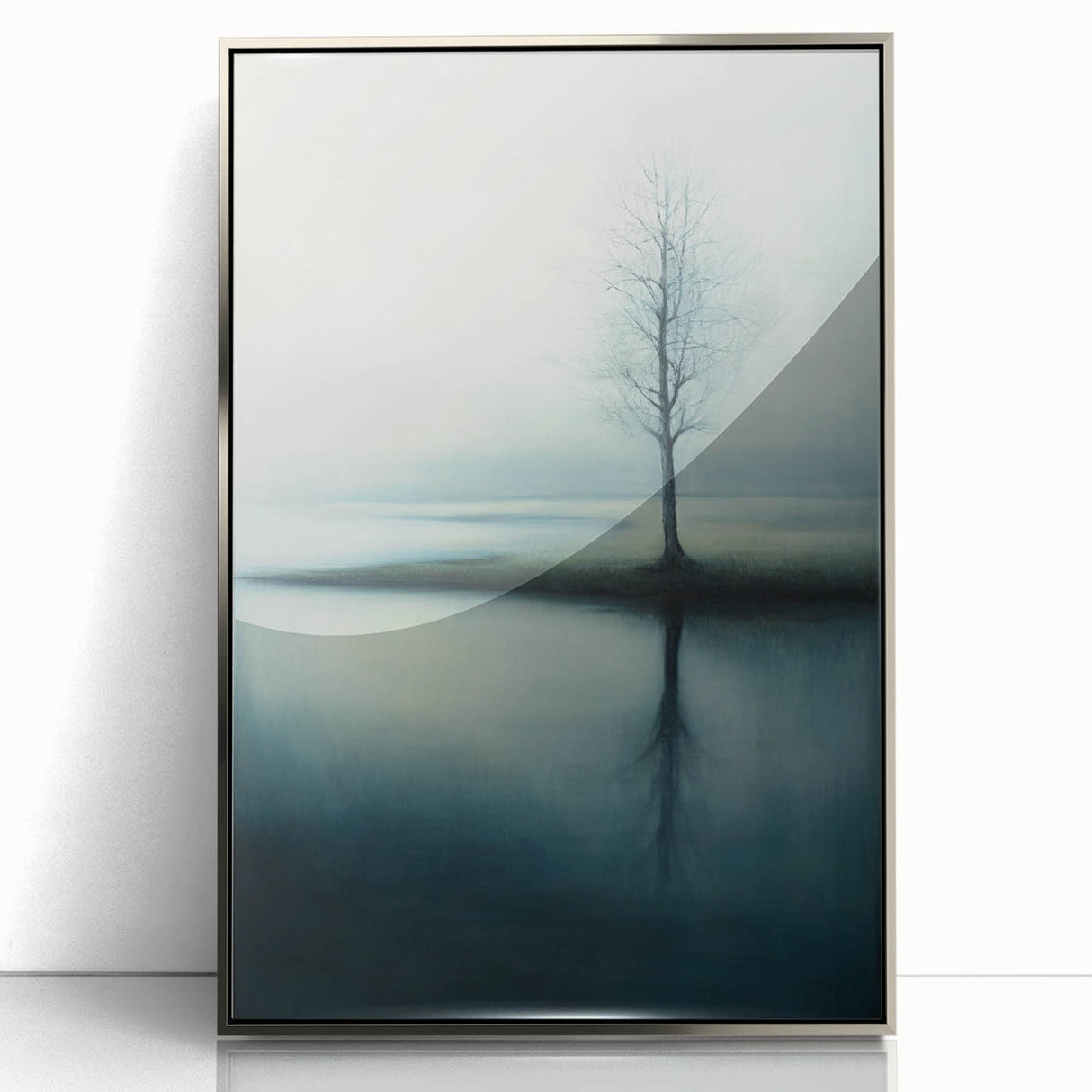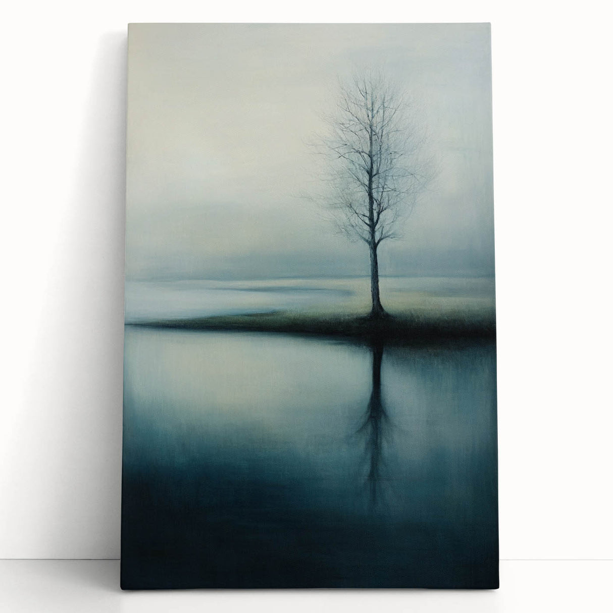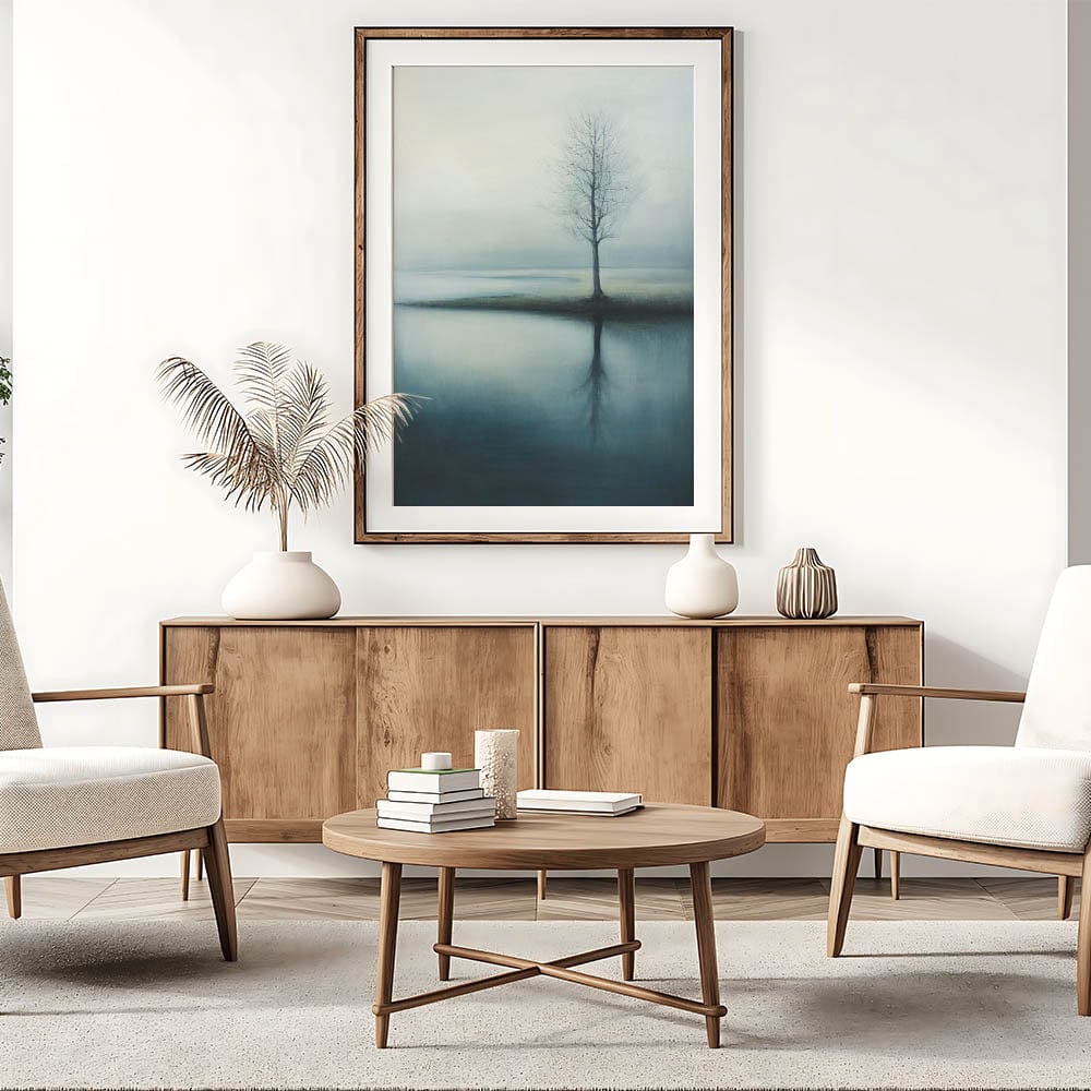 Immerse yourself in the serene beauty of this Tree Art Print, featuring a lone tree standing gracefully by a still body of water, its delicate reflection blending seamlessly into the misty atmosphere. The soft, muted tones of blue, gray, and white create a calming, dreamlike ambiance, making this Nature-Inspired Wall Art a perfect addition to contemporary, minimalist, and modern interiors.