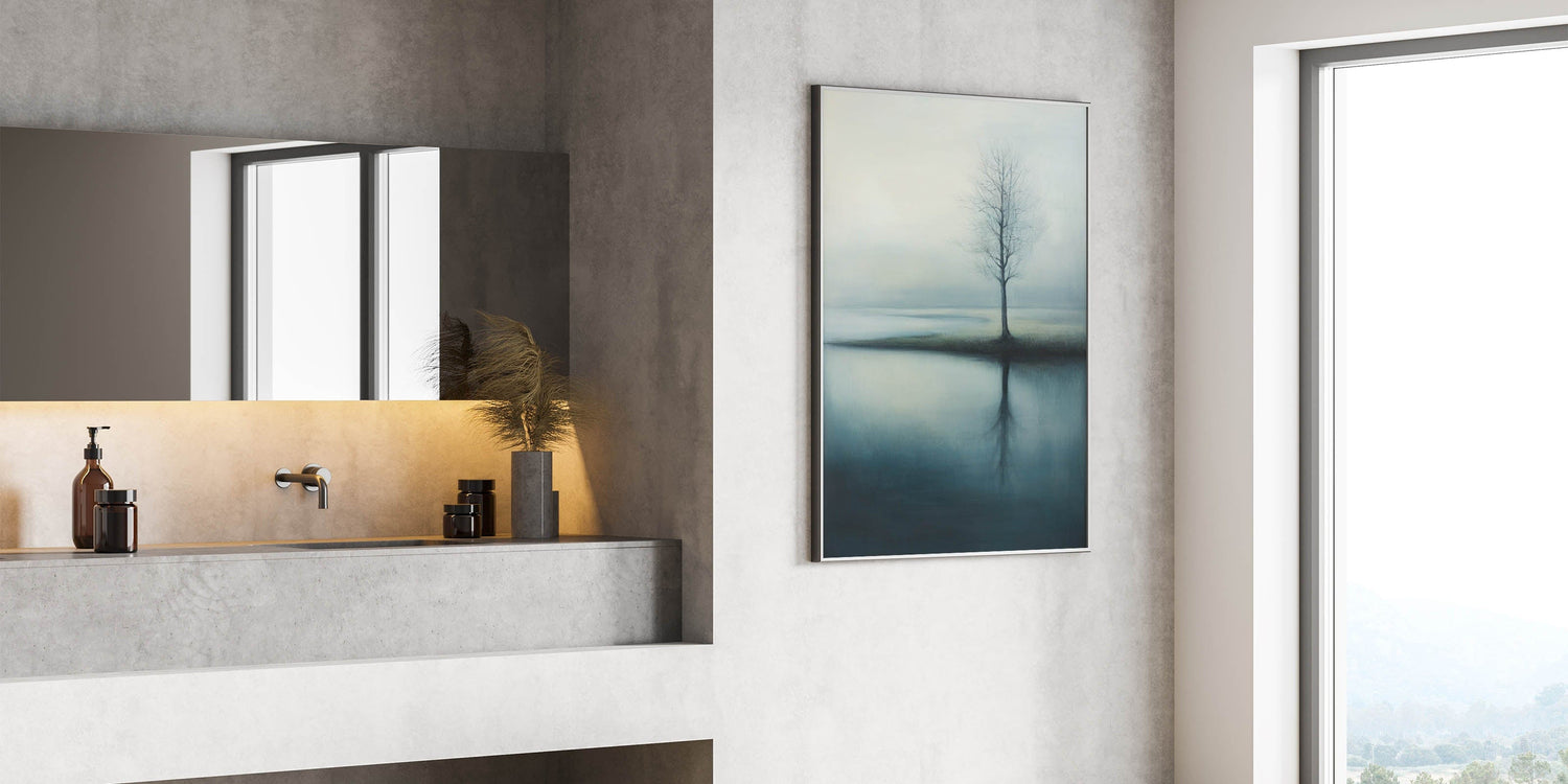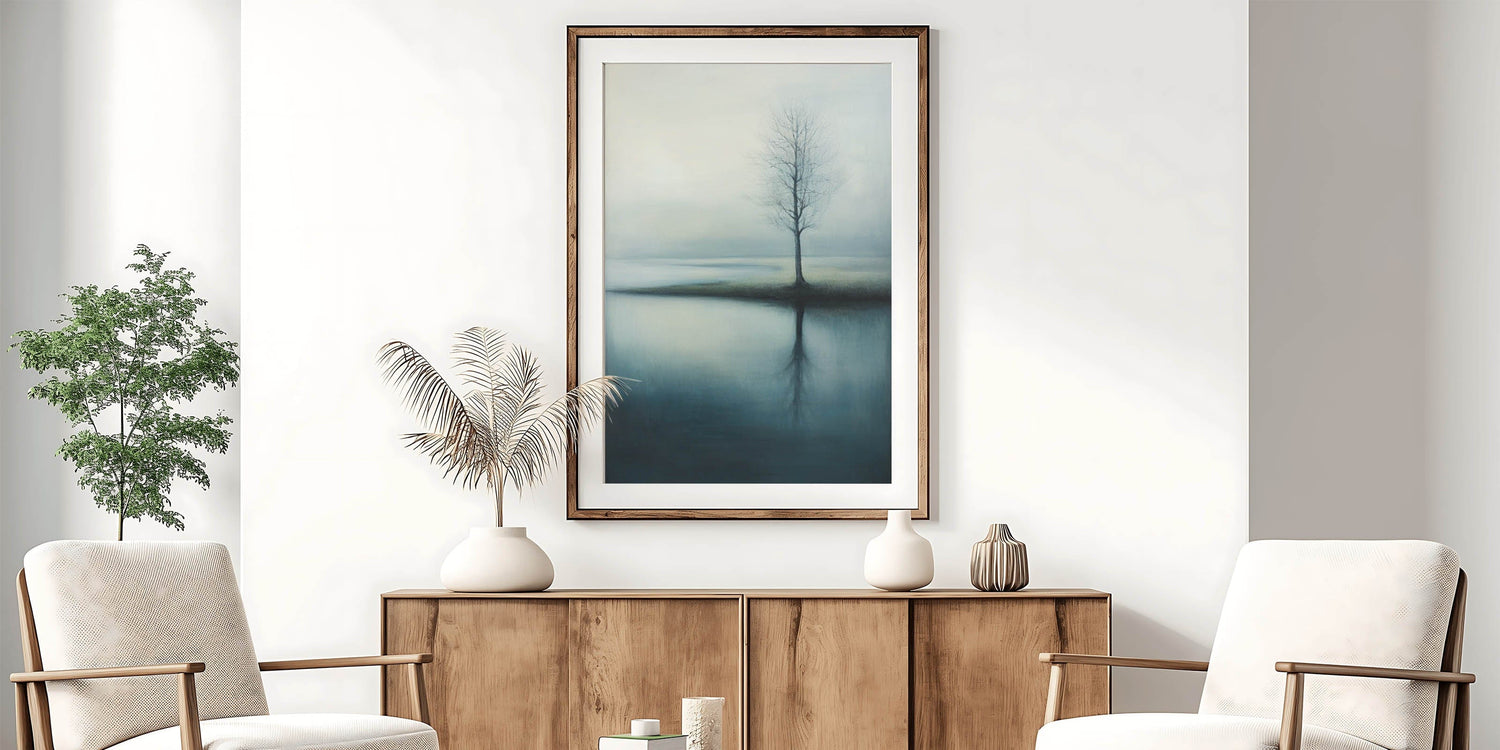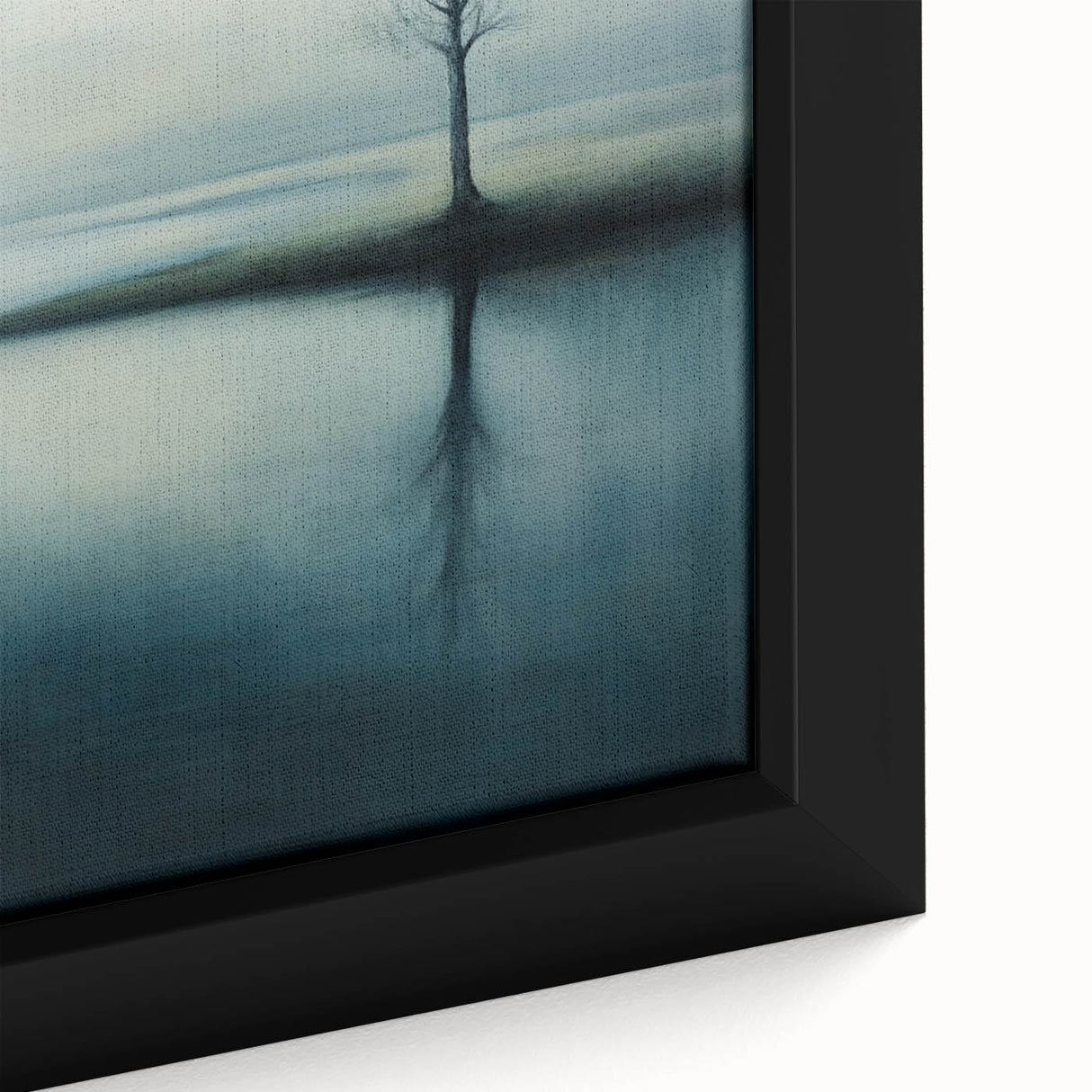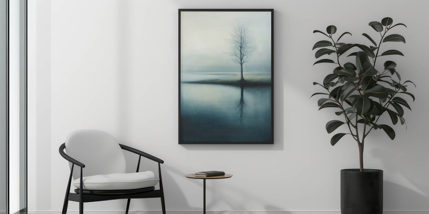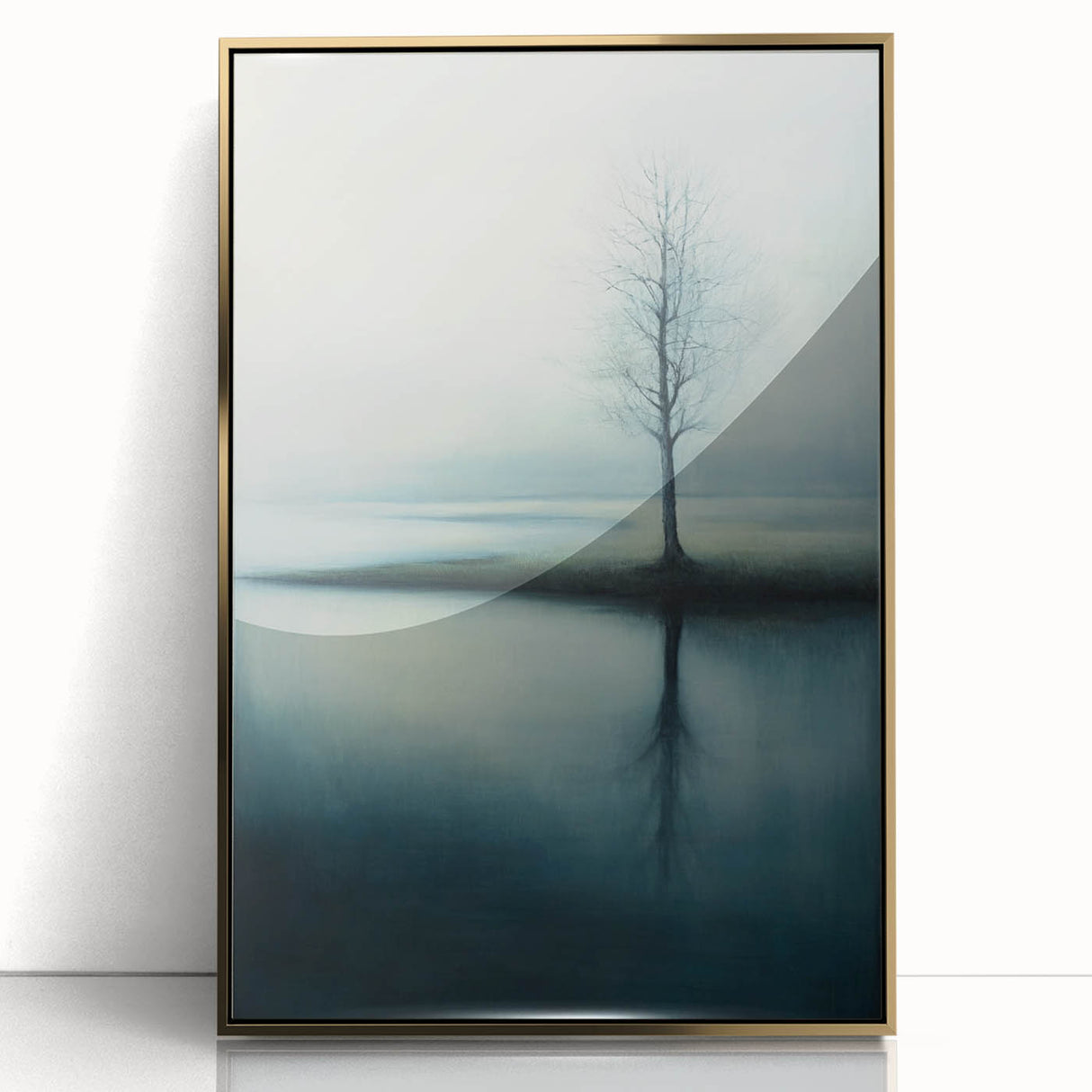 Immerse yourself in the serene beauty of this Tree Art Print, featuring a lone tree standing gracefully by a still body of water, its delicate reflection blending seamlessly into the misty atmosphere. The soft, muted tones of blue, gray, and white create a calming, dreamlike ambiance, making this Nature-Inspired Wall Art a perfect addition to contemporary, minimalist, and modern interiors.